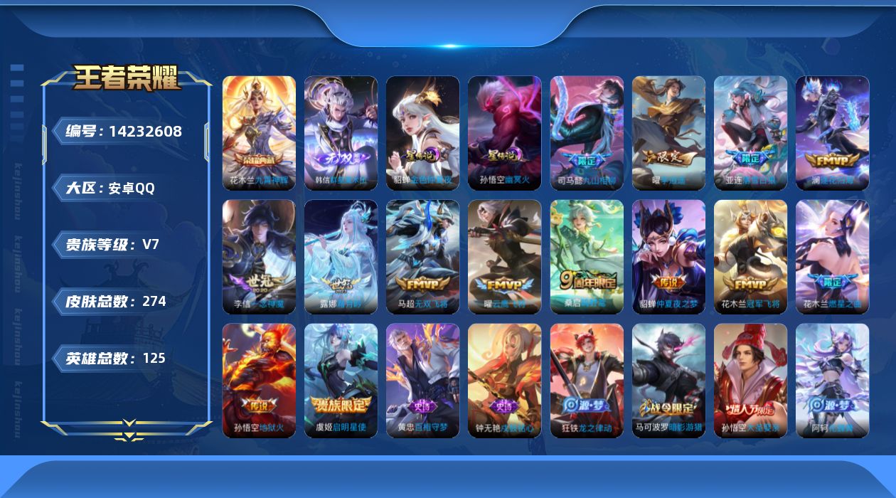 [14232608]【店主推荐捡漏号!可直接换绑】安卓q-v7-永恒钻石i段位-125英雄-274皮肤-1典藏皮肤-1无双-14传说-77史诗-2星元 【英雄全皮】:司马懿全皮,刘邦全皮,花木兰全皮,鬼谷子全皮,蒙恬全皮,戈娅全皮,影全皮 【荣耀典藏】:花木兰九霄神辉 【无双皮肤】:韩信群星魔术团 【传说皮肤】:司马懿九山相柳,桑启鸣野蒿,亚连落雪白狼,澜逐花归海,露娜霜月吟,花木兰燃星之曲,马超无双飞将,曜李 ,虞姬启明星使,曜云鹰飞将,李信一念神魔,花木兰冠军飞将,貂蝉仲夏夜之梦,孙悟空地狱火 【限定皮肤】:姜子牙天穹之誓,狄仁杰阴阳师,赵云皇家上将,赵云百木心呛,孙尚香蔷薇恋人,庄周高山流水,高渐离死亡摇滚,阿轲迷踪丽影,钟无艳超时空战士,扁鹊奇幻香踪,白起夜都怪侠,周瑜赤莲之焰,元歌无心,甄姬游园惊梦,甄姬落雪兰心,马可波罗暗影游猎,狄仁杰魔术师,达摩沙漠行僧,项羽海滩派对,老夫子醍醐杖,刘邦夺宝奇兵,韩信傲雪梅呛,王昭君午后时光,兰陵王金庭之子,花木兰青春决赛季,花木兰瑞麟志,花木兰默契交锋,花木兰燃星之曲,孙悟空大圣娶亲,李元芳银河之约,李元芳云中旅人,虞姬启明星使,钟馗驱傩正仪,杨戬潮玩骑兵,雅典娜黎明之约,蔡文姬繁星吟游,太乙真人华丽摇滚,鬼谷子原初探秘者,鬼谷子五谷丰年,苏烈千军破阵,百里玄策原初追逐者,弈星混沌棋,梦奇顽趣,沈梦溪大漠名商,沈梦溪匿光破解者,明世隐疑决卦,明世隐吟游魔法,裴擒虎天狼狩猎者,裴擒虎李小龙,裴擒虎擒涛扼浪,狂铁电玩高手,云中君纤云弄巧,上官婉儿神器万象笔,嫦娥暖冬兔眠,曜李 ,西施玲珑珍味,鲁班大师探海日志,桑启海盐诗旅,暃星界游侠,戈娅驭风魔法,阿古朵江河有灵,张良古海寻踪,蒙恬荣光圣徽,鬼谷子天穹祈灯,姬小满妄想食味,亚连落雪白狼,沈梦溪龙舞盛年,刘邦剑破天穹,程咬金群星魔术团,韩信群星魔术团,周瑜熔金海岸 【年限皮肤】:花木兰瑞麟志 【赛季限定】:达摩沙漠行僧,老夫子醍醐杖,兰陵王金庭之子,张良古海寻踪,李元芳云中旅人,钟馗驱傩正仪,雅典娜黎明之约,鬼谷子原初探秘者,苏烈千军破阵,百里玄策原初追逐者,弈星混沌棋,梦奇顽趣,沈梦溪大漠名商,明世隐疑决卦,裴擒虎擒涛扼浪,鲁班大师探海日志,桑启海盐诗旅,鬼谷子天穹祈灯,蒙恬荣光圣徽,刘邦剑破天穹,姜子牙天穹之誓 【战令限定】:阿轲迷踪丽影,钟无艳超时空战士,扁鹊奇幻香踪,白起夜