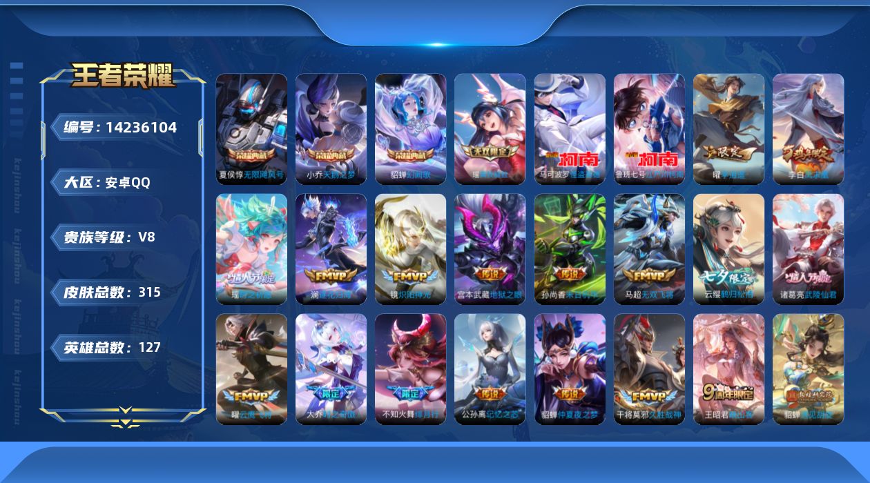 [14236104]电音狂想天幕 贵族8-315皮3典藏32传说1无双2珍品传说 安卓手q173区315皮3典藏32传说1无双2珍品传说v8 营地id352305036至尊星耀v【珍品传说皮肤】:江户川柯南怪盗基德【无双皮肤】:瑶真我赫兹【荣耀典藏】:无限飓风号幻阙歌天鹅之梦【优质限定皮肤】:无双飞将瑶时之祈愿凤求凰【传说皮肤】:神树通天映山客逐花归海影龙天霄时之奇