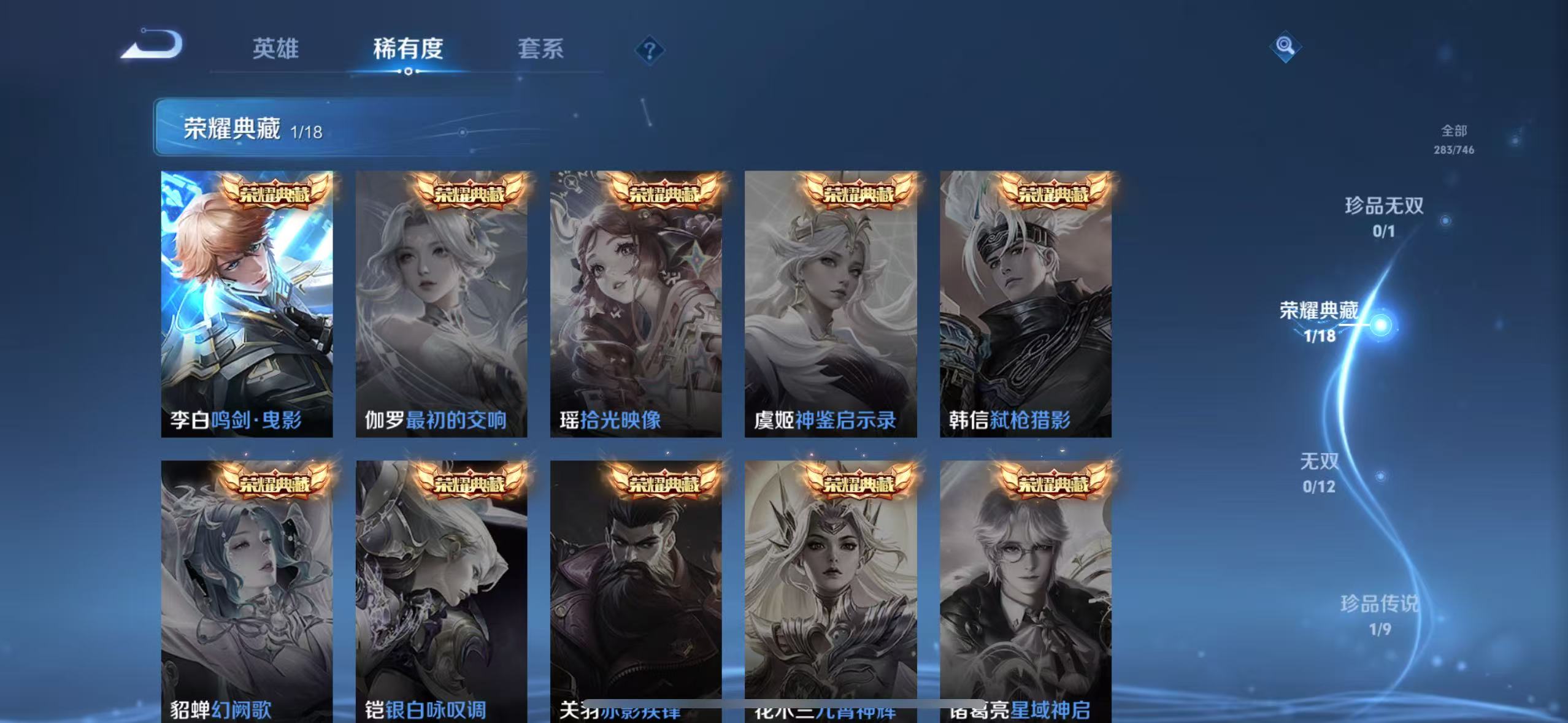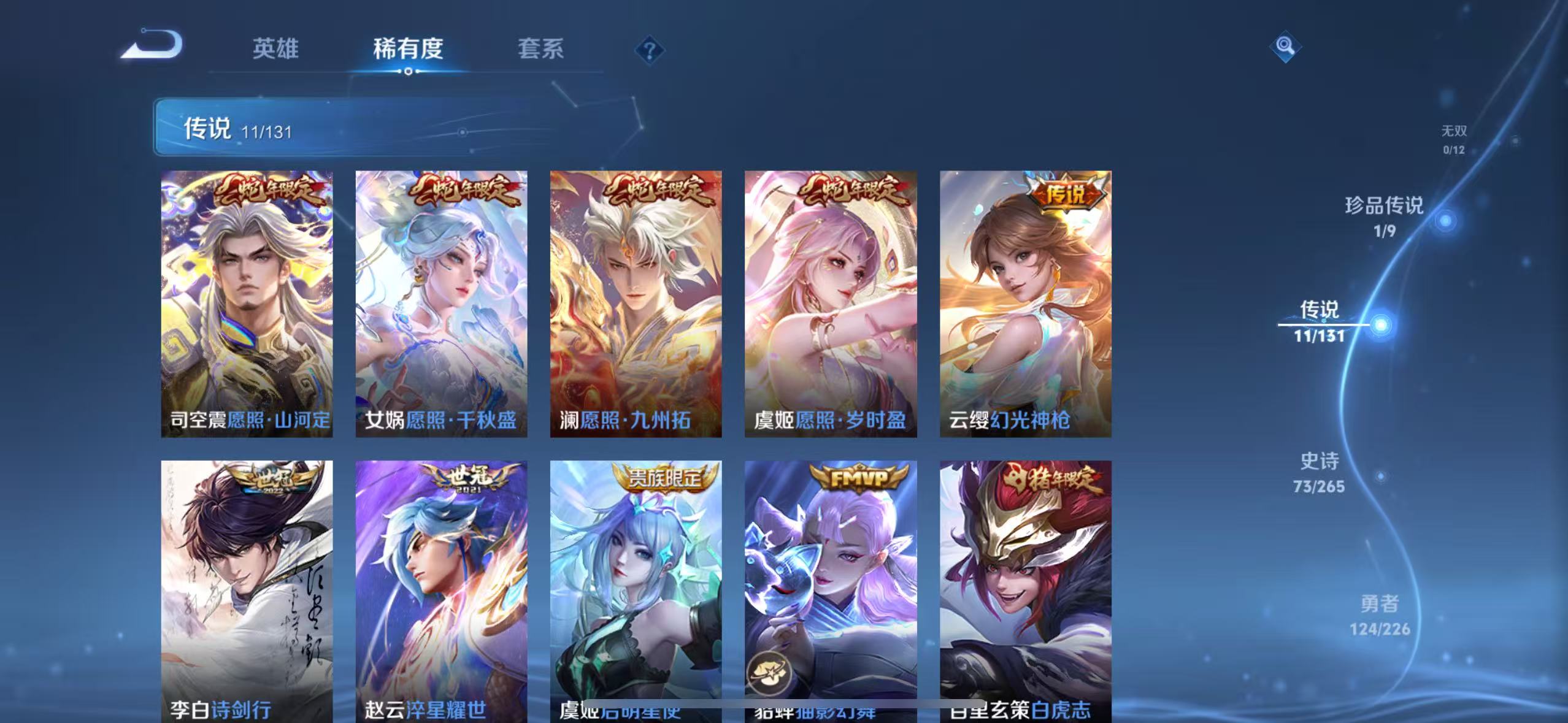txwz22643-v8-283皮肤 1典藏鸣剑·曳影 1珍品时之奇旅 11传说 启明星使,愿照·岁时盈,愿照·山河定,幻光神呛,愿照·九州拓,愿照·千秋盛,淬星耀世,诗剑行,猫影幻舞,白虎志,超时空战士 73史诗