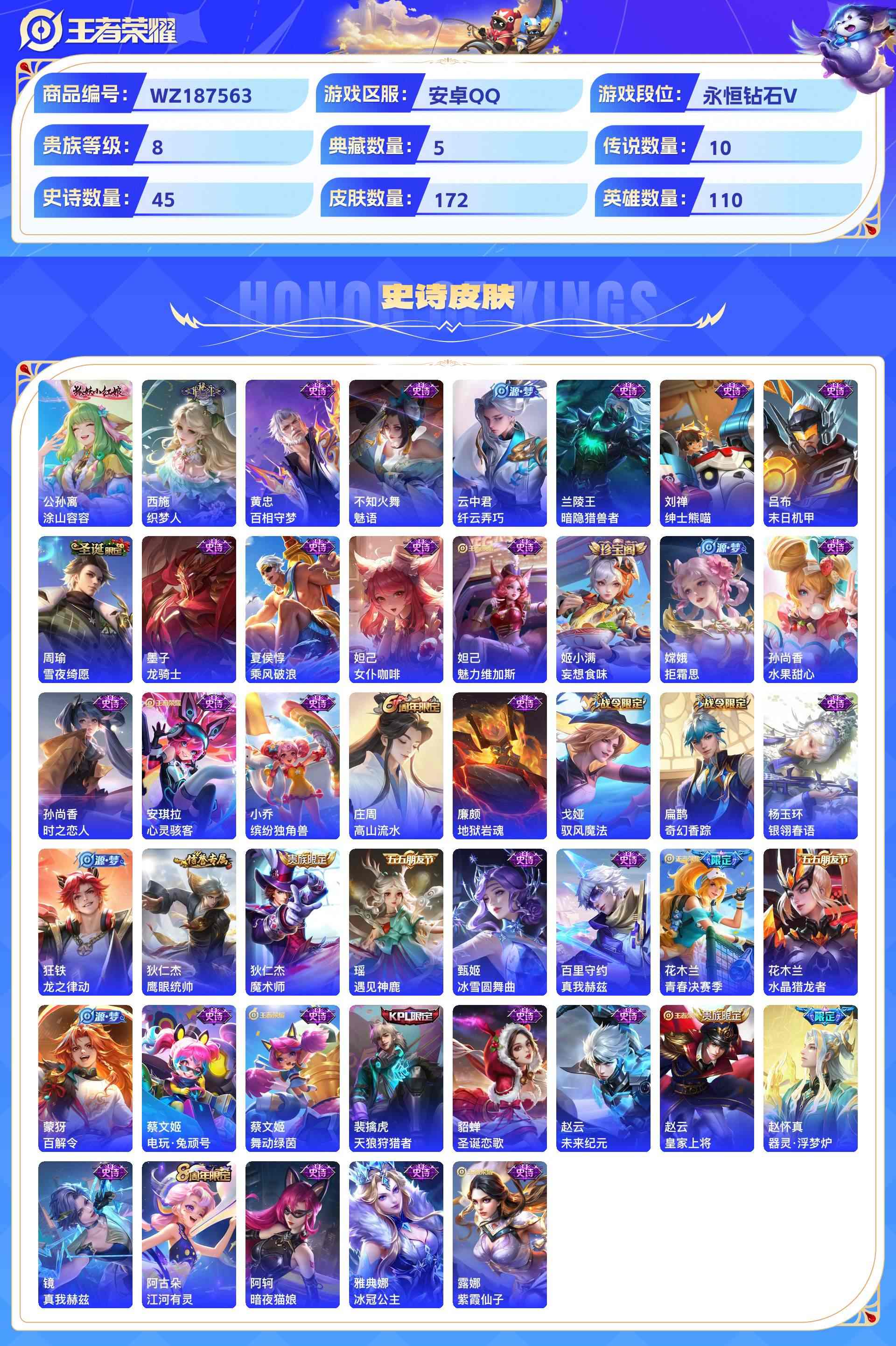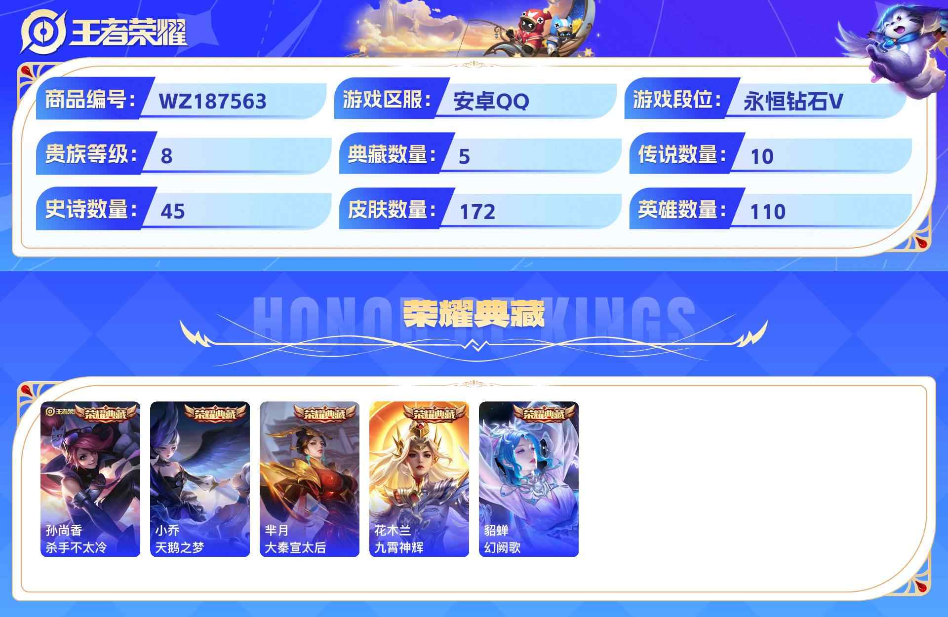 wz187563|精品号可二次【荣耀典藏】杀手不太冷天鹅之梦大秦宣太后九霄神辉幻阙歌【无双限定】真我赫兹【传说皮肤】幻光神呛黄金天蝎座末日机甲鸣野蒿时之祈愿启明星使仲夏夜之梦曦玄引炽阳神光霜月吟安卓qq 贵族8级 172皮 5典藏 1无双 10传说 45史诗2星传说21个性按键