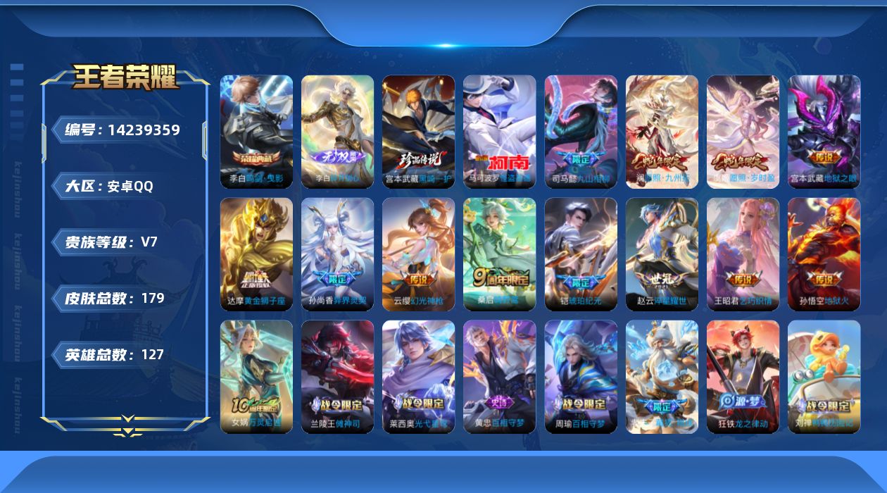 [14239359]可二次 贵族7-179皮-1典藏-13传说-1无双-2珍品传说-全皮1 安卓手q299区179皮1典藏13传说1无双2珍品传说v7 营地id1839389880无双王者【珍品传说皮肤】:黑崎一护怪盗基德【无双皮肤】:碎月剑心【荣耀典藏】:鸣剑·曳影【优质限定皮肤】:至尊宝【传说皮肤】:神树通天地狱之眼琥珀纪元九山相柳乞巧织情地狱火愿照·岁时盈愿照·九州拓幻光