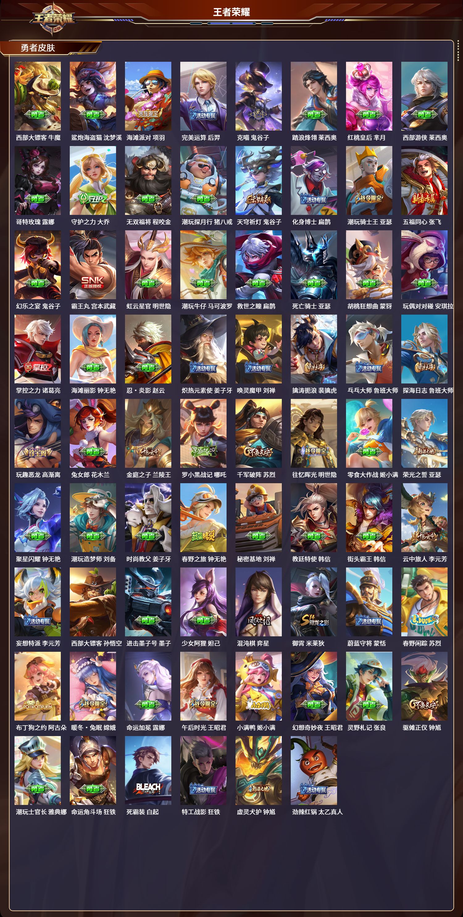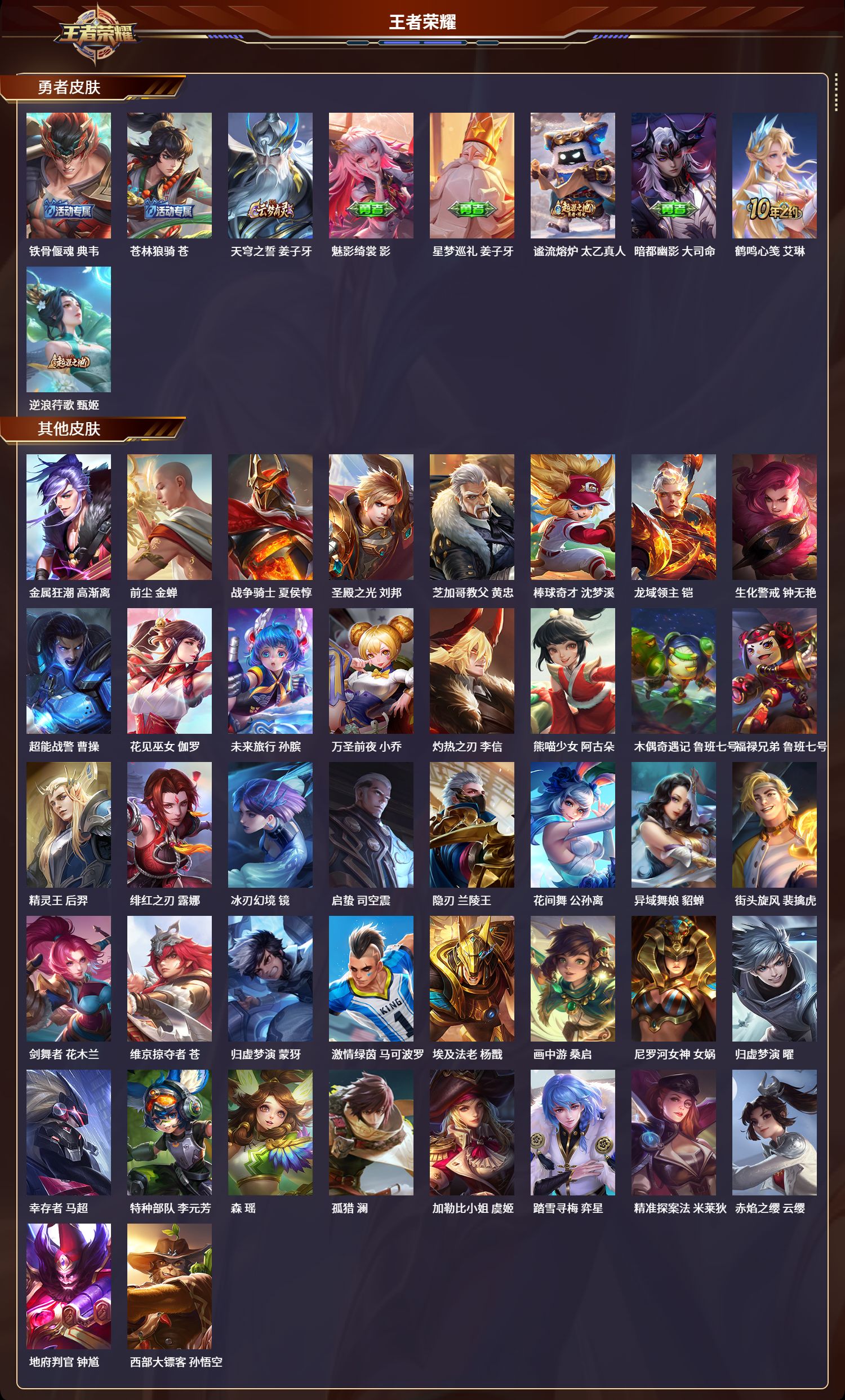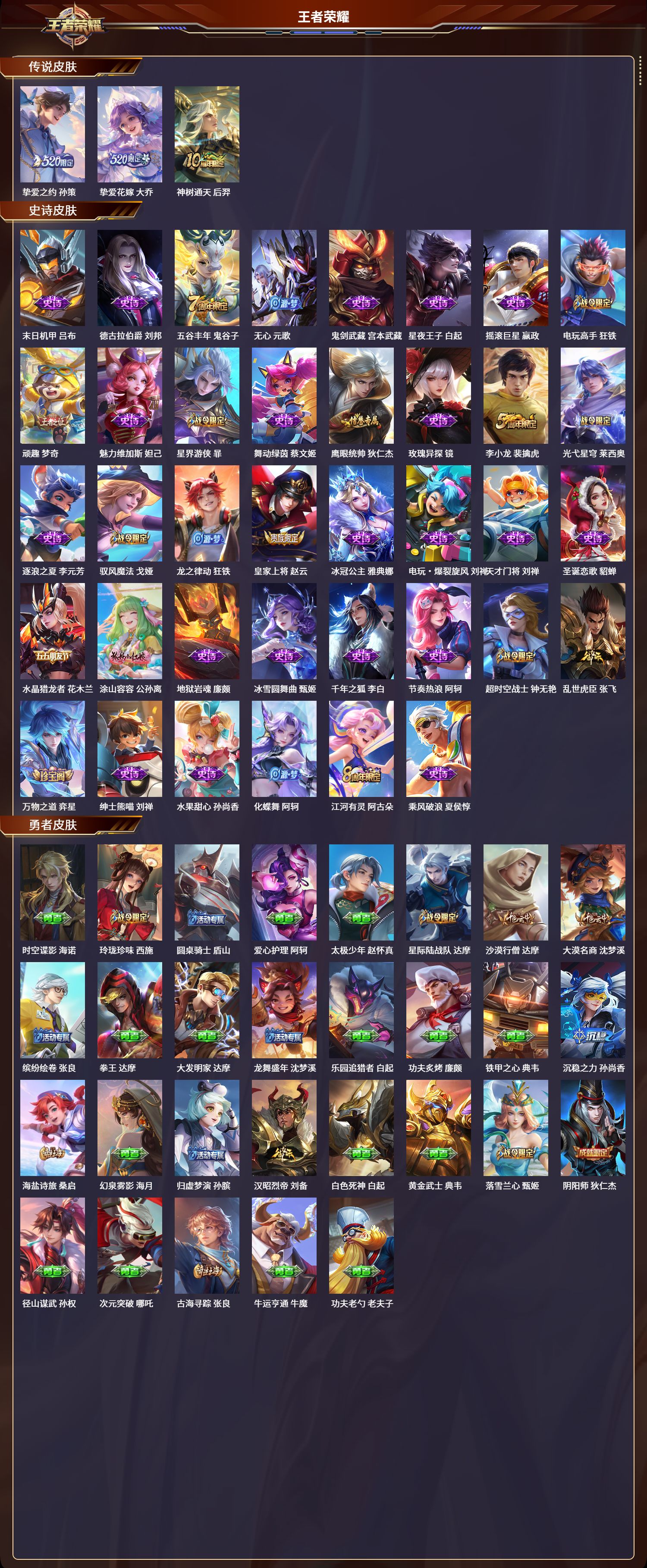 安卓qq/最强王者/190皮肤/126英雄/0典藏/0珍品无双/0无双/0珍品传说/3传说/38史诗/8稀有英雄【3 传说皮肤】挚爱之约 孙策挚爱花嫁 大乔神树通天 后羿【38 史诗皮肤】末日机甲 吕布德古拉伯爵 刘邦五谷丰年 鬼谷子无心 元歌鬼剑武藏 宫本武藏星夜王子 白起摇滚巨星 嬴政电玩高手 狂铁顽趣 梦奇魅力维加斯 妲己星界游侠 暃舞动绿茵