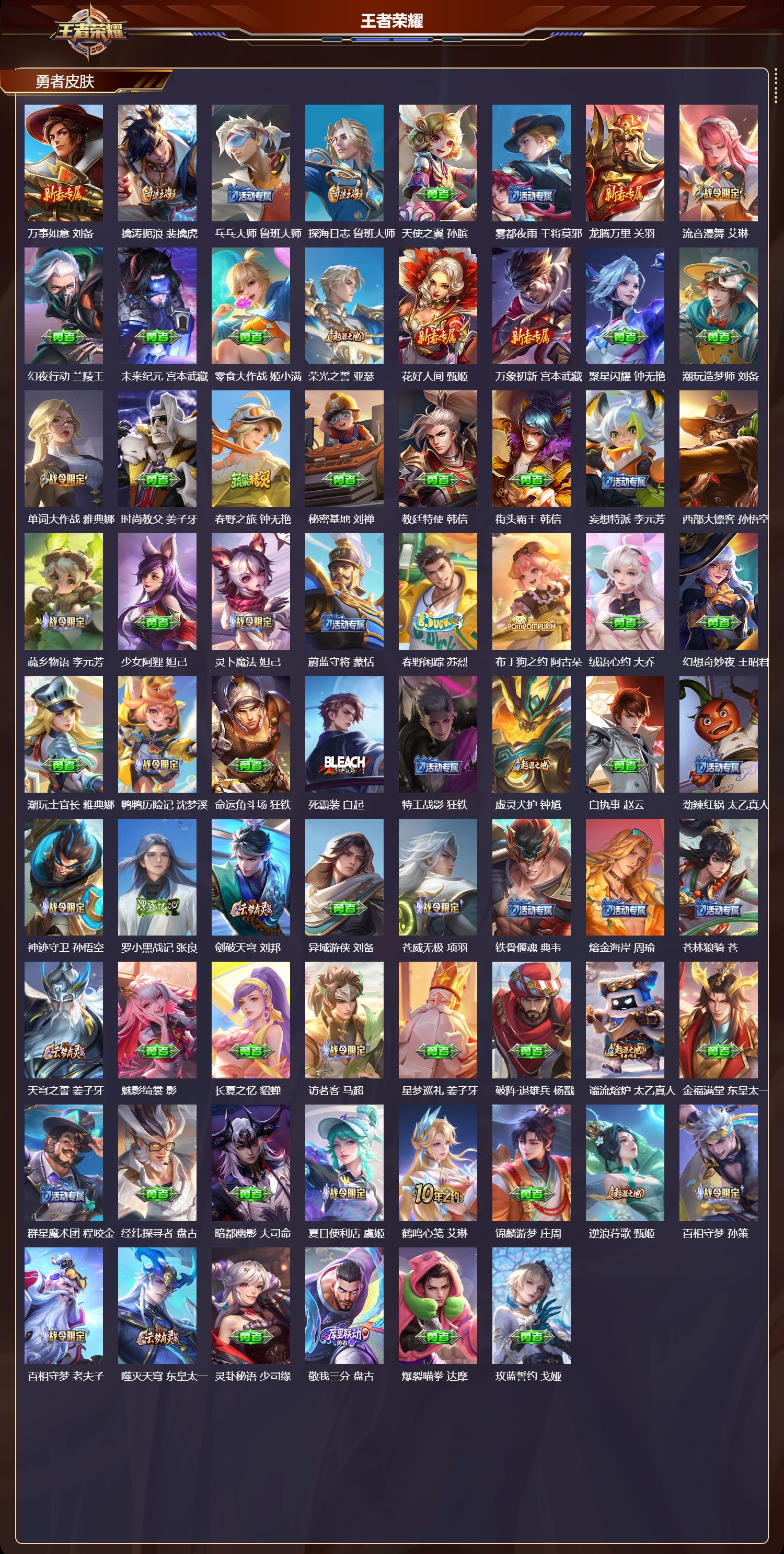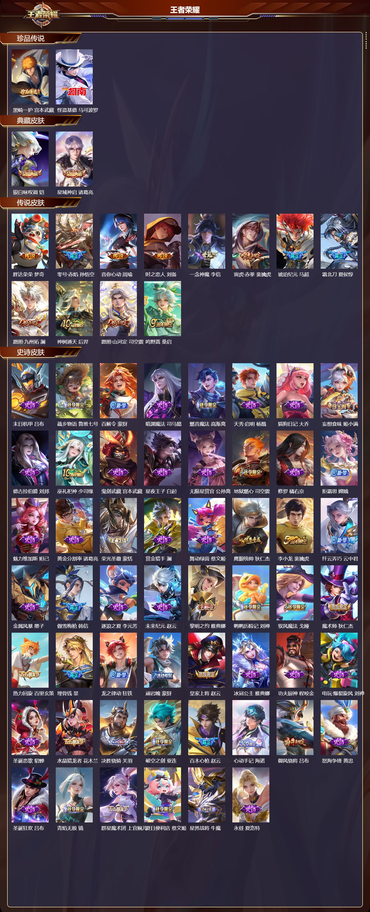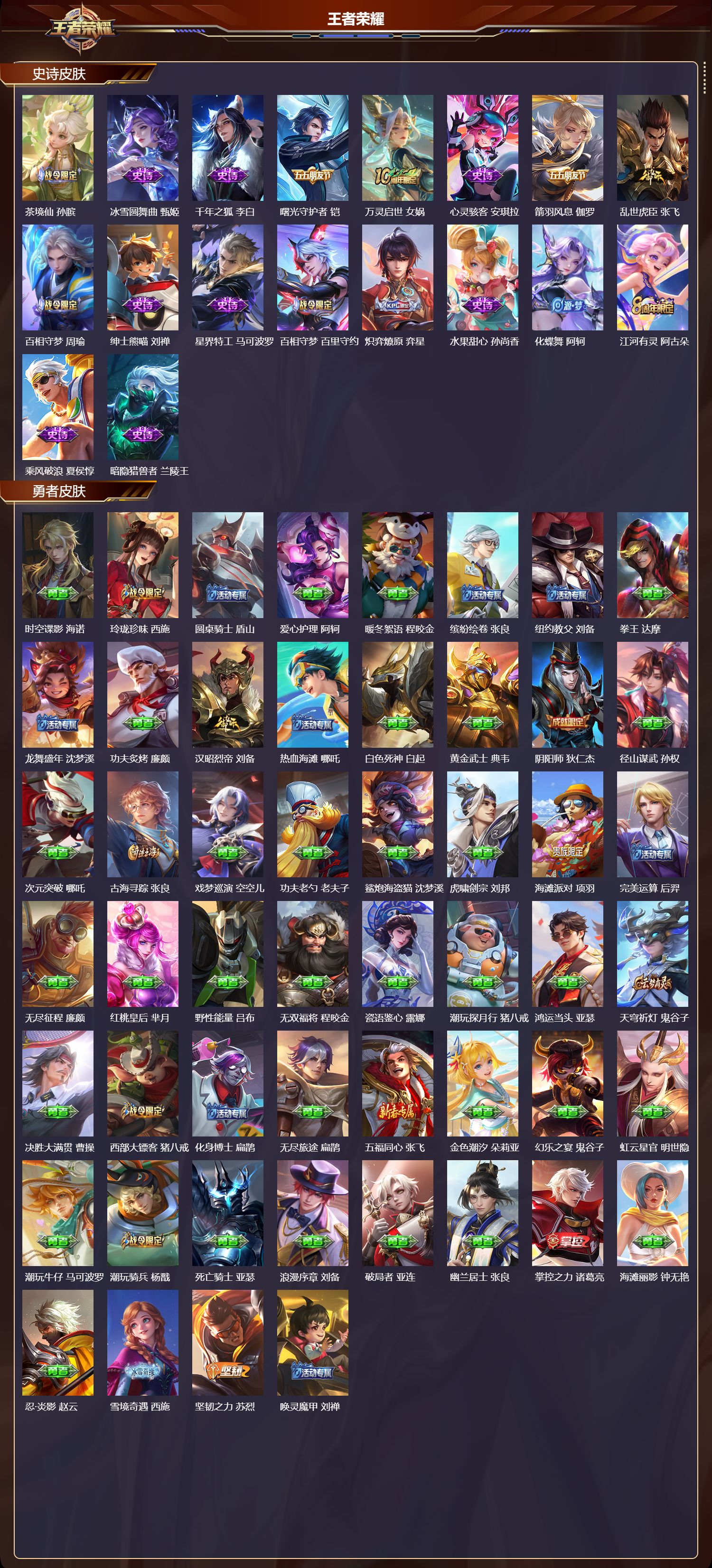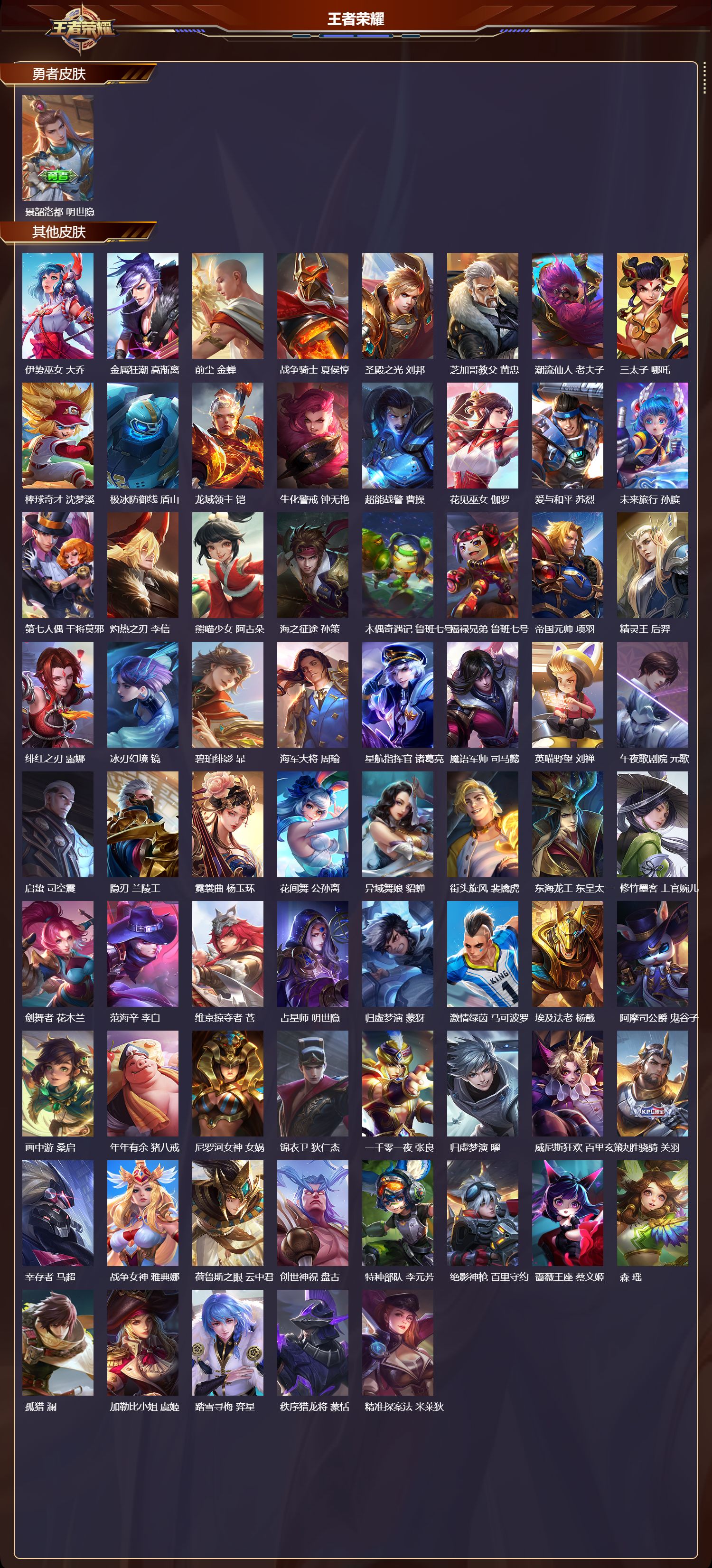 2280980-q/绝世王者/286皮肤/126英雄/2典藏/0珍品无双/0无双/2珍品传说/12传说/72史诗/8稀有英雄 【2 珍品传说】黑崎一护 宫本武藏怪盗基德 马可波罗 【2 典藏皮肤】银白咏叹调 铠星域神启 诸葛亮 【12 传说皮肤】胖达荣荣 梦奇零号·赤焰 孙悟空音你心动 周瑜时之恋人 刘备一念神魔 李信寅虎·赤拳 裴擒虎琥珀纪元 马超霜北刀 夏侯惇愿照