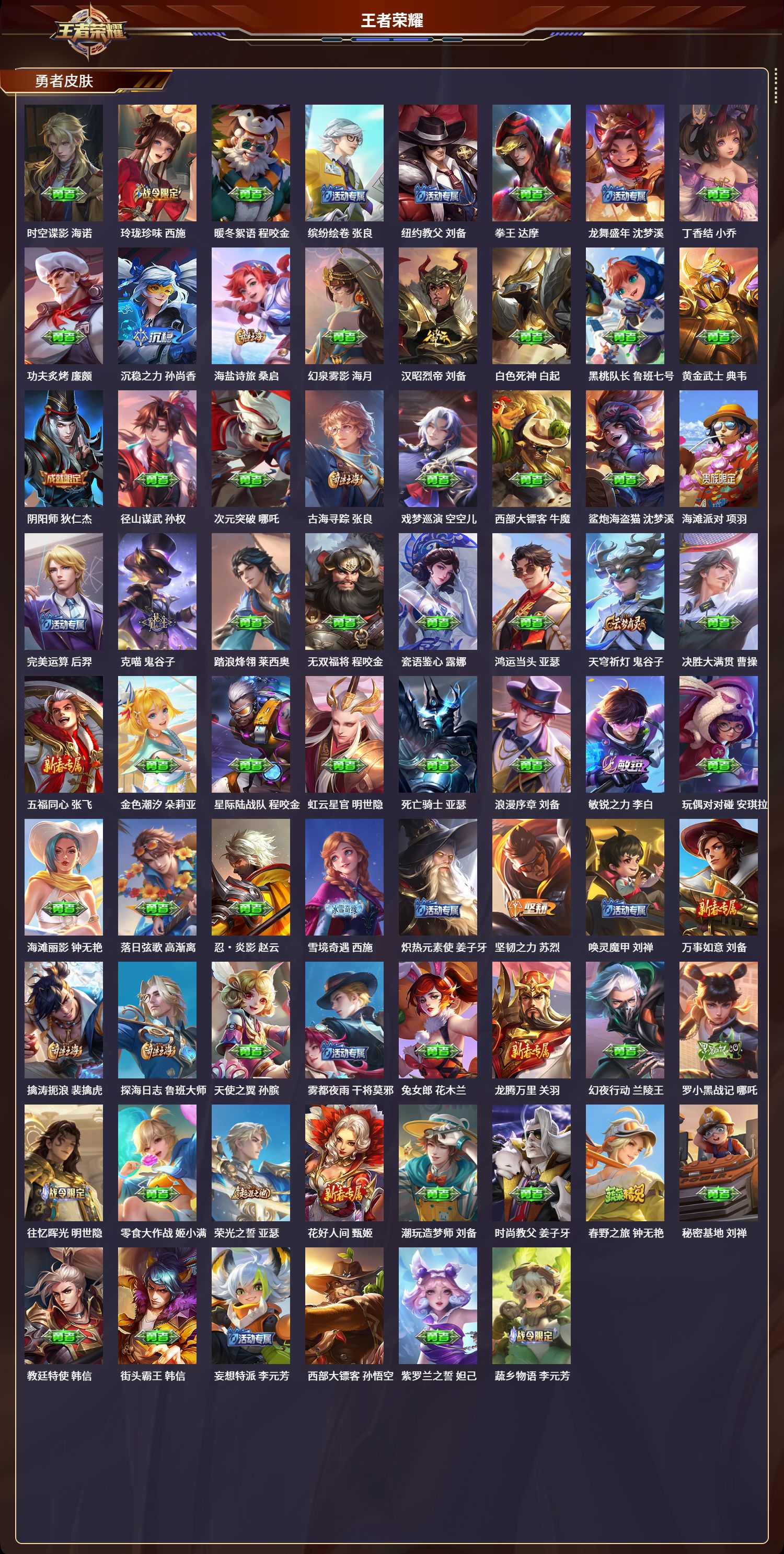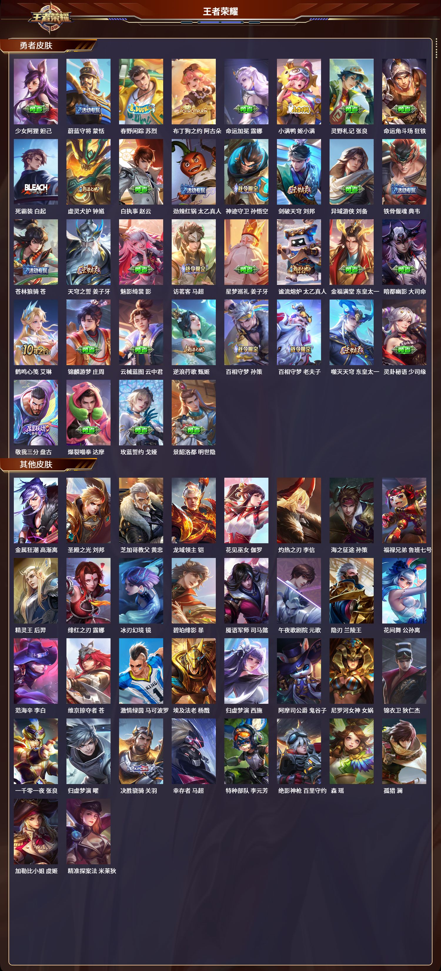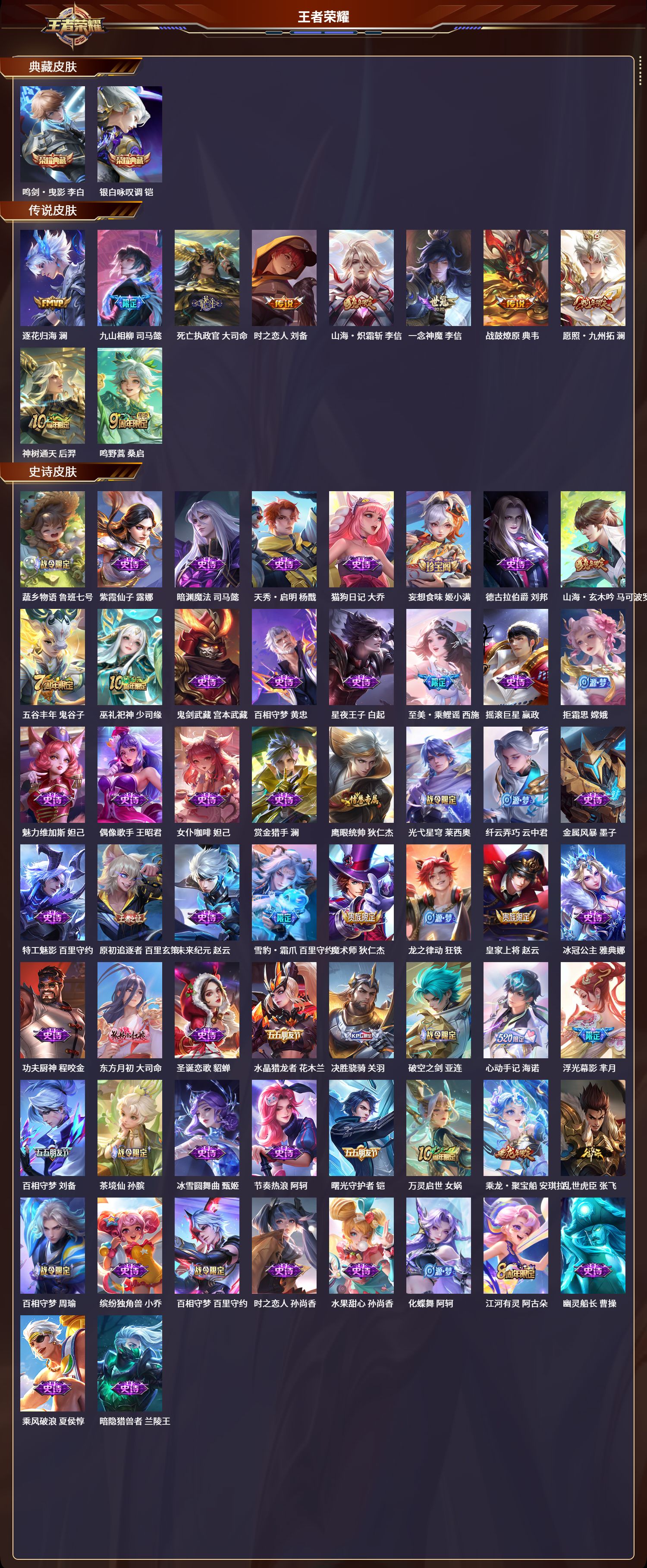 安卓qq/绝世王者/213皮肤/125英雄/2典藏/0珍品无双/0无双/0珍品传说/10传说/58史诗/8稀有英雄【2 典藏皮肤】鸣剑·曳影 李白银白咏叹调 铠【10 传说皮肤】逐花归海 澜九山相柳 司马懿死亡执政官 大司命时之恋人 刘备山海·炽霜斩 李信一念神魔 李信战鼓燎原 典韦愿照·九州拓 澜神树通天 后羿鸣野蒿 桑启【58 史诗皮肤】蔬乡物语 鲁