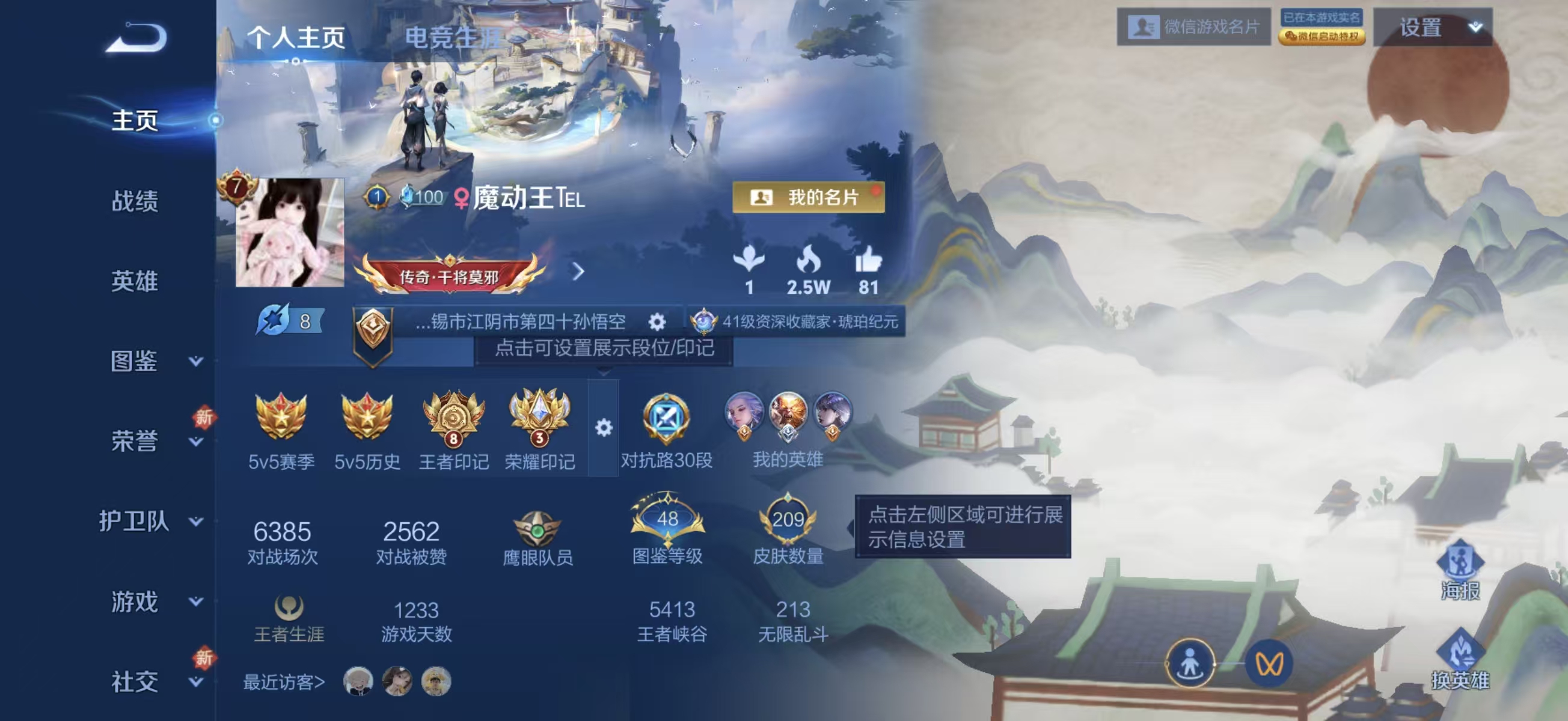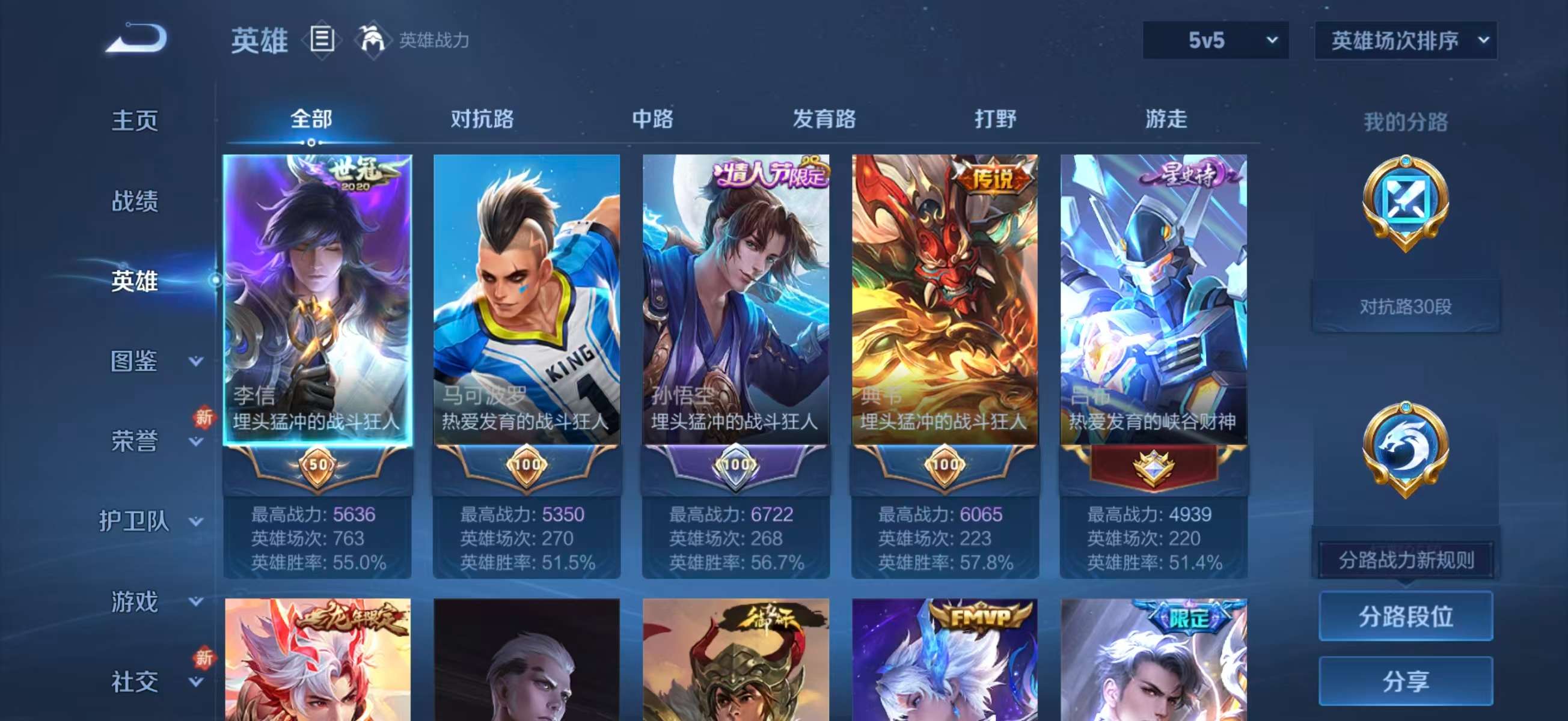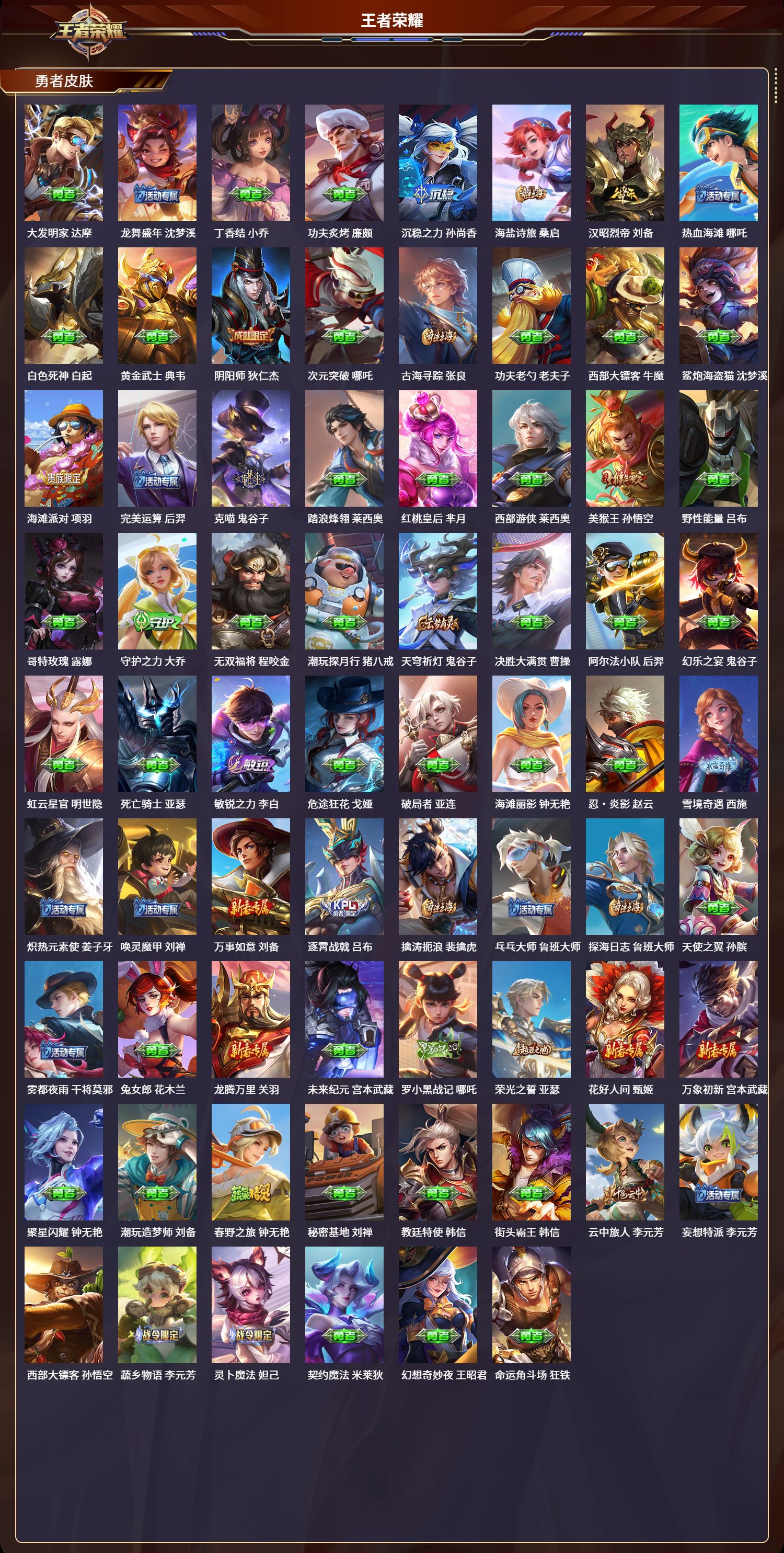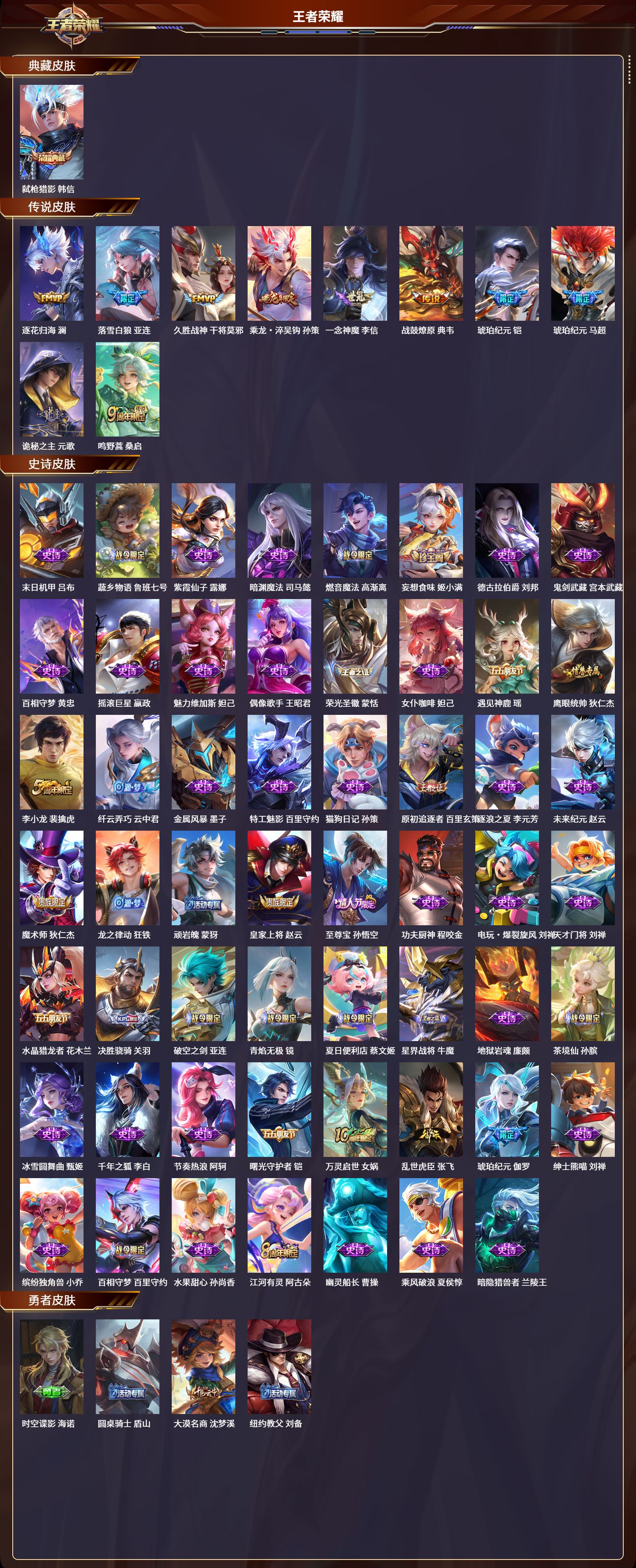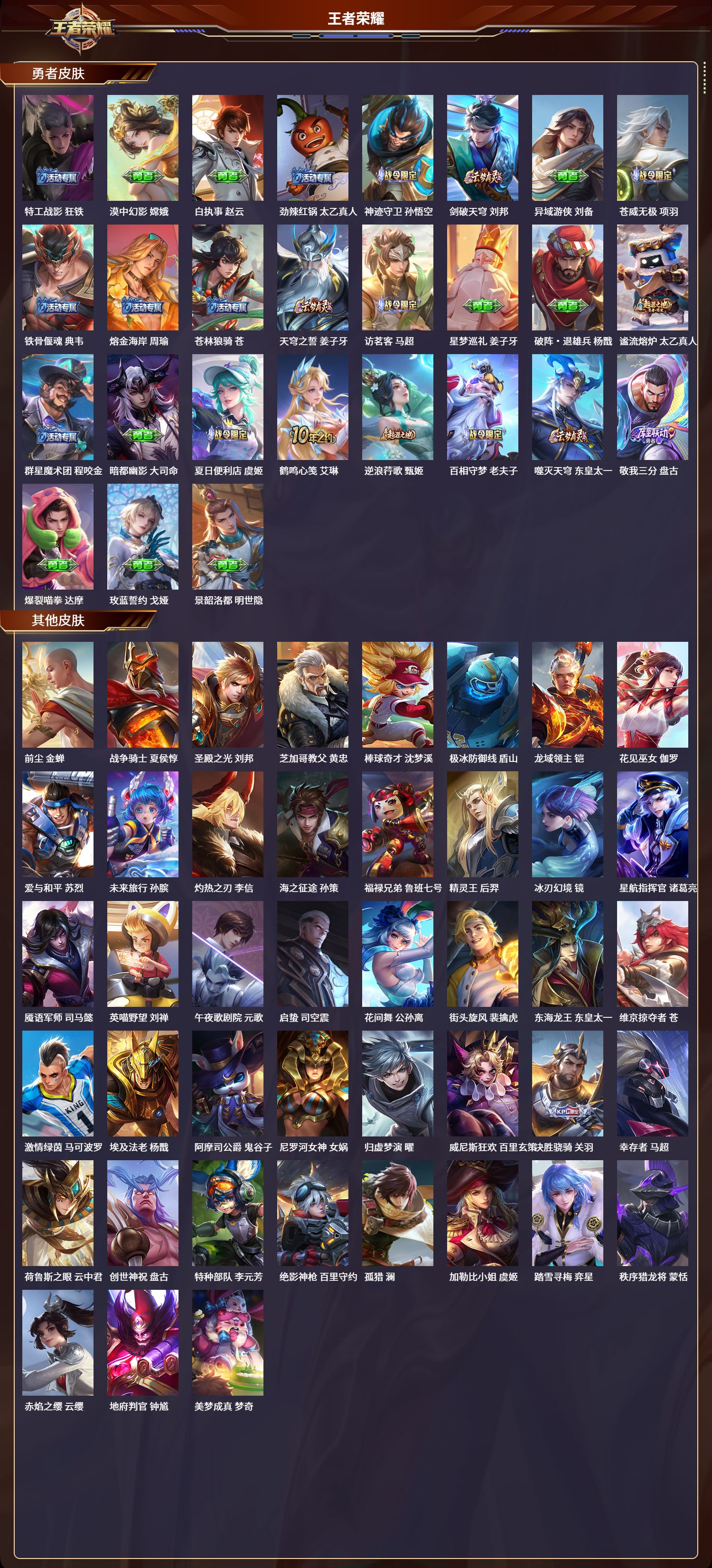 安卓微信/传奇王者/209皮肤/126英雄/1典藏/0珍品无双/0无双/0珍品传说/10传说/55史诗/8稀有英雄【1 典藏皮肤】弑呛猎影 韩信【10 传说皮肤】逐花归海 澜落雪白狼 亚连久胜战神 干将莫邪乘龙·淬吴钩 孙策一念神魔 李信战鼓燎原 典韦琥珀纪元 铠琥珀纪元 马超诡秘之主 元歌鸣野蒿 桑启【55 史诗皮肤】末日机甲 吕布蔬乡物语 鲁班七号