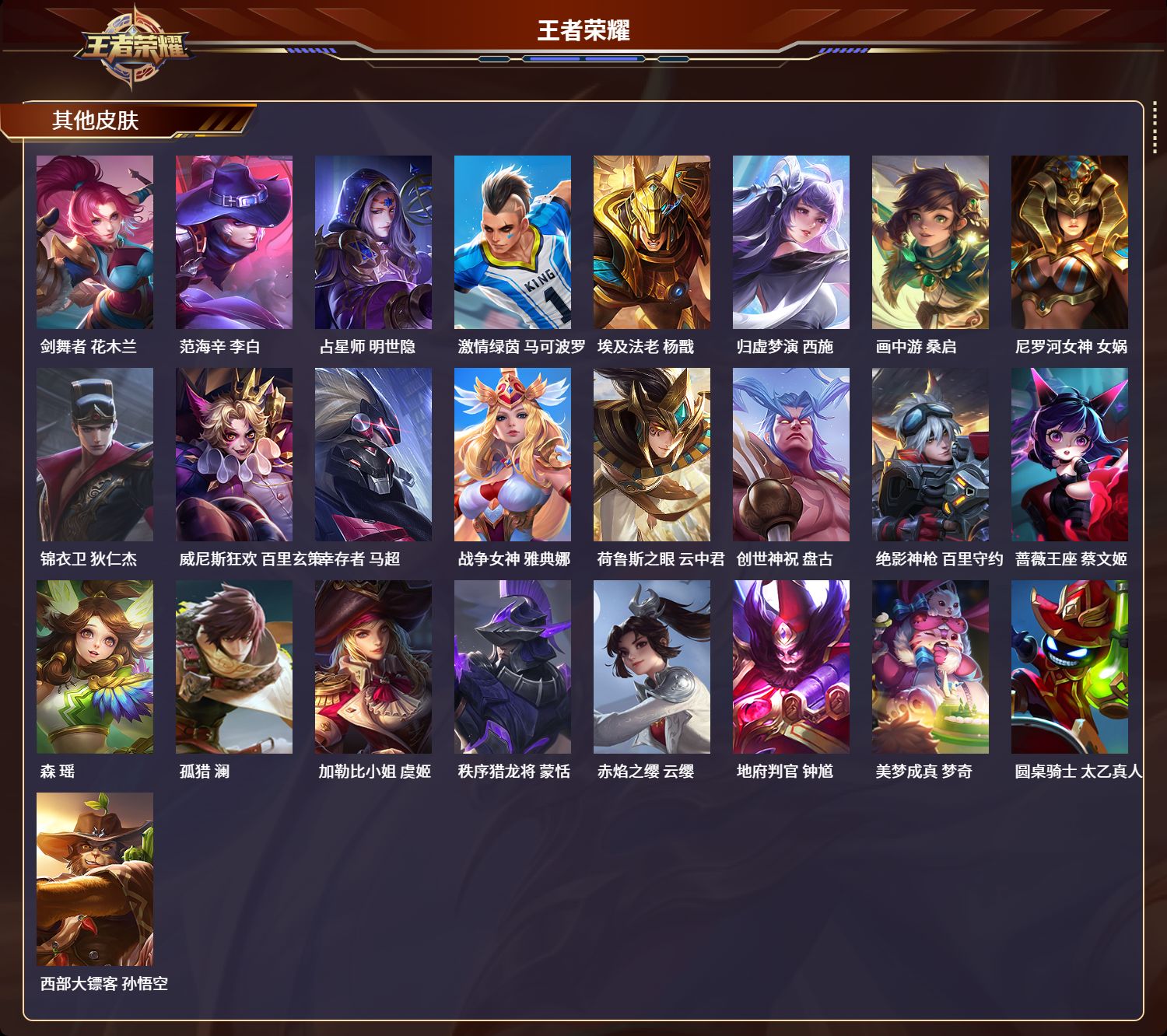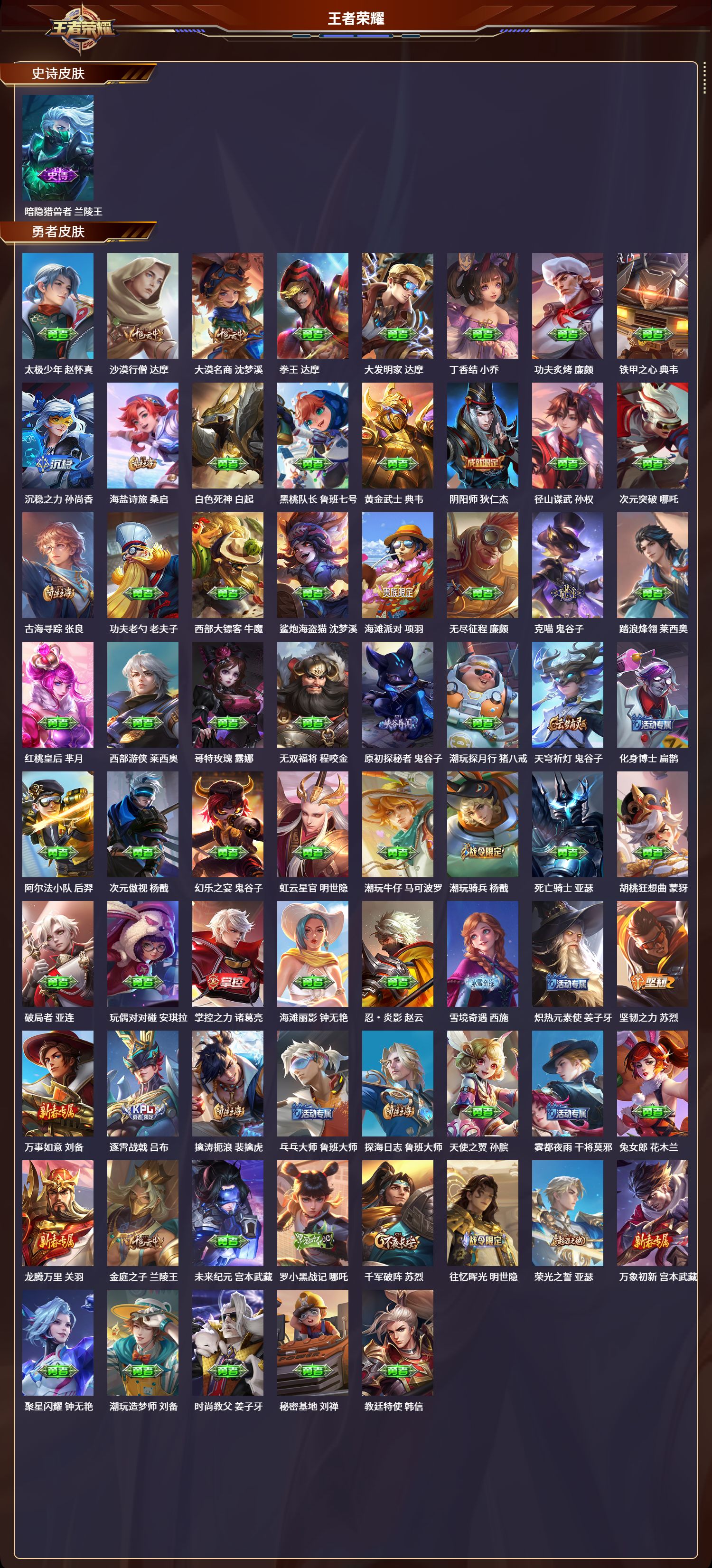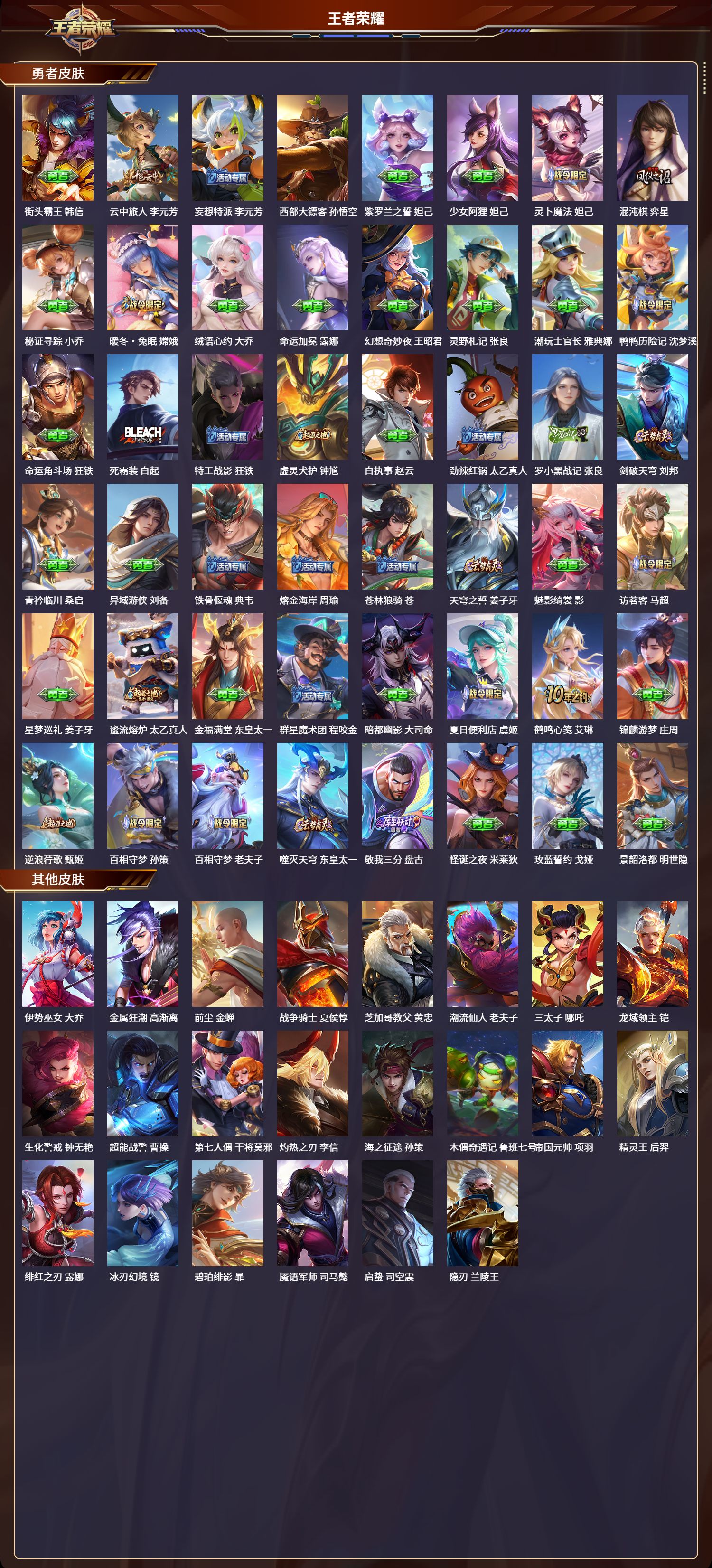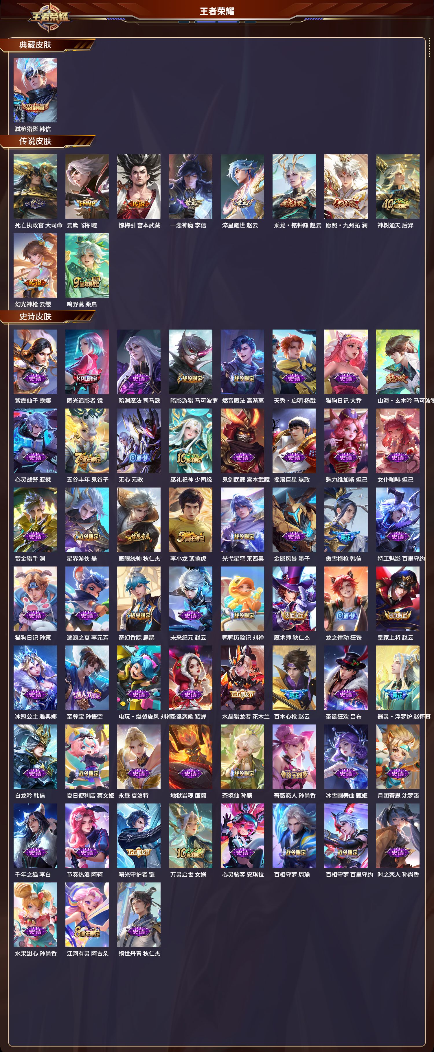 安卓qq/非凡王者/236皮肤/127英雄/1典藏/0珍品无双/0无双/0珍品传说/10传说/60史诗/9稀有英雄【1 典藏皮肤】弑呛猎影 韩信【10 传说皮肤】死亡执政官 大司命云鹰飞将 曜惊梅引 宫本武藏一念神魔 李信淬星耀世 赵云乘龙·铭钟鼎 赵云愿照·九州拓 澜神树通天 后羿幻光神呛 云缨鸣野蒿 桑启【60 史诗皮肤】紫霞仙子 露娜匿光追影者 镜