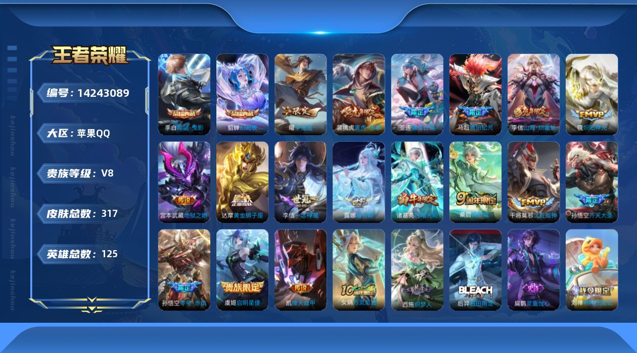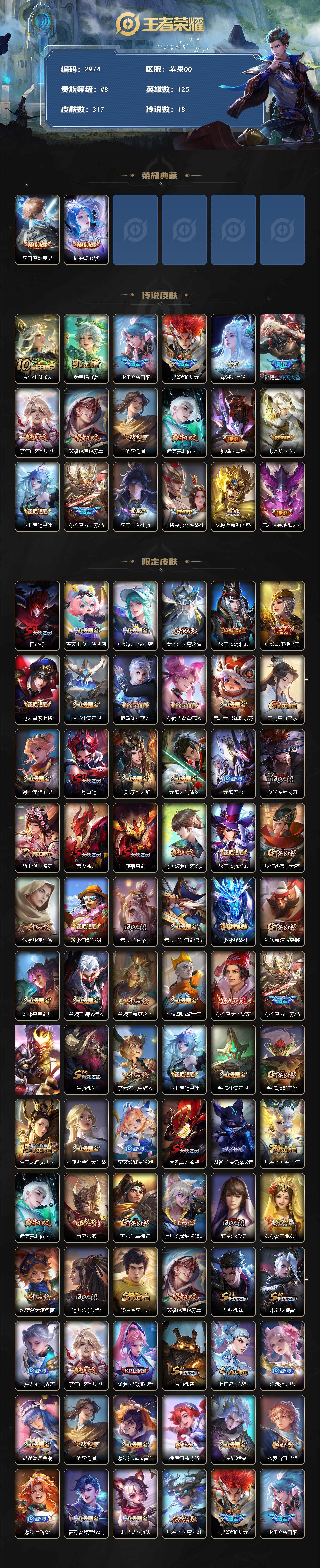 [14243089]苹果q-v8-最强王者段位-125英雄-317皮肤-2典藏-0珍品无双-0无双-0珍品传说-18传说-87史诗 【英雄全皮】:李信全皮 【荣耀典藏】:李白鸣剑曳影,貂蝉幻阙歌 【传说皮肤】:后羿神树通天,桑启鸣野蒿,亚连落雪白狼,马超琥珀纪元,露娜霜月吟,孙悟空齐天大圣,李信山海炽霜斩,裴擒虎寅虎赤拳,曜李 ,诸葛亮时雨天司,铠绛天战甲,镜炽阳神光,虞姬启明星使,孙悟空零号赤焰,李信一念神魔,干将莫邪久胜战神,达摩黄金狮子座,宫本武藏地狱之眼 【限定皮肤】:白起狰,蔡文姬夏日便利店,虞姬夏日便利店,姜子牙天穹之誓,狄仁杰阴阳师,虞姬凯尔特女王,赵云皇家上将,墨子神迹守卫,嬴政优雅恋人,孙尚香蔷薇恋人,鲁班七号狮舞东方,庄周高山流水,阿轲迷踪丽影,芈月重明,周瑜赤莲之焰,元歌云间偶戏,元歌无心,夏侯惇朔风刀,甄姬游园惊梦,曹操烛龙,典韦穷奇,马可波罗山海玄木吟,狄仁杰魔术师,狄仁杰万华元夜,达摩沙漠行僧,项羽海滩派对,老夫子醍醐杖,老夫子航海奇遇记,关羽冰锋战神,程咬金演武夺筹,刘邦夺宝奇兵,兰陵王驯魔猎人,兰陵王金庭之子,亚瑟潮玩骑士王,孙悟空大圣娶亲,孙悟空零号赤焰,孙悟空齐天大圣,牛魔御旌,李元芳云中旅人,虞姬启明星使,钟馗神迹守卫,钟馗驱傩正仪,杨玉环遇见飞天,雅典娜单词大作战,蔡文姬繁星吟游,太乙真人饕餮,鬼谷子原初探秘者,鬼谷子五谷丰年,诸葛亮时雨天司,黄忠烈魂,苏烈千军破阵,百里玄策原初追逐者,弈星混沌棋,公孙离玉兔公主,沈梦溪大漠名商,明世隐疑决卦,裴擒虎李小龙,裴擒虎寅虎赤拳,狂铁御狮,米莱狄御霄,云中君纤云弄巧,李信山海炽霜斩,伽罗天狼溯光者,盾山御銮,上官婉儿梁祝,嫦娥拒霜思,嫦娥暖冬兔眠,曜李 ,蒙犽狂想玩偶喵,桑启海盐诗旅,暃星界游侠,张良古海寻踪,蒙犽百解令,高渐离燃音魔法,妲己灵卜魔法,鬼谷子天穹祈灯,马超琥珀纪元,亚连落雪白狼,沈梦溪龙舞盛年,刘邦剑破天穹,程咬金群星魔术团,刘备异域游侠,周瑜熔金海岸 【年限皮肤】:裴擒虎寅虎赤拳,诸葛亮时雨天司,马超神威,黄忠烈魂,马可波罗山海玄木吟,李信山海炽霜斩 【赛季限定】:白起狰,芈月重明,夏侯惇朔风刀,曹操烛龙,典韦穷奇,狄仁杰万华元夜,达摩沙漠行僧,老夫子醍醐杖,程咬金演武夺筹,兰陵王金庭之子,张良古海寻踪,牛魔御旌,李元芳云中旅人,虞姬凯尔特女王,钟馗驱傩正仪,太乙真人饕餮,鬼