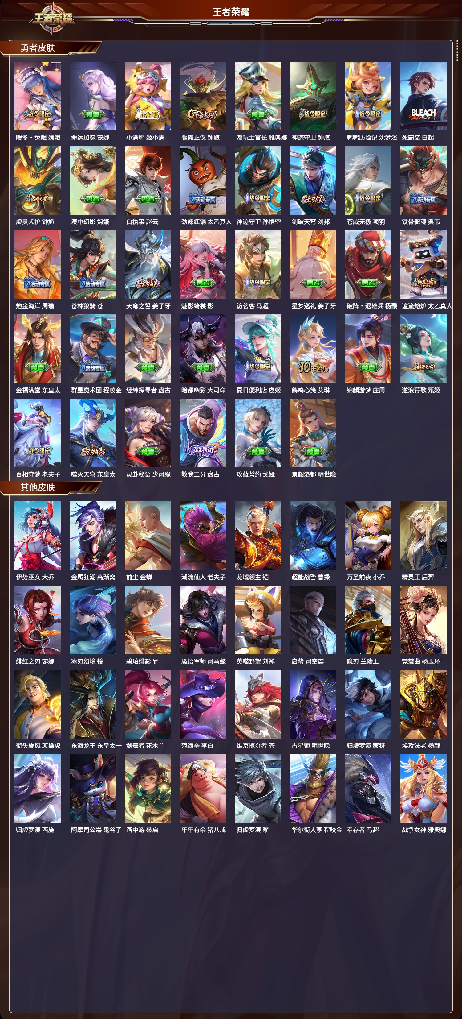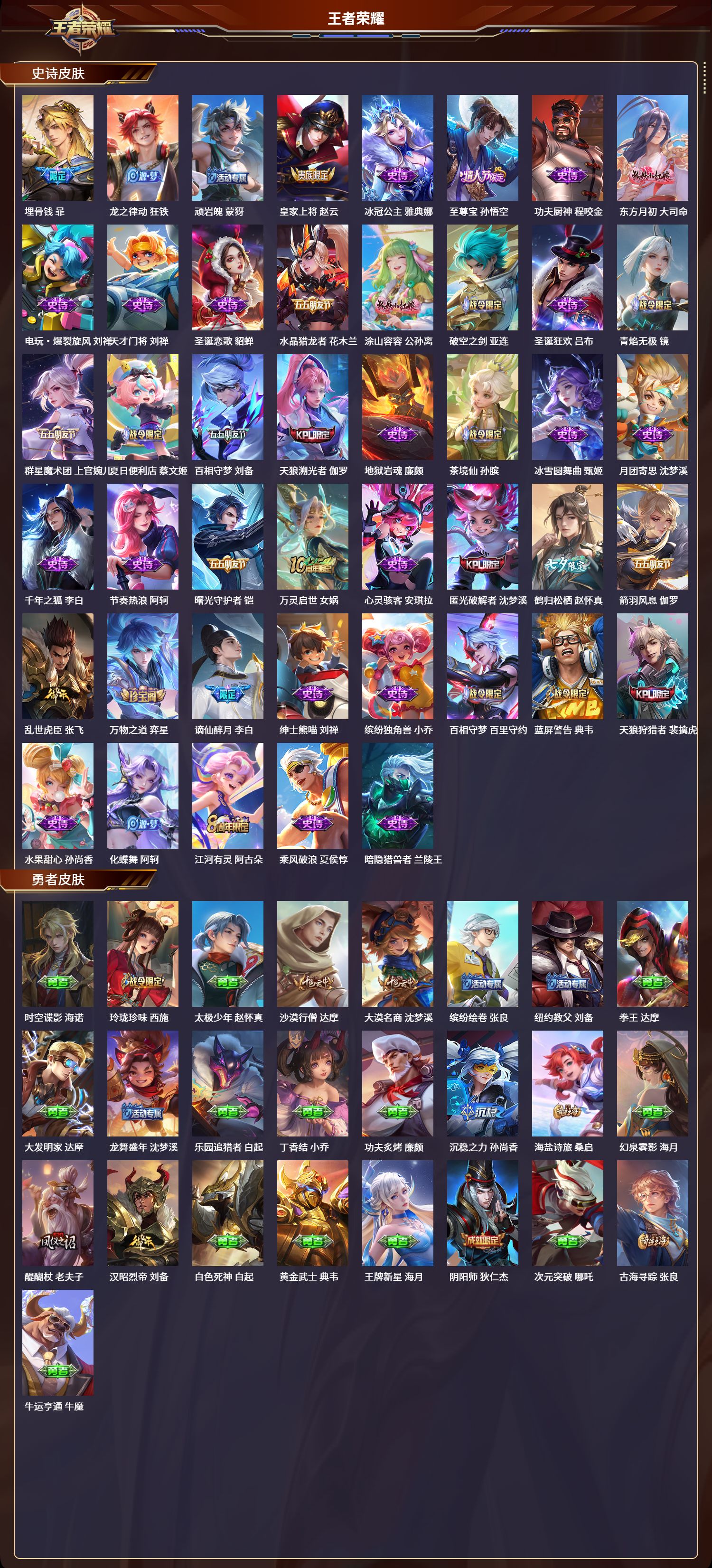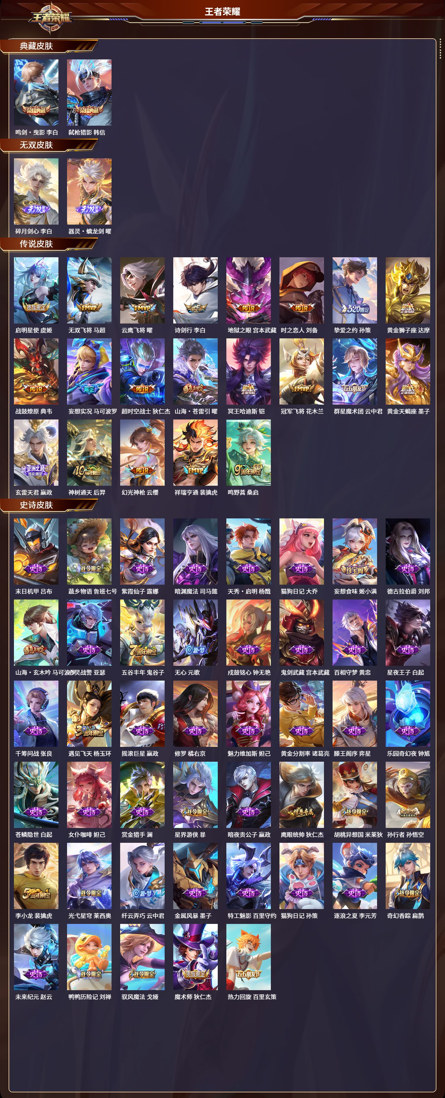 安卓微信/至尊星耀/288皮肤/127英雄/2典藏/0珍品无双/2无双/0珍品传说/21传说/90史诗/9稀有英雄【2 典藏皮肤】鸣剑·曳影 李白弑呛猎影 韩信【2 无双皮肤】碎月剑心 李白器灵·螭龙剑 曜【21 传说皮肤】启明星使 虞姬无双飞将 马超云鹰飞将 曜诗剑行 李白地狱之眼 宫本武藏时之恋人 刘备挚爱之约 孙策黄金狮子座 达摩战鼓燎原 典韦妄