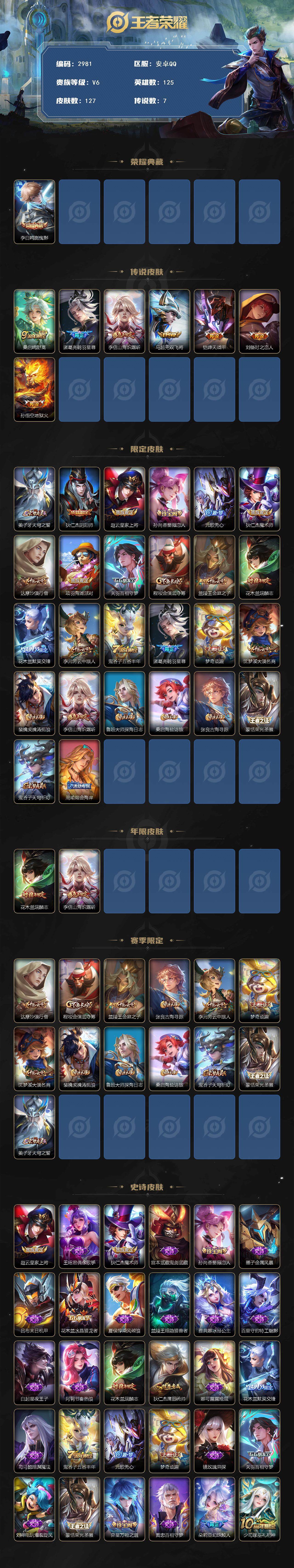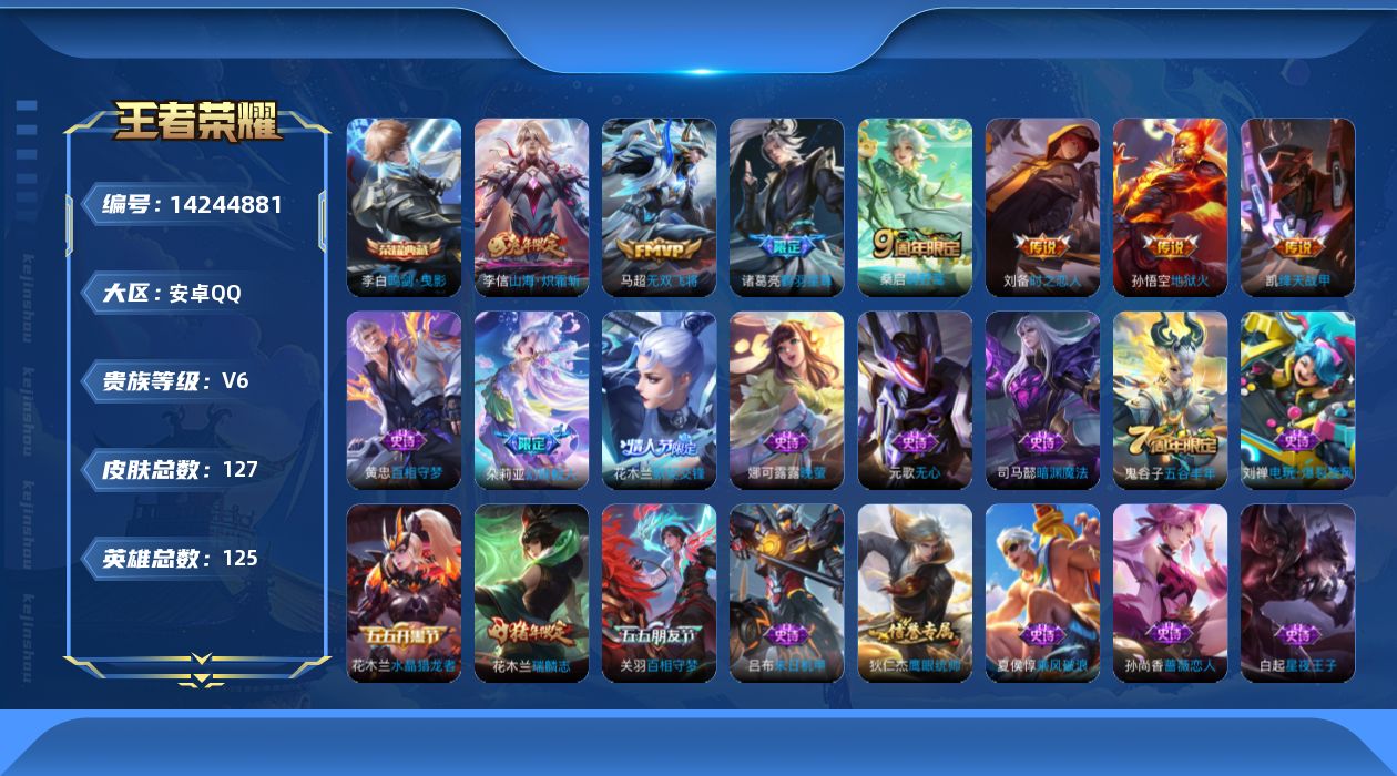 [14244881]安卓q-v6-最强王者段位-125英雄-127皮肤-1典藏-0珍品无双-0无双-0珍品传说-7传说-30史诗 【英雄全皮】:孙权全皮,蒙恬全皮 【荣耀典藏】:李白鸣剑曳影 【传说皮肤】:桑启鸣野蒿,诸葛亮鹤羽星尊,李信山海炽霜斩,马超无双飞将,铠绛天战甲,刘备时之恋人,孙悟空地狱火 【限定皮肤】:姜子牙天穹之誓,狄仁杰阴阳师,赵云皇家上将,孙尚香蔷薇恋人,元歌无心,狄仁杰魔术师,达摩沙漠行僧,项羽海滩派对,关羽百相守梦,程咬金演武夺筹,兰陵王金庭之子,花木兰瑞麟志,花木兰默契交锋,李元芳云中旅人,鬼谷子五谷丰年,诸葛亮鹤羽星尊,梦奇顽趣,沈梦溪大漠名商,裴擒虎擒涛扼浪,李信山海炽霜斩,鲁班大师探海日志,桑启海盐诗旅,张良古海寻踪,蒙恬荣光圣徽,鬼谷子天穹祈灯,周瑜熔金海岸 【年限皮肤】:花木兰瑞麟志,李信山海炽霜斩 【赛季限定】:达摩沙漠行僧,程咬金演武夺筹,兰陵王金庭之子,张良古海寻踪,李元芳云中旅人,梦奇顽趣,沈梦溪大漠名商,裴擒虎擒涛扼浪,鲁班大师探海日志,桑启海盐诗旅,鬼谷子天穹祈灯,蒙恬荣光圣徽,姜子牙天穹之誓 【史诗皮肤】:赵云皇家上将,王昭君偶像歌手,狄仁杰魔术师,宫本武藏鬼剑武藏,孙尚香蔷薇恋人,墨子金属风暴,吕布末日机甲,花木兰水晶猎龙者,夏侯惇乘风破浪,兰陵王暗隐猎兽者,雅典娜冰冠公主,百里守约特工魅影,白起星夜王子,阿轲节奏热浪,花木兰瑞麟志,狄仁杰鹰眼统帅,娜可露露晚萤,花木兰默契交锋,司马懿暗渊魔法,鬼谷子五谷丰年,元歌无心,梦奇顽趣,镜玫瑰异探,关羽百相守梦,刘禅电玩爆裂旋风,蒙恬荣光圣徽,弈星万物之道,黄忠百相守梦,朵莉亚幻珠鲛人,少司缘巫礼祀神 【其他皮肤】:项羽海滩派对,韩信教廷特使,韩信街头霸王,赵云忍炎影,芈月红桃皇后,程咬金星际陆战队,白起白色死神,武则天东方不败,安琪拉玩偶对对碰,典韦黄金武士,达摩拳王,狄仁杰阴阳师,刘备纽约教父,关羽龙腾万里,钟无艳海滩丽影,狂铁命运角斗场,老夫子功夫老勺,孙尚香沉稳之力,诸葛亮掌控之力,李白敏锐之力,苏烈坚韧之力,大乔守护之力,沈梦溪鲨炮海盗猫,程咬金演武夺筹,张良缤纷绘卷,鲁班大师乓乓大师,典韦铁甲之心,达摩沙漠行僧,兰陵王金庭之子,沈梦溪大漠名商,蒙恬蔚蓝守将,李元芳云中旅人,桑启海盐诗旅,海月幻泉雾影,猪八戒潮玩探月行,白起乐园追猎者,赵怀真太极少年,裴擒虎擒涛扼浪,太乙真人劲辣