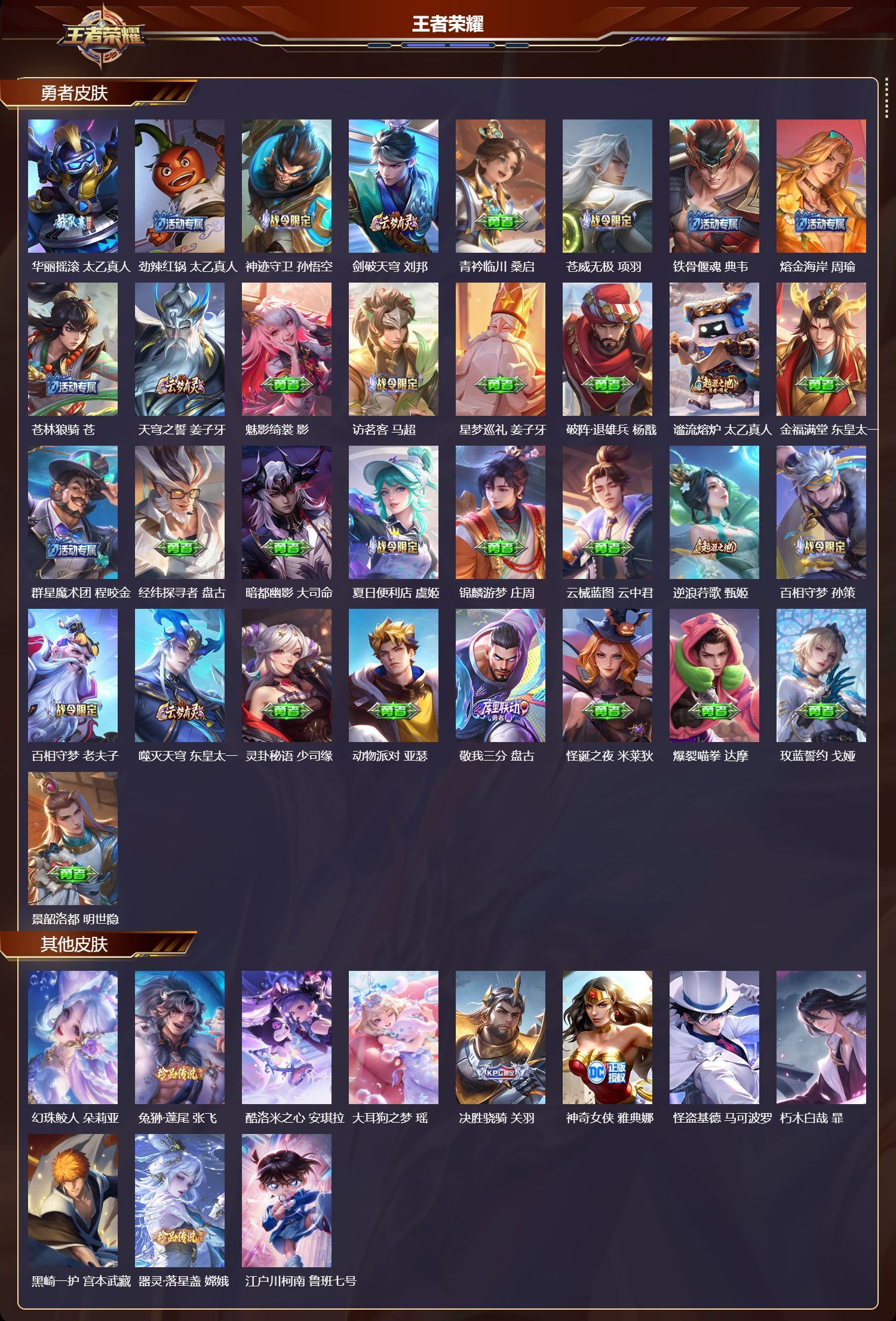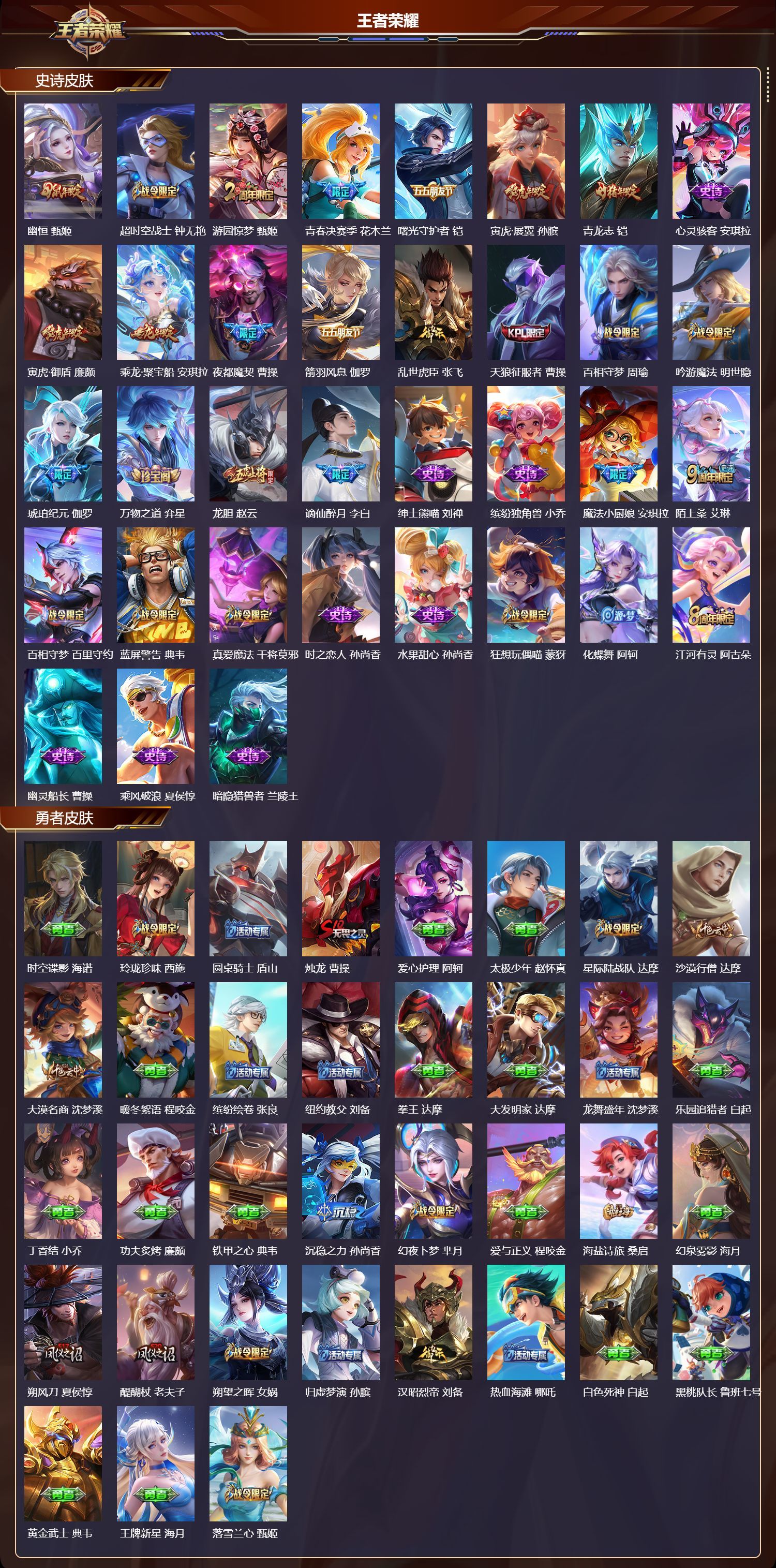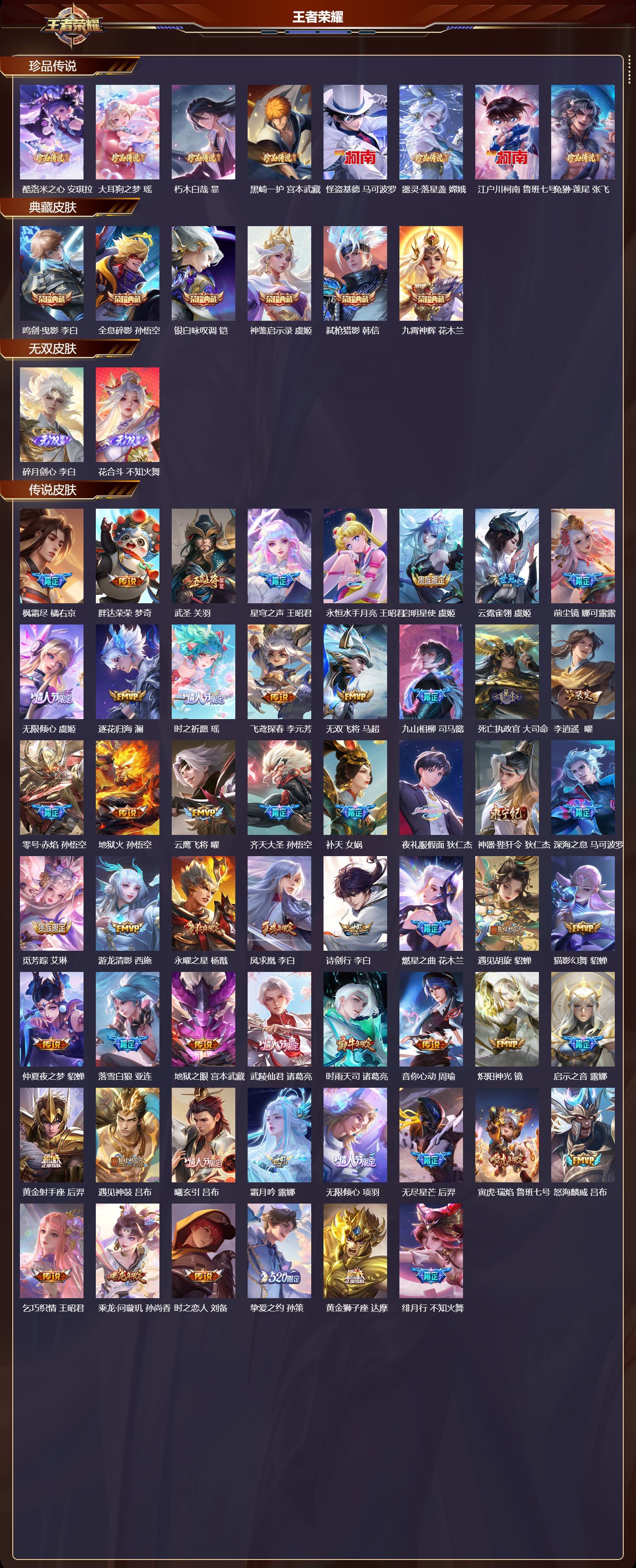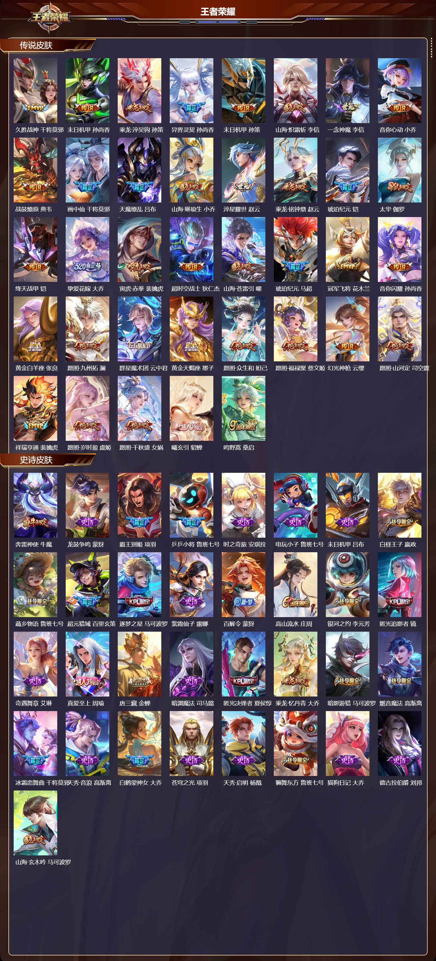 [13990726]苹果微信/v10/传奇王者/604皮肤/英雄/6典藏/0珍品无双/2无双/8珍品传说/91传说/208史诗/0稀有英雄 【8 珍品传说】酷洛米之心 安琪拉大耳狗之梦 瑶朽木白哉 暃黑崎一护 宫本武藏怪盗基德 马可波罗器灵·落星盏 嫦娥江户川柯南 鲁班七号兔狲·蓬尾 张飞 【6 典藏皮肤】鸣剑·曳影 李白全息碎影 孙悟空银白咏叹调 铠神鉴启示录 虞姬弑呛猎影 韩信九霄神辉 花木兰 【2 无双皮肤】碎月剑心 李白花合斗 不知火舞 【91 传说皮肤】枫霜尽 橘右京胖达荣荣 梦奇武圣 关羽星穹之声 王昭君永恒水手月亮 王昭君启明星使 虞姬云霓雀翎 虞姬前尘镜 娜可露露无限倾心 虞姬逐花归海 澜时之祈愿 瑶飞鸢探春 李元芳无双飞将 马超九山相柳 司马懿死亡执政官 大司命李 曜零号·赤焰 孙悟空地狱火 孙悟空云鹰飞将 曜齐天大圣 孙悟空补天 女娲夜礼服假面 狄仁杰神器·狴犴令 狄仁杰深海之息 马可波罗觅芳踪 艾琳游龙清影 西施永曜之星 杨戬凤求凰 李白诗剑行 李白燃星之曲 花木兰遇见胡旋 貂蝉猫影幻舞 貂蝉仲夏夜之梦 貂蝉落雪白狼 亚连地狱之眼 宫本武藏武陵仙君 诸葛亮时雨天司 诸葛亮音你心动 周瑜炽阳神光 镜启示之音 露娜黄金射手座 后羿遇见神鼓 吕布曦玄引 吕布霜月吟 露娜无限倾心 项羽无尽星芒 后羿寅虎·瑞焰 鲁班七号怒海麟威 吕布乞巧织情 王昭君乘龙·问璇玑 孙尚香时之恋人 刘备挚爱之约 孙策黄金狮子座 达摩绯月行 不知火舞久胜战神 干将莫邪末日机甲 孙尚香乘龙·淬吴钩 孙策异界灵契 孙尚香末日机甲 孙策山海·炽霜斩 李信一念神魔 李信音你心动 小乔战鼓燎原 典韦画中仙 干将莫邪天魔缭乱 吕布山海·琳琅生 小乔淬星耀世 赵云乘龙·铭钟鼎 赵云琥珀纪元 铠太华 伽罗绛天战甲 铠挚爱花嫁 大乔寅虎·赤拳 裴擒虎超时空战士 狄仁杰山海·苍雷引 曜琥珀纪元 马超冠军飞将 花木兰音你闪耀 孙尚香黄金白羊座 张良愿照·九州拓 澜群星魔术团 云中君黄金天蝎座 墨子愿照·众生和 妲己愿照·福禄聚 蔡文姬幻光神呛 云缨愿照·山河定 司空震祥瑞亨通 裴擒虎愿照·岁时盈 虞姬愿照·千秋盛 女娲曦玄引 貂蝉鸣野蒿 桑启 【208 史诗皮肤】奔雷神使 牛魔龙鼓争鸣 蒙犽霸王别姬 项羽乒乒小将 鲁班七号时之奇旅 安琪拉电玩小子 鲁班七号末日机甲 吕布白昼王子 嬴政蔬乡物语 鲁班七号超元猎域 百里玄策逐梦之星 马可波罗紫霞仙子 露娜百解令 蒙犽高山流水 庄周银河之约 李元芳匿光追影者 镜奇遇舞章 艾琳真爱至上 周瑜唐三藏 金蝉暗渊魔法 司马懿匿光决锋者 夏侯惇乘龙·忆丹青 大乔暗影游猎 马可波罗燃音魔法 高渐离冰霜恋舞曲 干将莫邪天秀·音浪 高渐离白鹤梁神女 大乔苍穹之光 项羽天秀·启明 杨戬狮舞东方 鲁班七号猫狗日记 大乔德古拉伯爵 刘邦山海·玄木吟 马可波罗心灵战警 亚瑟闲日渔趣 姜子