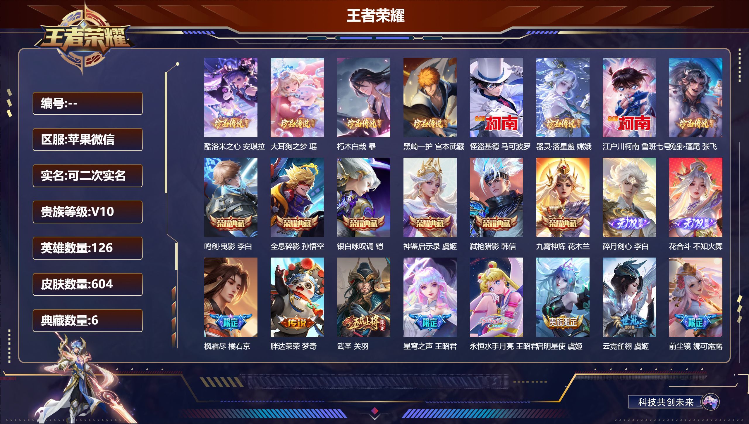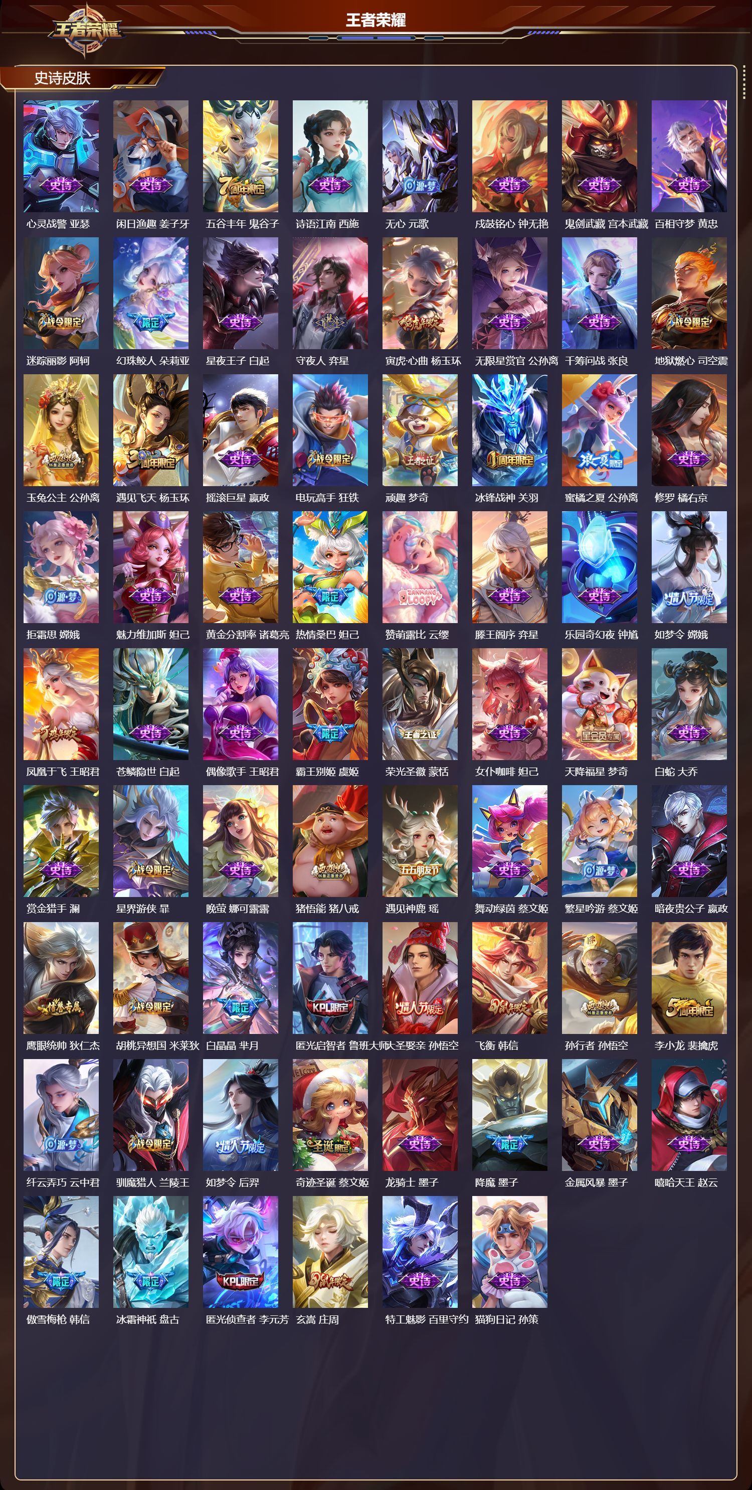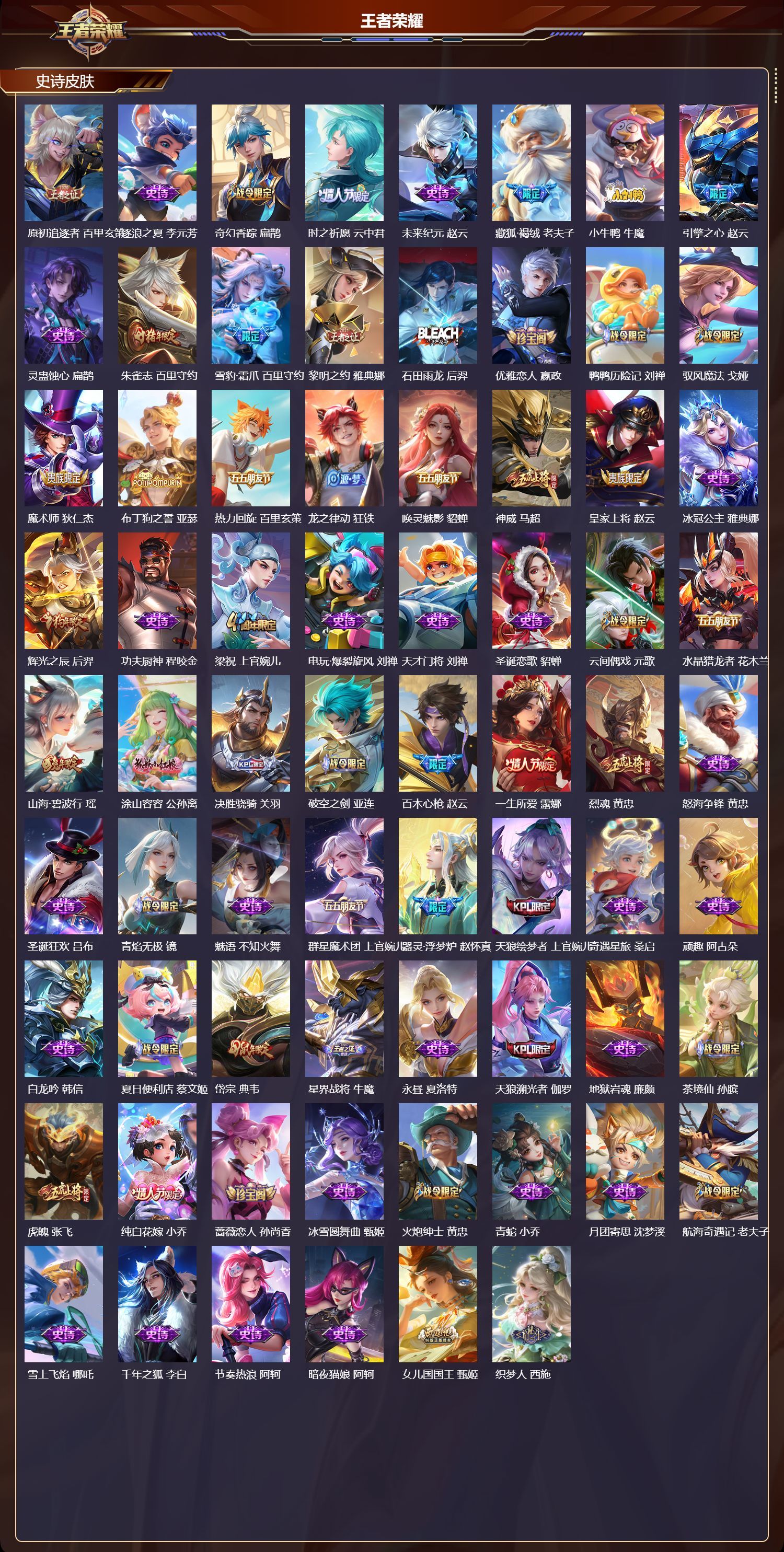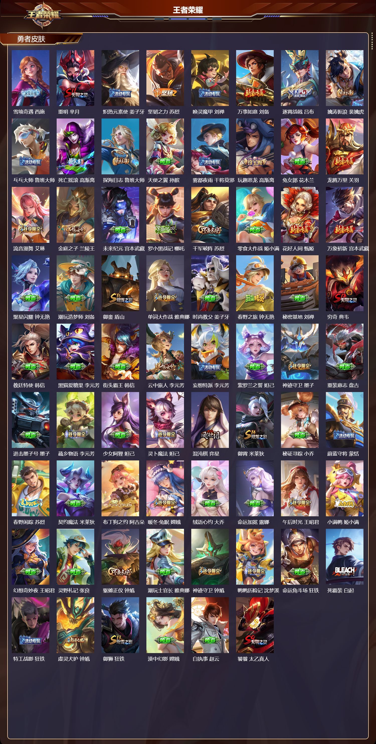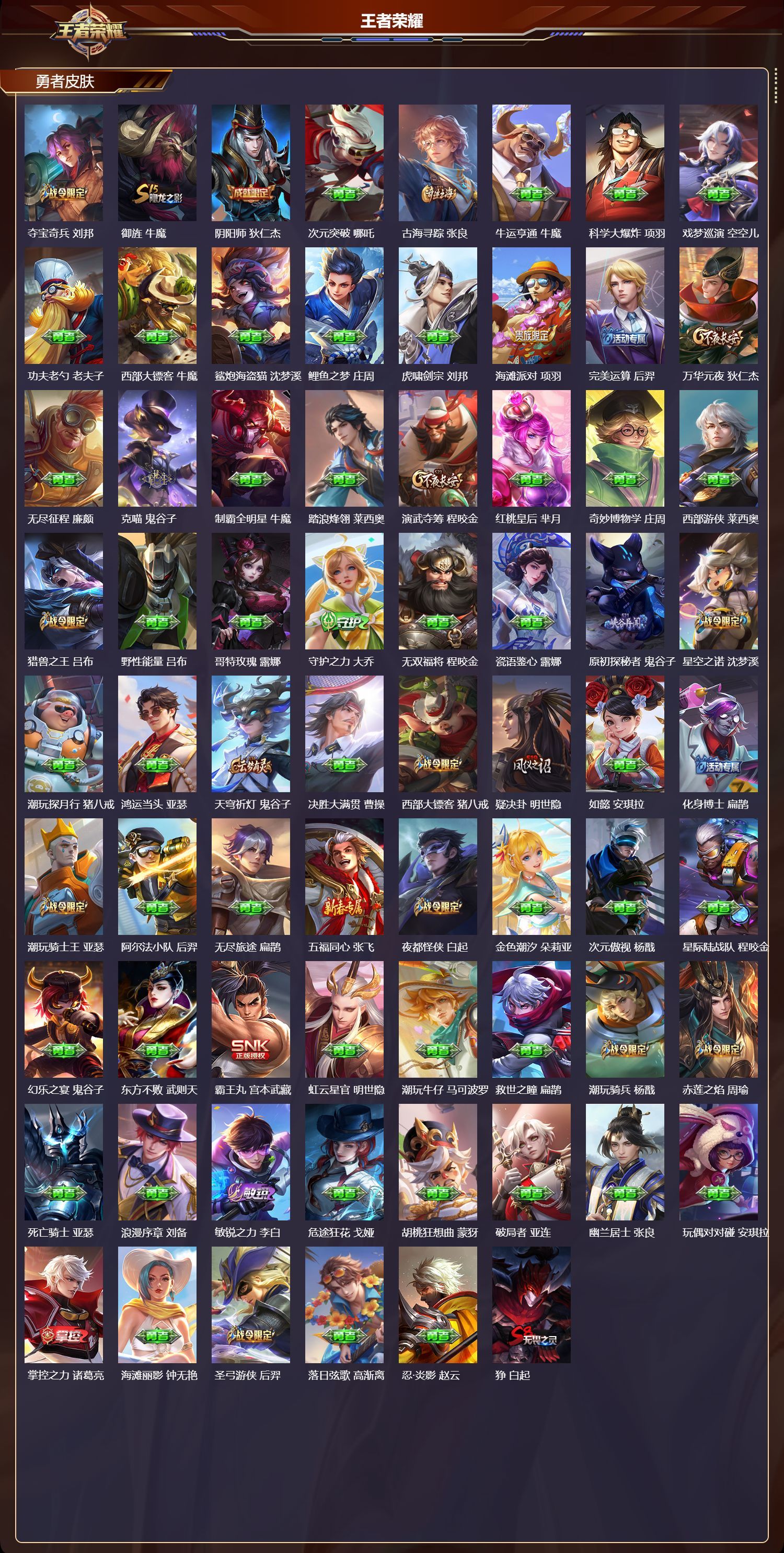 [13990726]苹果微信/v10/传奇王者/604皮肤/英雄/6典藏/0珍品无双/2无双/8珍品传说/91传说/208史诗/0稀有英雄 【8 珍品传说】酷洛米之心 安琪拉大耳狗之梦 瑶朽木白哉 暃黑崎一护 宫本武藏怪盗基德 马可波罗器灵·落星盏 嫦娥江户川柯南 鲁班七号兔狲·蓬尾 张飞 【6 典藏皮肤】鸣剑·曳影 李白全息碎影 孙悟空银白咏叹调 铠神鉴启示录 虞姬弑呛猎影 韩信九霄神辉 花木兰 【2 无双皮肤】碎月剑心 李白花合斗 不知火舞 【91 传说皮肤】枫霜尽 橘右京胖达荣荣 梦奇武圣 关羽星穹之声 王昭君永恒水手月亮 王昭君启明星使 虞姬云霓雀翎 虞姬前尘镜 娜可露露无限倾心 虞姬逐花归海 澜时之祈愿 瑶飞鸢探春 李元芳无双飞将 马超九山相柳 司马懿死亡执政官 大司命李 曜零号·赤焰 孙悟空地狱火 孙悟空云鹰飞将 曜齐天大圣 孙悟空补天 女娲夜礼服假面 狄仁杰神器·狴犴令 狄仁杰深海之息 马可波罗觅芳踪 艾琳游龙清影 西施永曜之星 杨戬凤求凰 李白诗剑行 李白燃星之曲 花木兰遇见胡旋 貂蝉猫影幻舞 貂蝉仲夏夜之梦 貂蝉落雪白狼 亚连地狱之眼 宫本武藏武陵仙君 诸葛亮时雨天司 诸葛亮音你心动 周瑜炽阳神光 镜启示之音 露娜黄金射手座 后羿遇见神鼓 吕布曦玄引 吕布霜月吟 露娜无限倾心 项羽无尽星芒 后羿寅虎·瑞焰 鲁班七号怒海麟威 吕布乞巧织情 王昭君乘龙·问璇玑 孙尚香时之恋人 刘备挚爱之约 孙策黄金狮子座 达摩绯月行 不知火舞久胜战神 干将莫邪末日机甲 孙尚香乘龙·淬吴钩 孙策异界灵契 孙尚香末日机甲 孙策山海·炽霜斩 李信一念神魔 李信音你心动 小乔战鼓燎原 典韦画中仙 干将莫邪天魔缭乱 吕布山海·琳琅生 小乔淬星耀世 赵云乘龙·铭钟鼎 赵云琥珀纪元 铠太华 伽罗绛天战甲 铠挚爱花嫁 大乔寅虎·赤拳 裴擒虎超时空战士 狄仁杰山海·苍雷引 曜琥珀纪元 马超冠军飞将 花木兰音你闪耀 孙尚香黄金白羊座 张良愿照·九州拓 澜群星魔术团 云中君黄金天蝎座 墨子愿照·众生和 妲己愿照·福禄聚 蔡文姬幻光神呛 云缨愿照·山河定 司空震祥瑞亨通 裴擒虎愿照·岁时盈 虞姬愿照·千秋盛 女娲曦玄引 貂蝉鸣野蒿 桑启 【208 史诗皮肤】奔雷神使 牛魔龙鼓争鸣 蒙犽霸王别姬 项羽乒乒小将 鲁班七号时之奇旅 安琪拉电玩小子 鲁班七号末日机甲 吕布白昼王子 嬴政蔬乡物语 鲁班七号超元猎域 百里玄策逐梦之星 马可波罗紫霞仙子 露娜百解令 蒙犽高山流水 庄周银河之约 李元芳匿光追影者 镜奇遇舞章 艾琳真爱至上 周瑜唐三藏 金蝉暗渊魔法 司马懿匿光决锋者 夏侯惇乘龙·忆丹青 大乔暗影游猎 马可波罗燃音魔法 高渐离冰霜恋舞曲 干将莫邪天秀·音浪 高渐离白鹤梁神女 大乔苍穹之光 项羽天秀·启明 杨戬狮舞东方 鲁班七号猫狗日记 大乔德古拉伯爵 刘邦山海·玄木吟 马可波罗心灵战警 亚瑟闲日渔趣 姜子