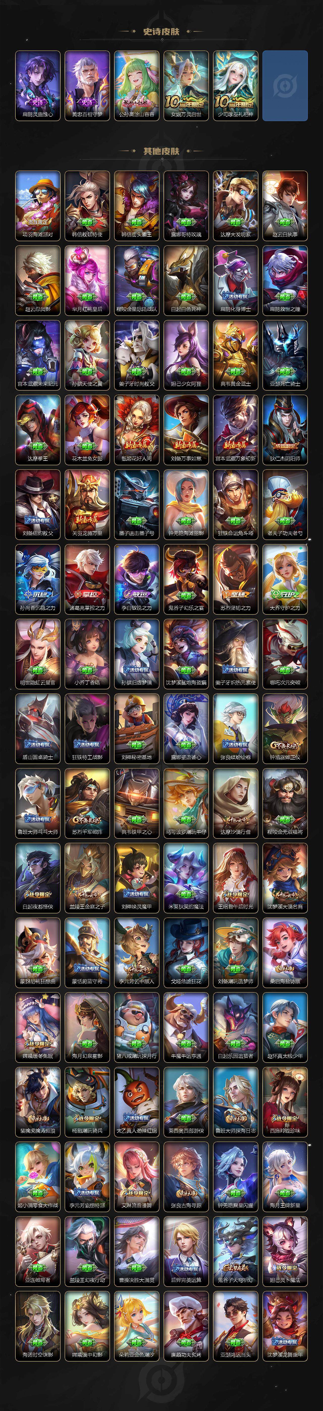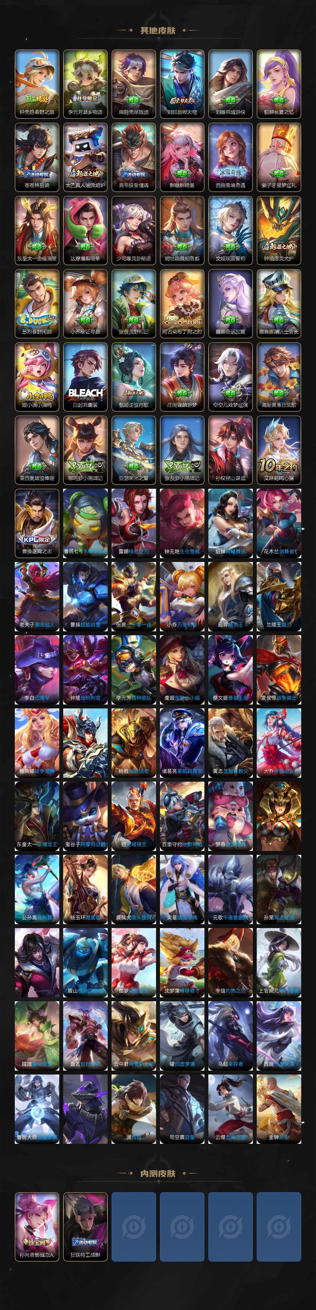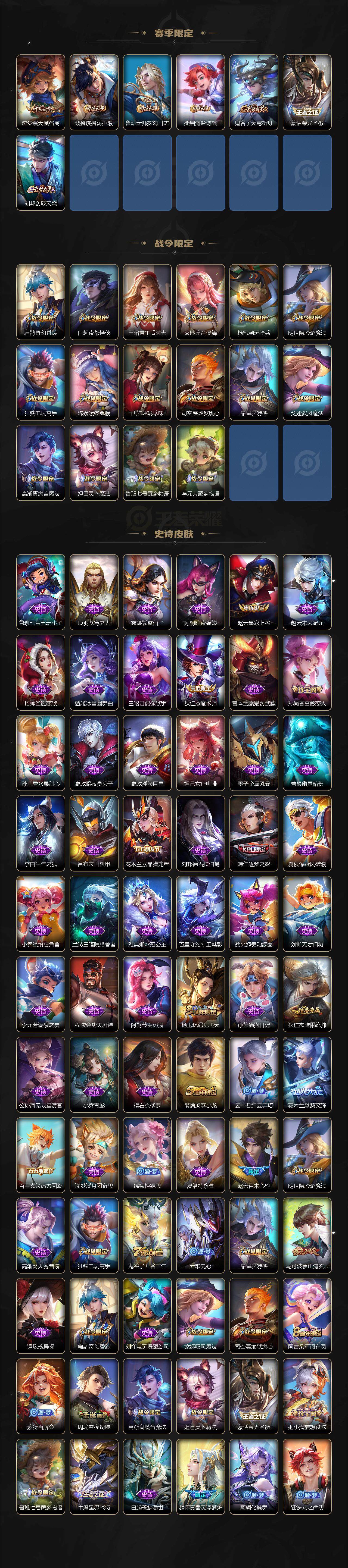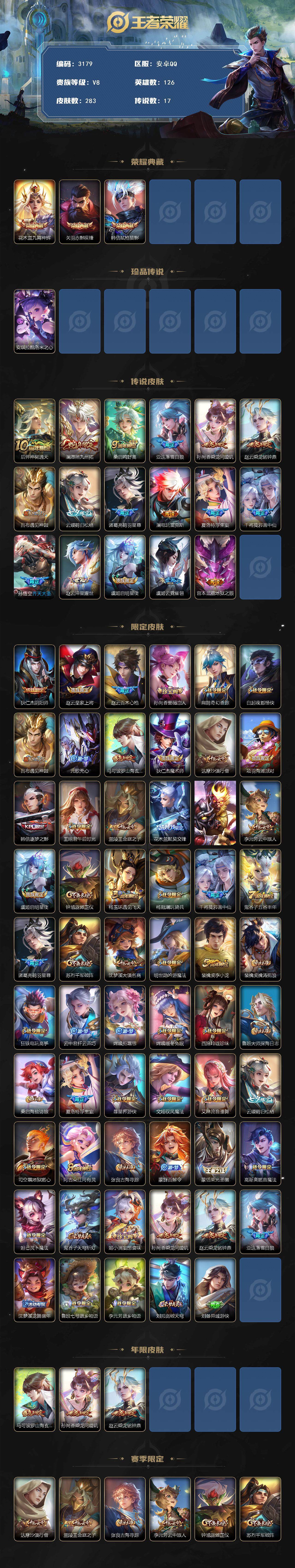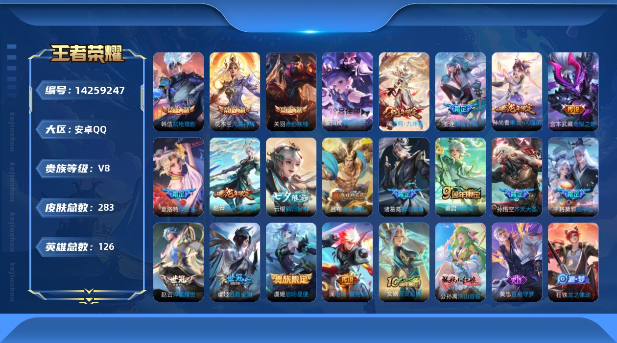 [14259247]安卓q-v7-最强王者段位-126英雄-283皮肤-3典藏皮肤-1珍品传说-17传说-76史诗 【英雄全皮】:孙权全皮,蒙恬全皮,夏洛特全皮,戈娅全皮,空空儿全皮,影全皮 【荣耀典藏】:花木兰九霄神辉,关羽赤影疾锋,韩信弑呛猎影 【珍品传说】:安琪拉酷洛米之心 【传说皮肤】:后羿神树通天,澜愿照九州拓,桑启鸣野蒿,亚连落雪白狼,孙尚香乘龙问璇玑,赵云乘龙铭钟鼎,吕布遇见神鼓,云缨鹤归松栖,诸葛亮鹤羽星尊,澜电玩雷克斯,夏洛特浮生妄,干将莫邪画中仙,孙悟空齐天大圣,赵云淬星耀世,虞姬启明星使,虞姬云霓雀翎,宫本武藏地狱之眼 【限定皮肤】:狄仁杰阴阳师,赵云皇家上将,赵云百木心呛,孙尚香蔷薇恋人,扁鹊奇幻香踪,白起夜都怪侠,吕布遇见神鼓,元歌无心,马可波罗山海玄木吟,狄仁杰魔术师,达摩沙漠行僧,项羽海滩派对,韩信逐梦之影,王昭君午后时光,兰陵王金庭之子,花木兰默契交锋,孙悟空齐天大圣,李元芳云中旅人,虞姬启明星使,钟馗驱傩正仪,杨玉环遇见飞天,杨戬潮玩骑兵,干将莫邪画中仙,鬼谷子五谷丰年,诸葛亮鹤羽星尊,苏烈千军破阵,沈梦溪大漠名商,明世隐吟游魔法,裴擒虎李小龙,裴擒虎擒涛扼浪,狂铁电玩高手,云中君纤云弄巧,嫦娥拒霜思,嫦娥暖冬兔眠,西施玲珑珍味,鲁班大师探海日志,桑启海盐诗旅,夏洛特浮生妄,暃星界游侠,戈娅驭风魔法,艾琳流音漫舞,云缨鹤归松栖,司空震地狱燃心,阿古朵江河有灵,张良古海寻踪,蒙犽百解令,蒙恬荣光圣徽,高渐离燃音魔法,妲己灵卜魔法,鬼谷子天穹祈灯,姬小满妄想食味,孙尚香乘龙问璇玑,赵云乘龙铭钟鼎,亚连落雪白狼,沈梦溪龙舞盛年,鲁班七号蔬乡物语,李元芳蔬乡物语,刘邦剑破天穹,刘备异域游侠 【年限皮肤】:马可波罗山海玄木吟,孙尚香乘龙问璇玑,赵云乘龙铭钟鼎 【赛季限定】:达摩沙漠行僧,兰陵王金庭之子,张良古海寻踪,李元芳云中旅人,钟馗驱傩正仪,苏烈千军破阵,沈梦溪大漠名商,裴擒虎擒涛扼浪,鲁班大师探海日志,桑启海盐诗旅,鬼谷子天穹祈灯,蒙恬荣光圣徽,刘邦剑破天穹 【战令限定】:扁鹊奇幻香踪,白起夜都怪侠,王昭君午后时光,艾琳流音漫舞,杨戬潮玩骑兵,明世隐吟游魔法,狂铁电玩高手,嫦娥暖冬兔眠,西施玲珑珍味,司空震地狱燃心,暃星界游侠,戈娅驭风魔法,高渐离燃音魔法,妲己灵卜魔法,鲁班七号蔬乡物语,李元芳蔬乡物语 【史诗皮肤】:鲁班七号电玩小子,项羽苍穹之光,露娜
