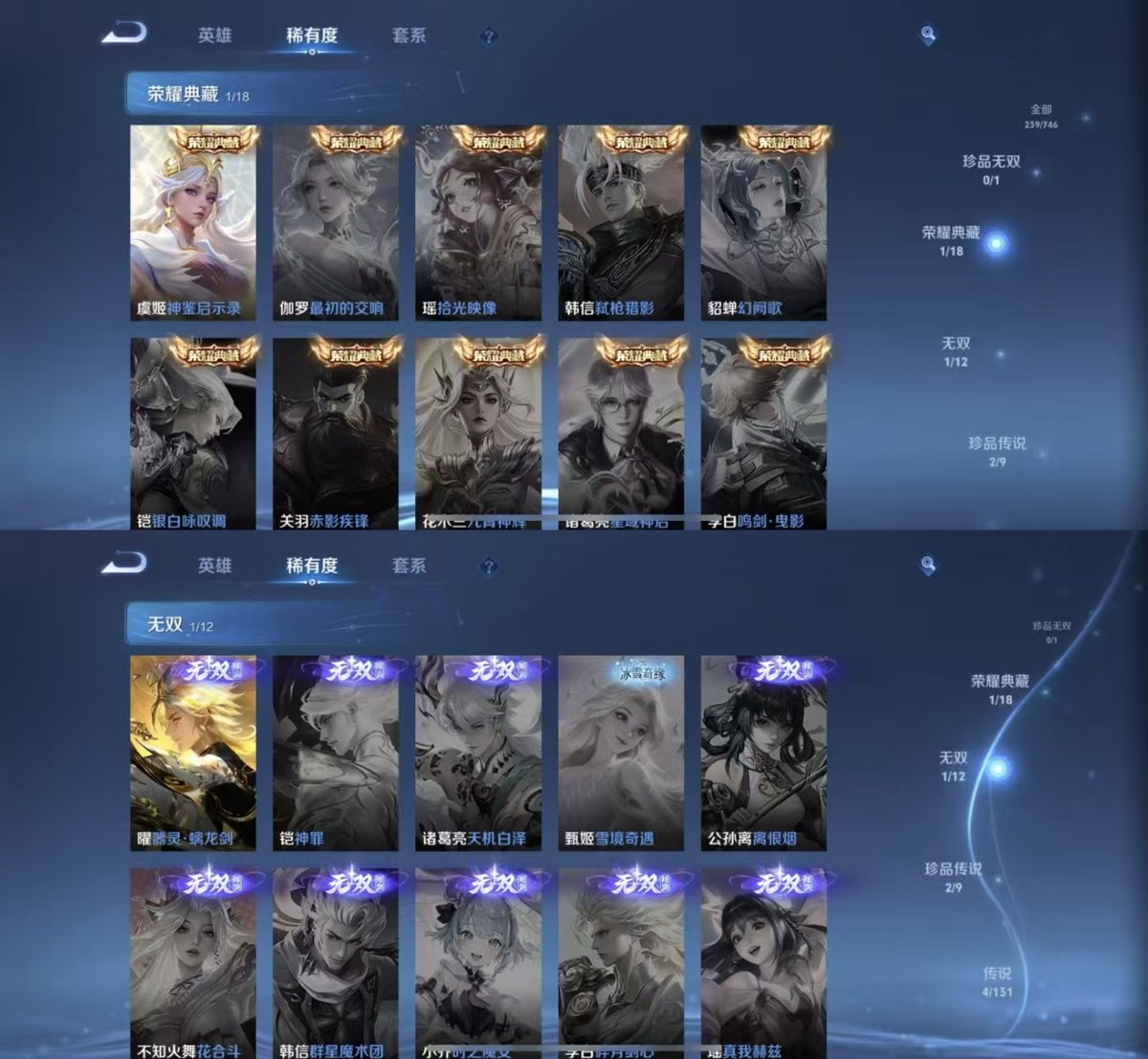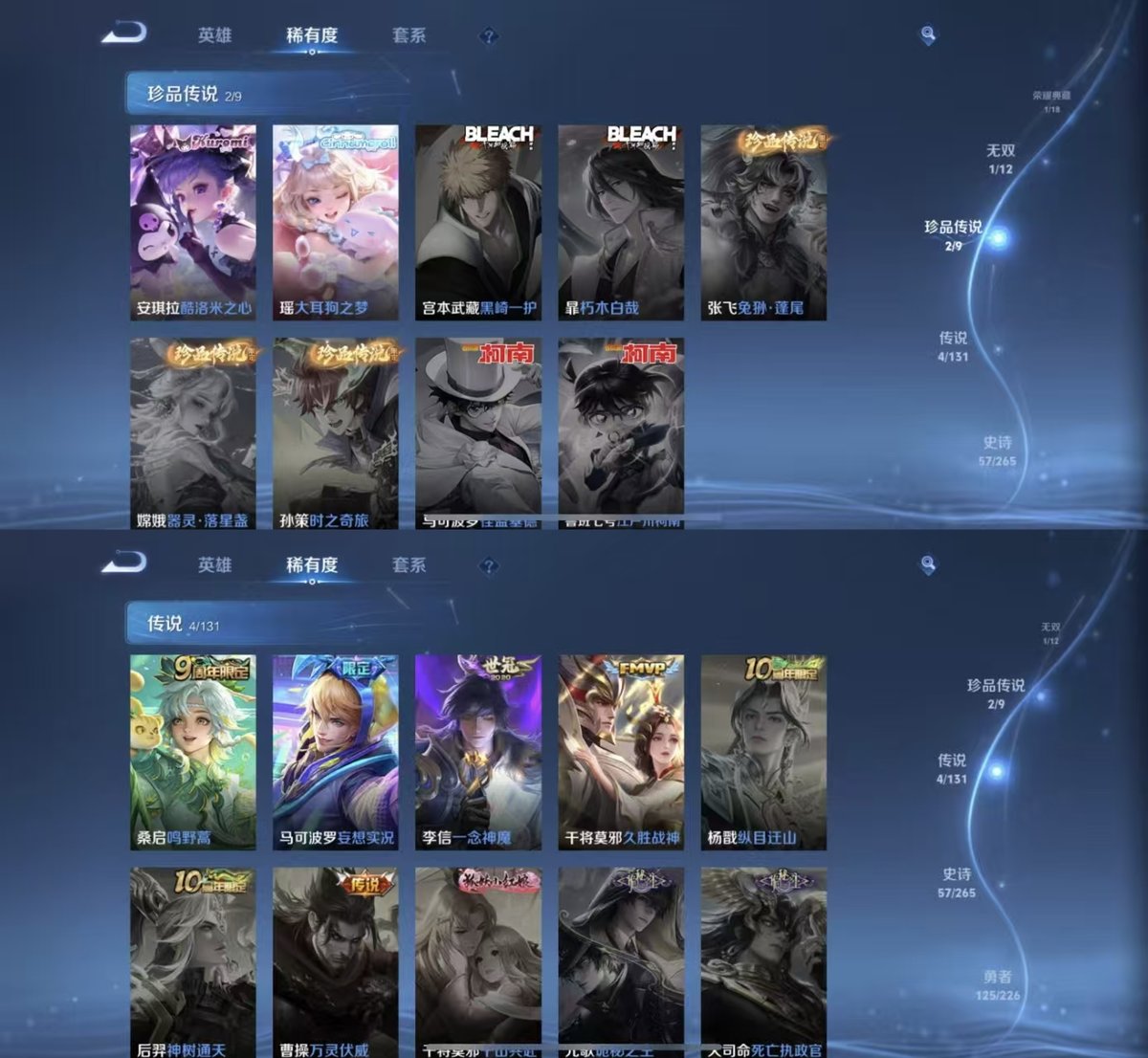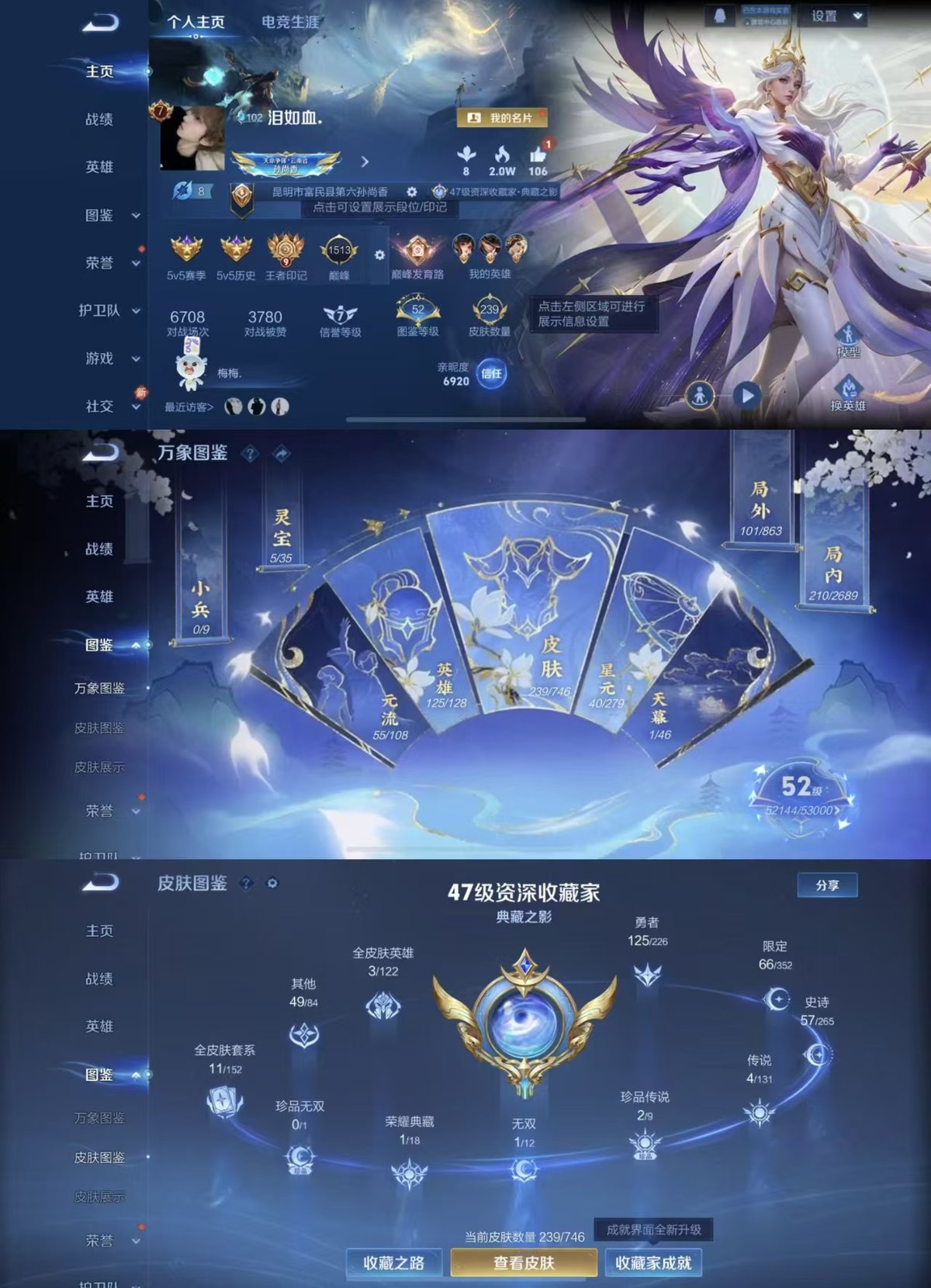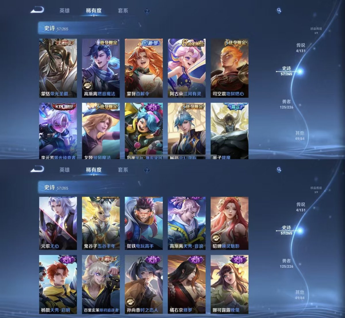 _2287386-实名:可修改贵族等级:v7英雄数:125皮肤数:239荣耀水晶:神鉴启示录无双皮:器灵·螭龙剑珍品传说:酷洛米之心大耳狗之梦传说皮:久胜战神一念神魔妄想实况限定皮:梁祝五谷丰年降魔鸣野蒿逐霄战戟