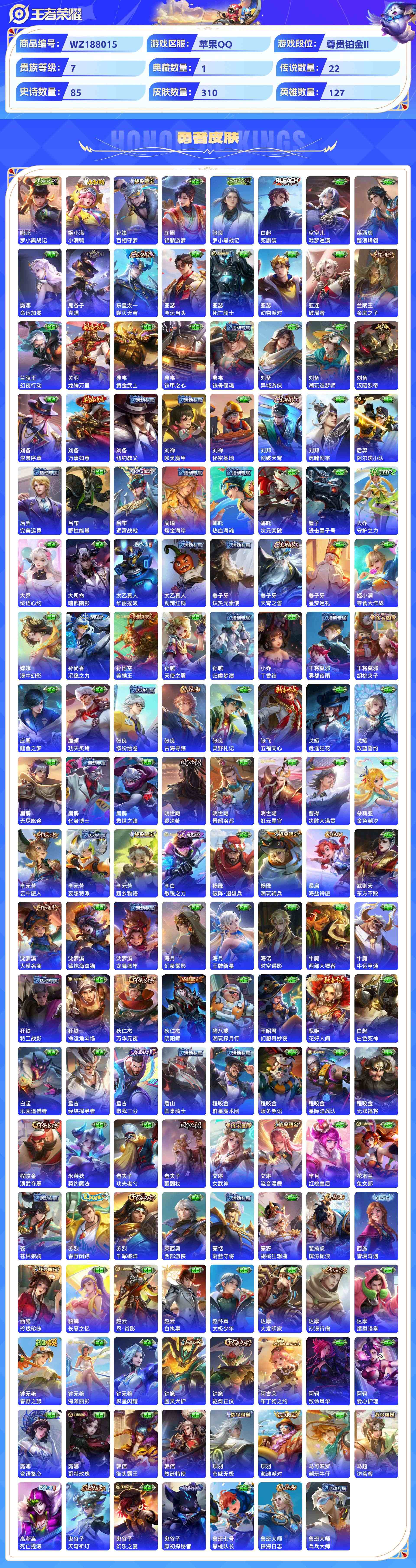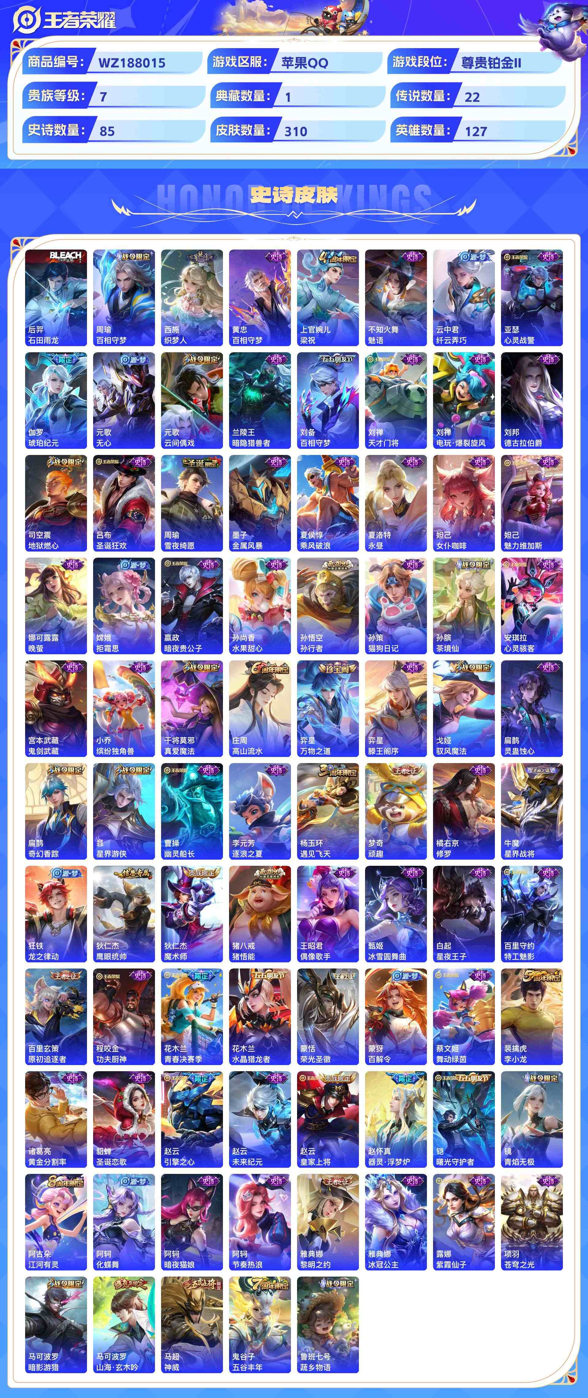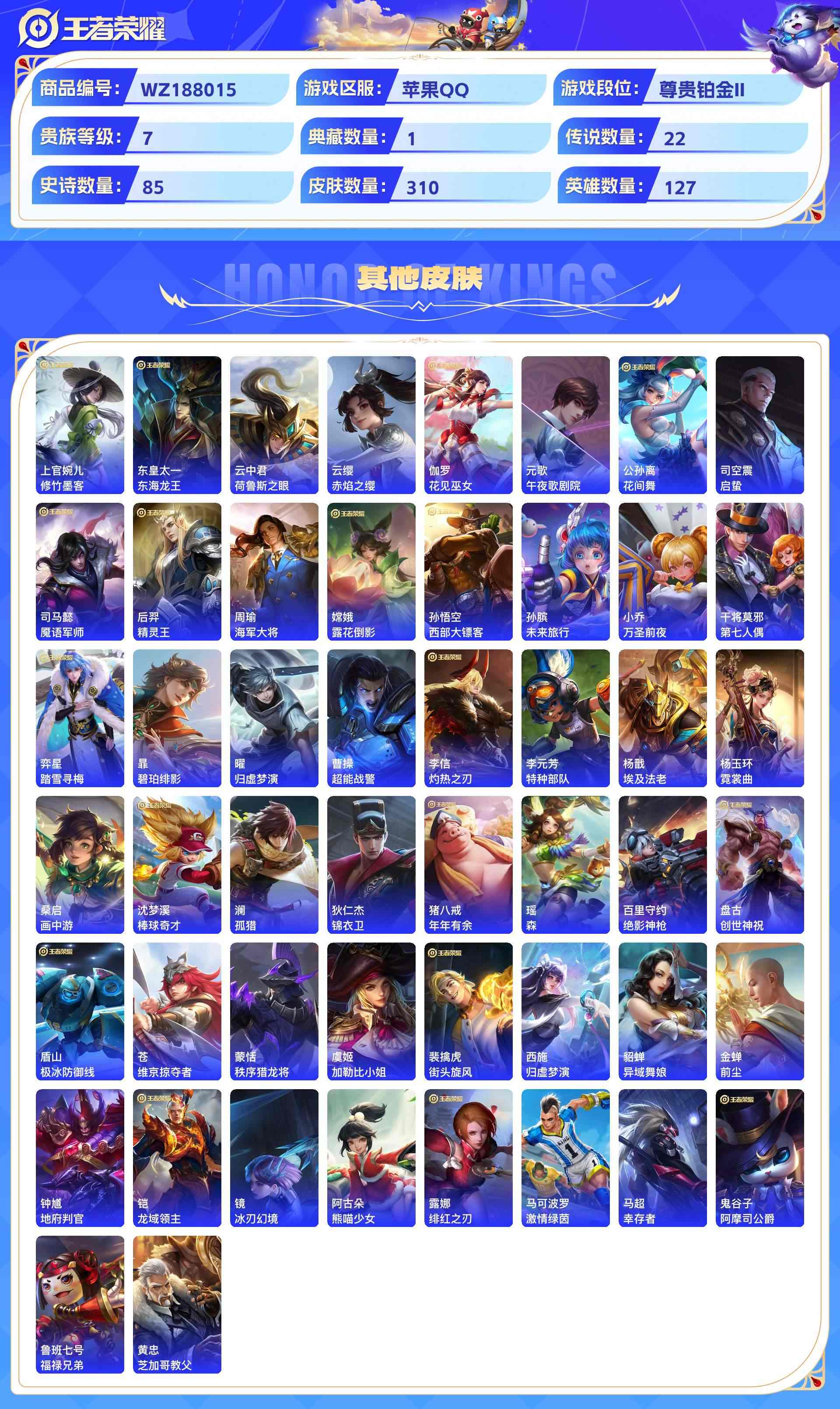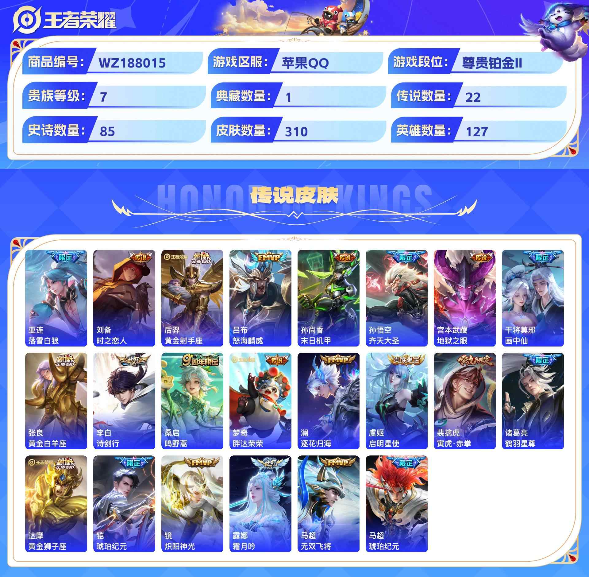 wz188015|精品号可二次【荣耀典藏】九霄神辉【传说皮肤】落雪白狼时之恋人黄金射手座怒海麟威末日机甲齐天大圣地狱之眼画中仙黄金白羊座诗剑行鸣野蒿胖达荣荣逐花归海启明星使苹果qq 贵族7级 310皮 1典藏 22传说 85史诗2星传说14个性按键