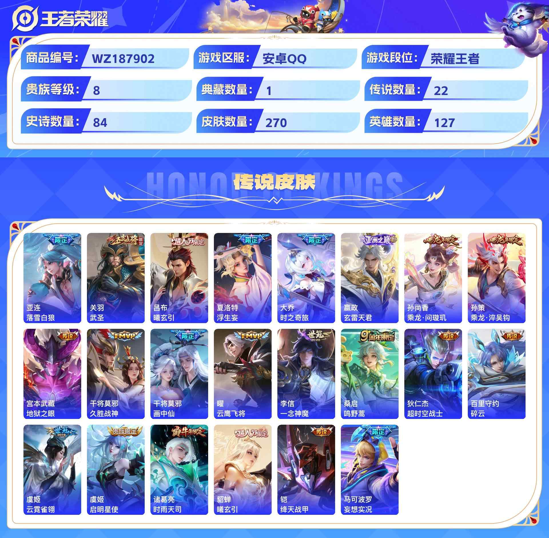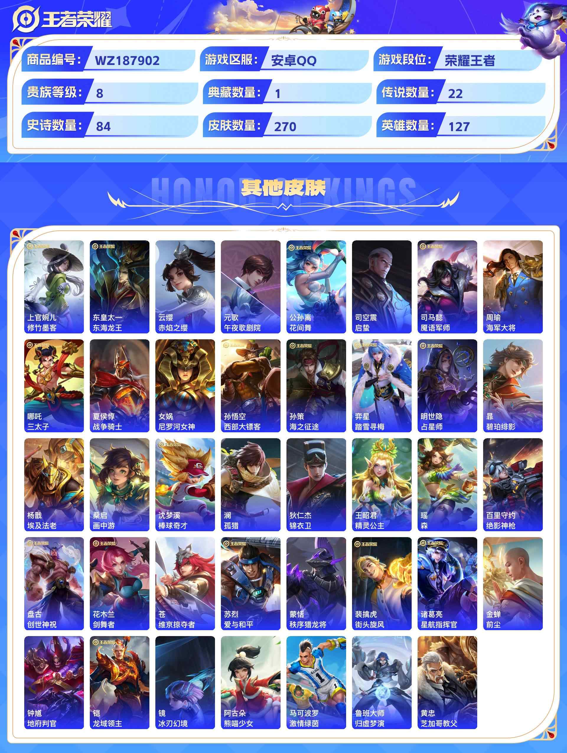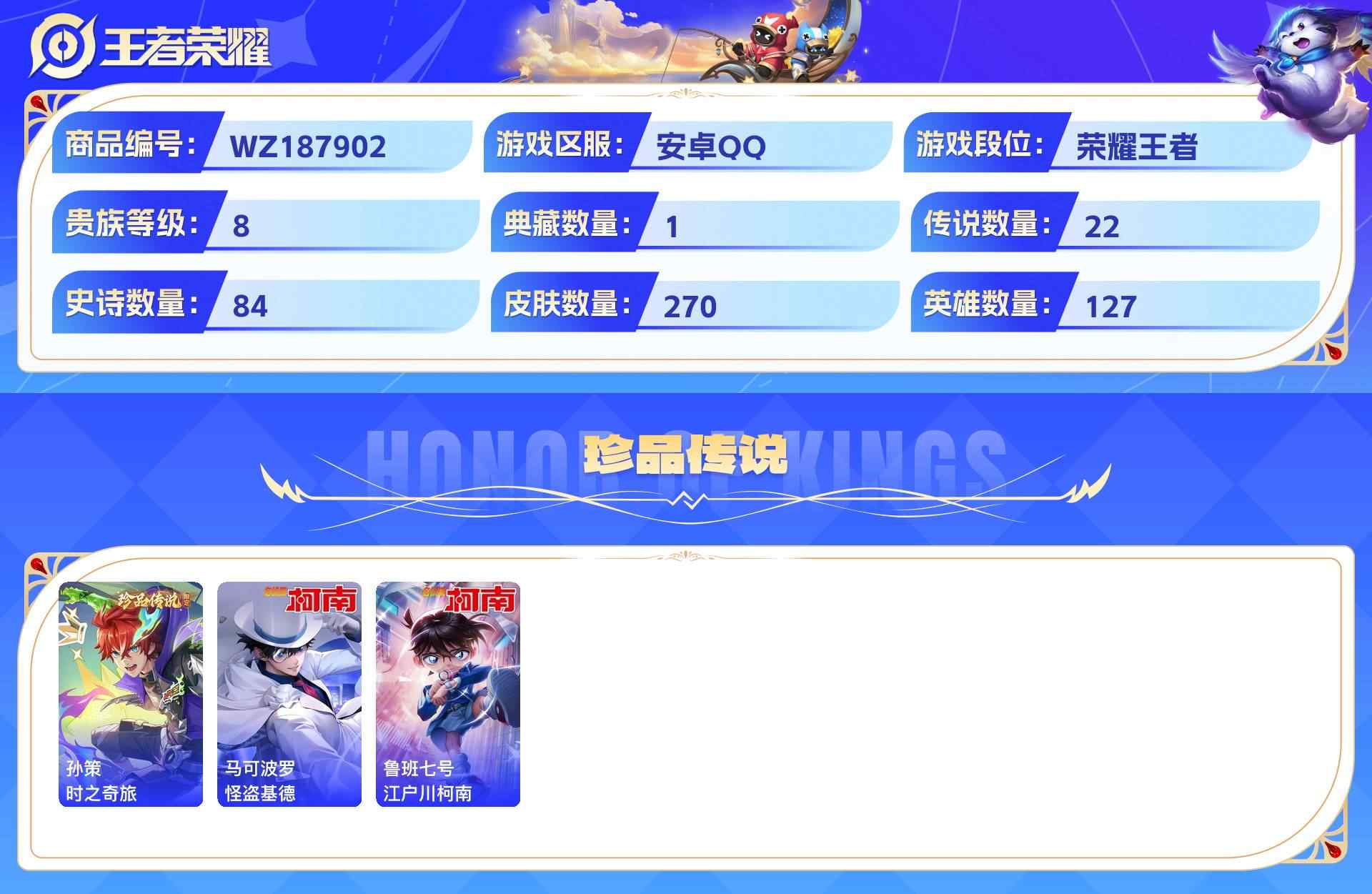 wz187902|精品号安卓qq 贵族8级 270皮 1典藏(鸣剑·曳影) 3珍品传说(时之奇旅怪盗基德江户川柯南) 22传说(落雪白狼武圣曦玄引浮生妄时之奇旅玄雷天君乘龙·问璇玑乘龙·淬吴钩地狱之眼) 84史诗2星传说10个性按键2天幕