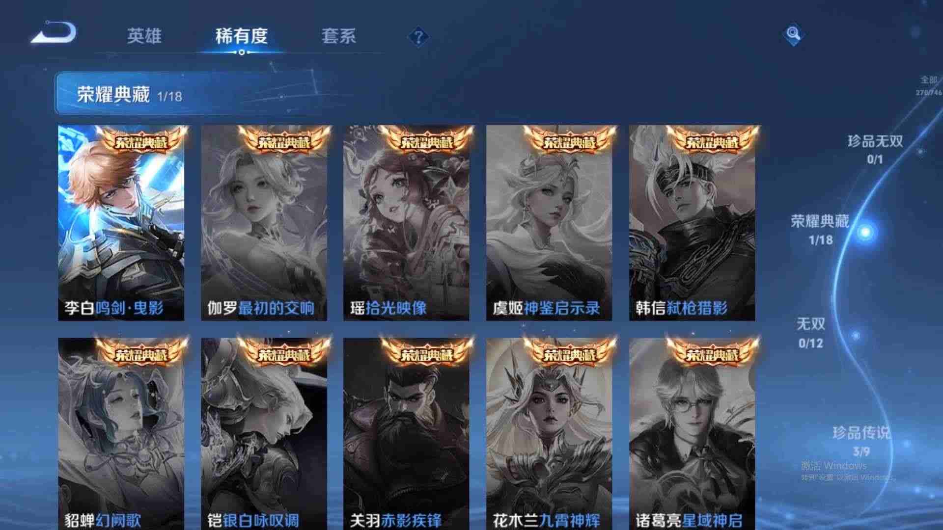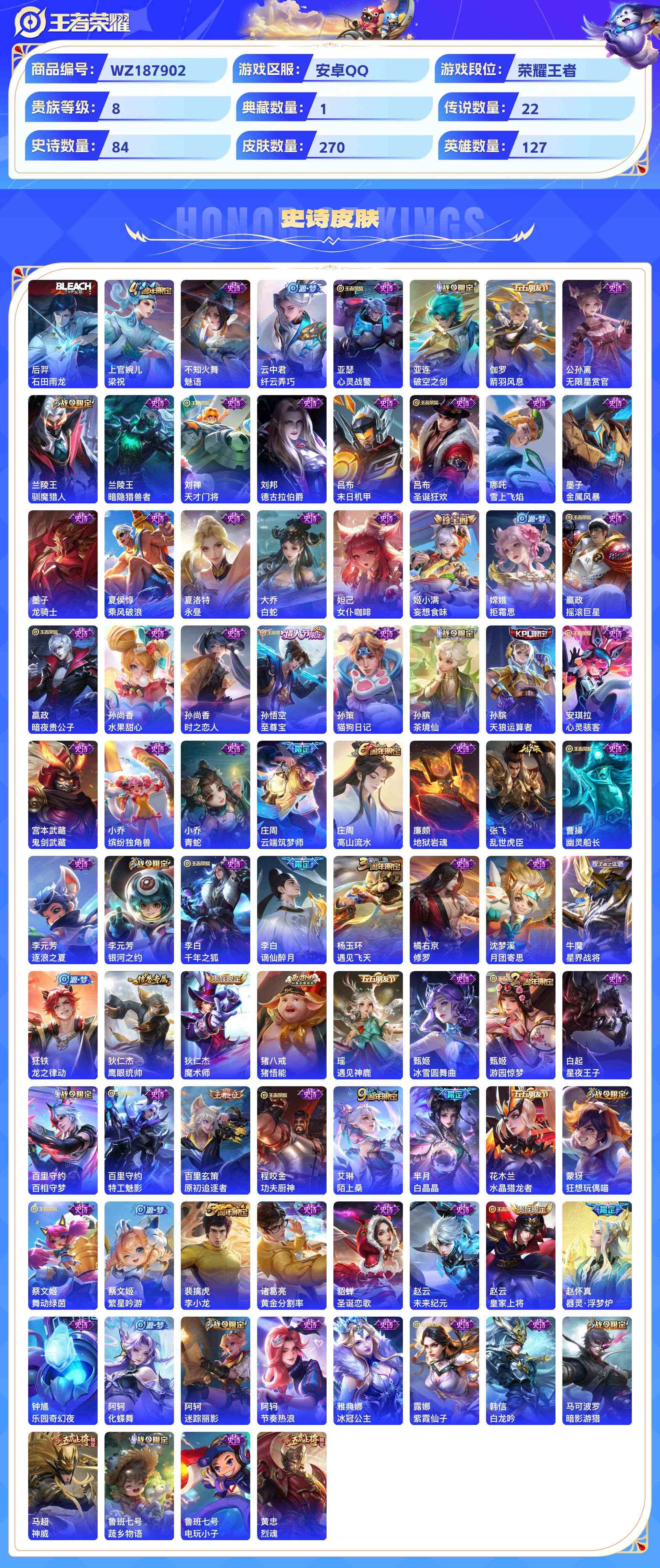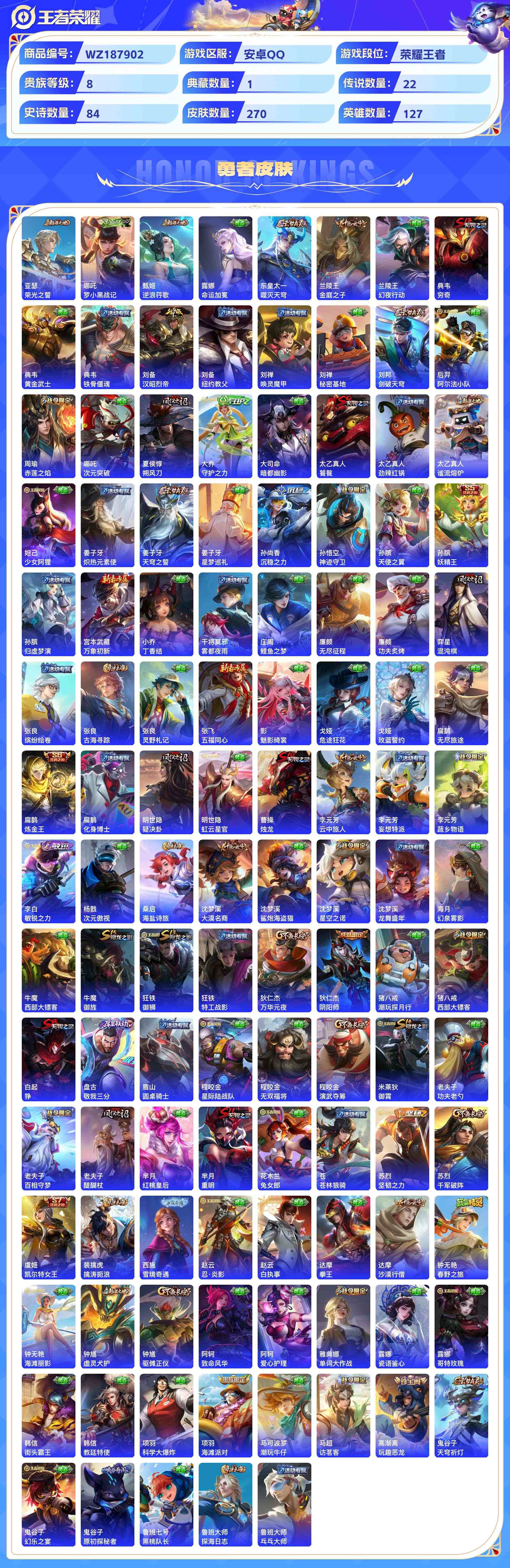 wz187902|精品号安卓qq 贵族8级 270皮 1典藏(鸣剑·曳影) 3珍品传说(时之奇旅怪盗基德江户川柯南) 22传说(落雪白狼武圣曦玄引浮生妄时之奇旅玄雷天君乘龙·问璇玑乘龙·淬吴钩地狱之眼) 84史诗2星传说10个性按键2天幕