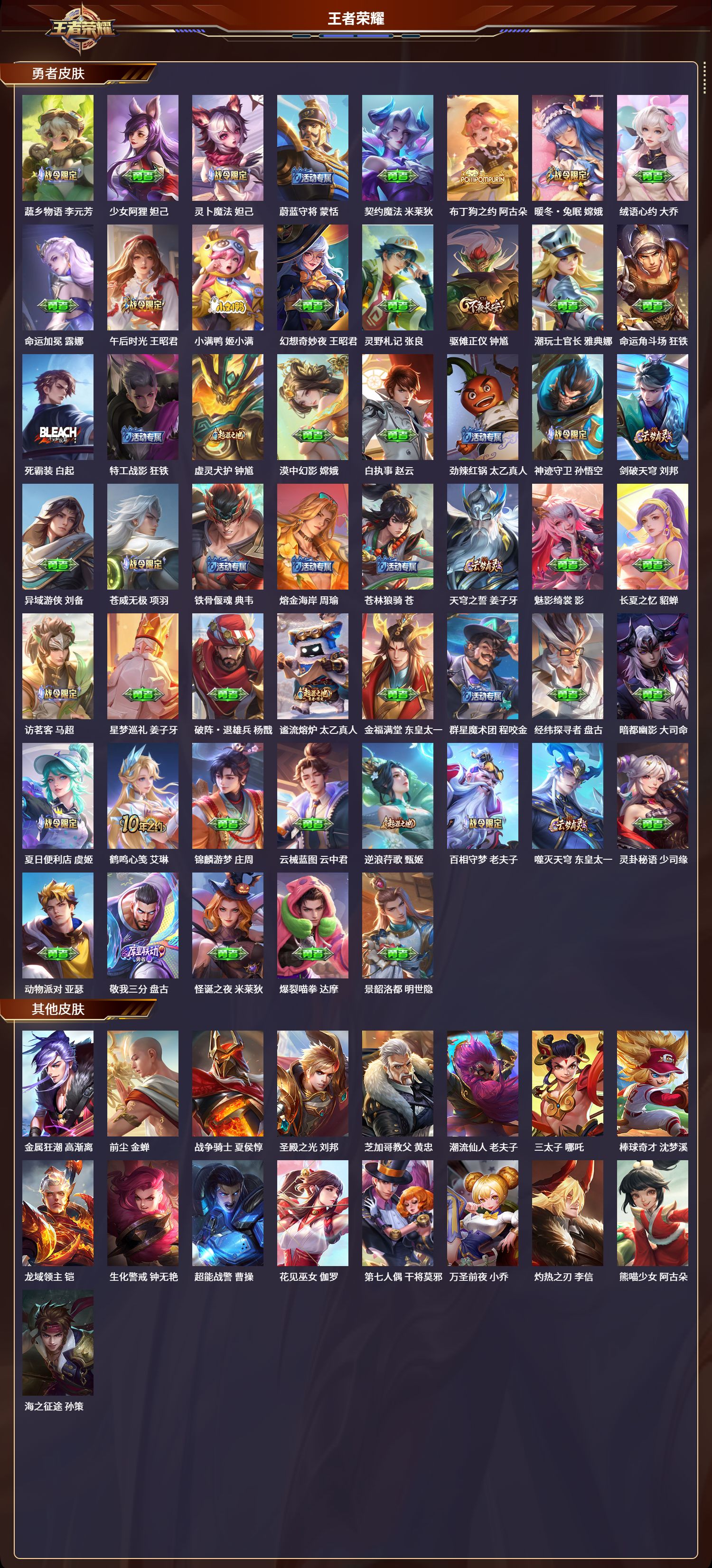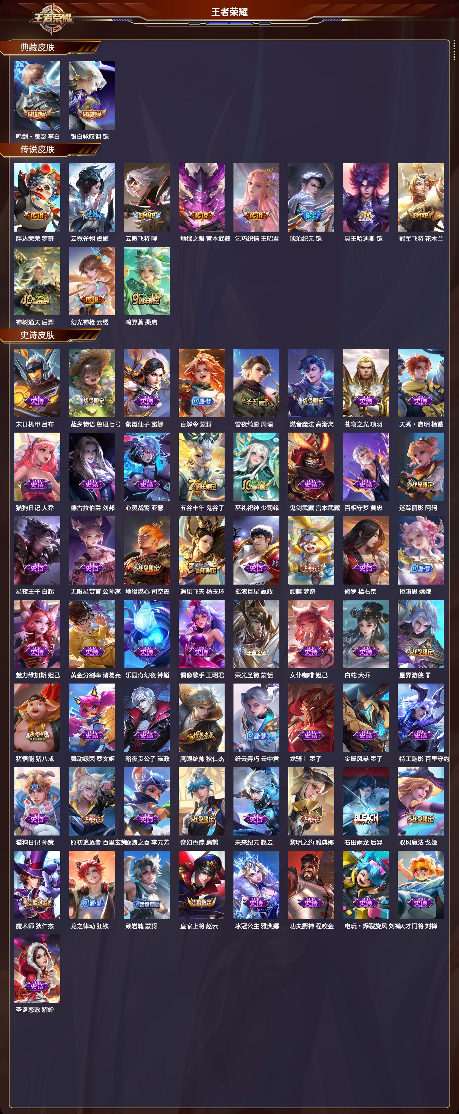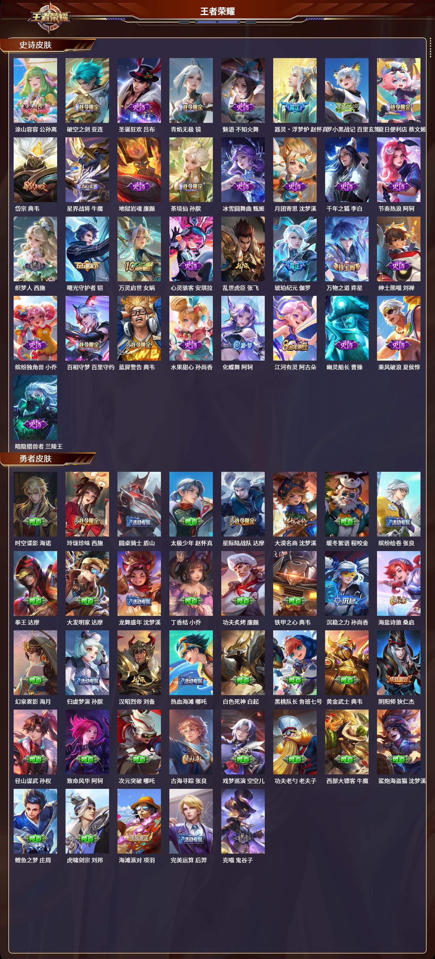 安卓qq/荣耀王者/321皮肤/127英雄/2典藏/0珍品无双/0无双/0珍品传说/11传说/90史诗/9稀有英雄【2 典藏皮肤】鸣剑·曳影 李白银白咏叹调 铠【11 传说皮肤】胖达荣荣 梦奇云霓雀翎 虞姬云鹰飞将 曜地狱之眼 宫本武藏乞巧织情 王昭君琥珀纪元 铠冥王哈迪斯 铠冠军飞将 花木兰神树通天 后羿幻光神呛 云缨鸣野蒿 桑启【90 史诗皮肤】末日机甲 吕布蔬乡物