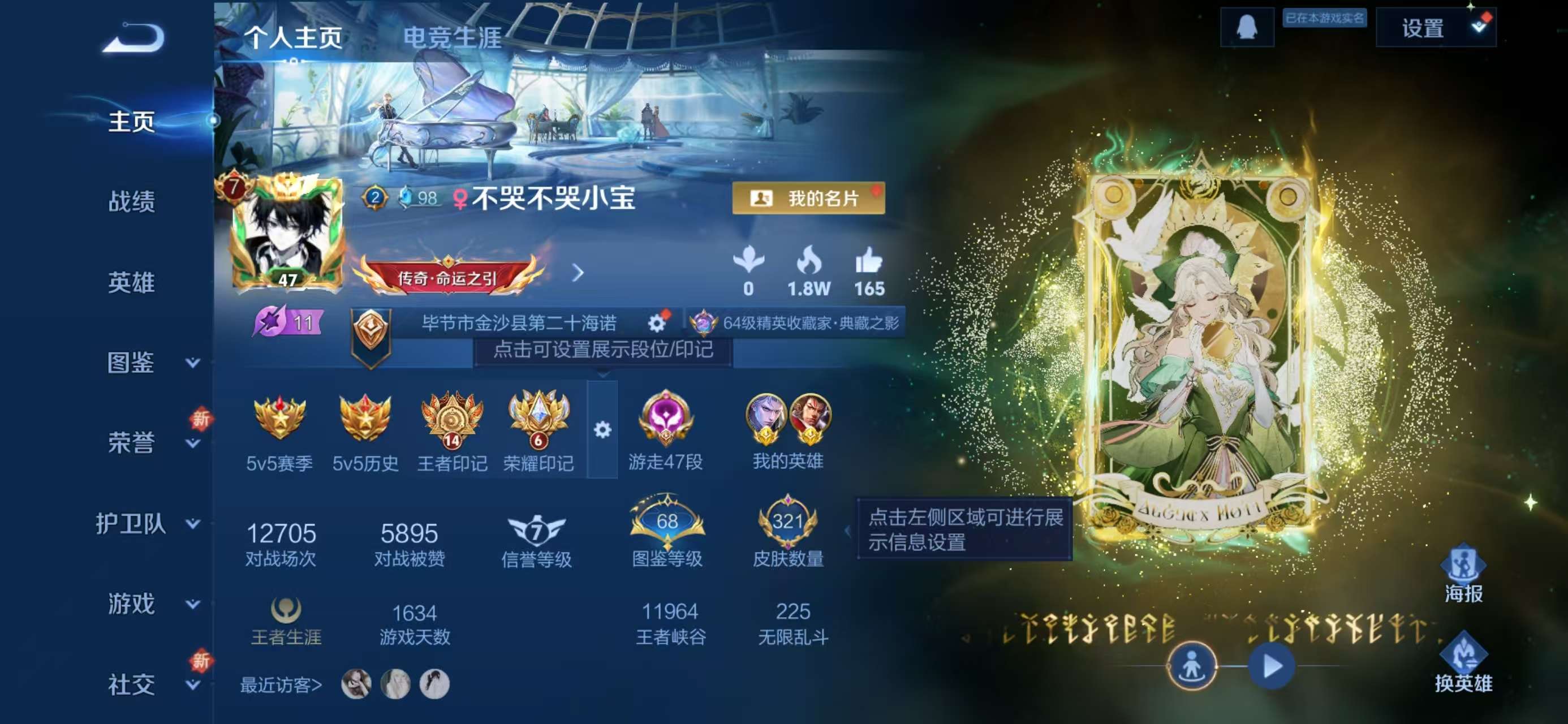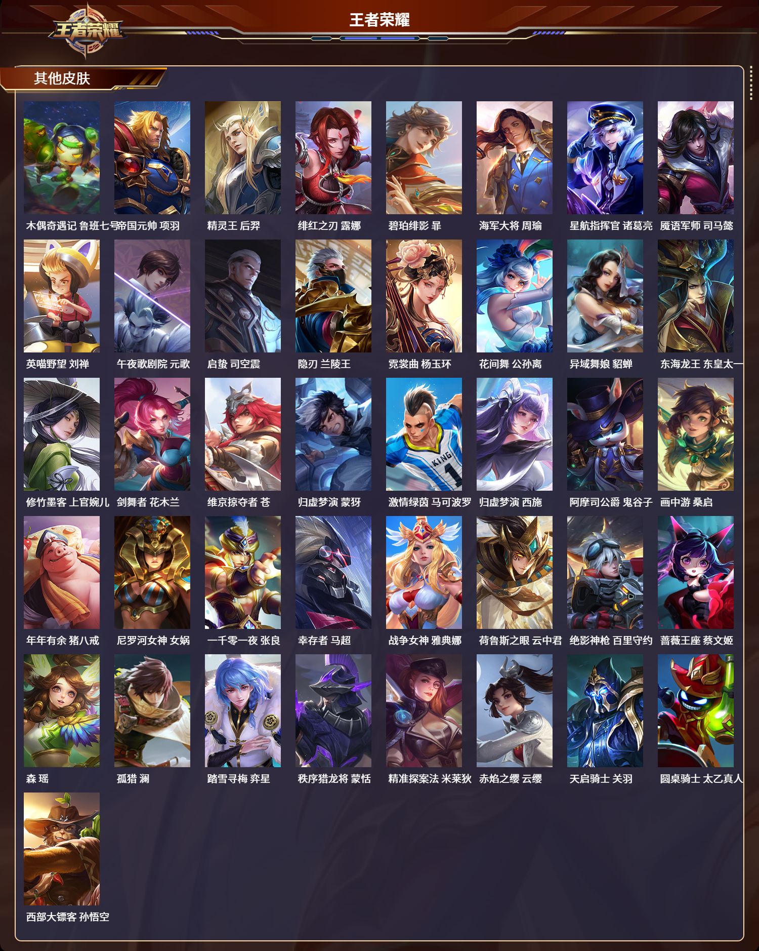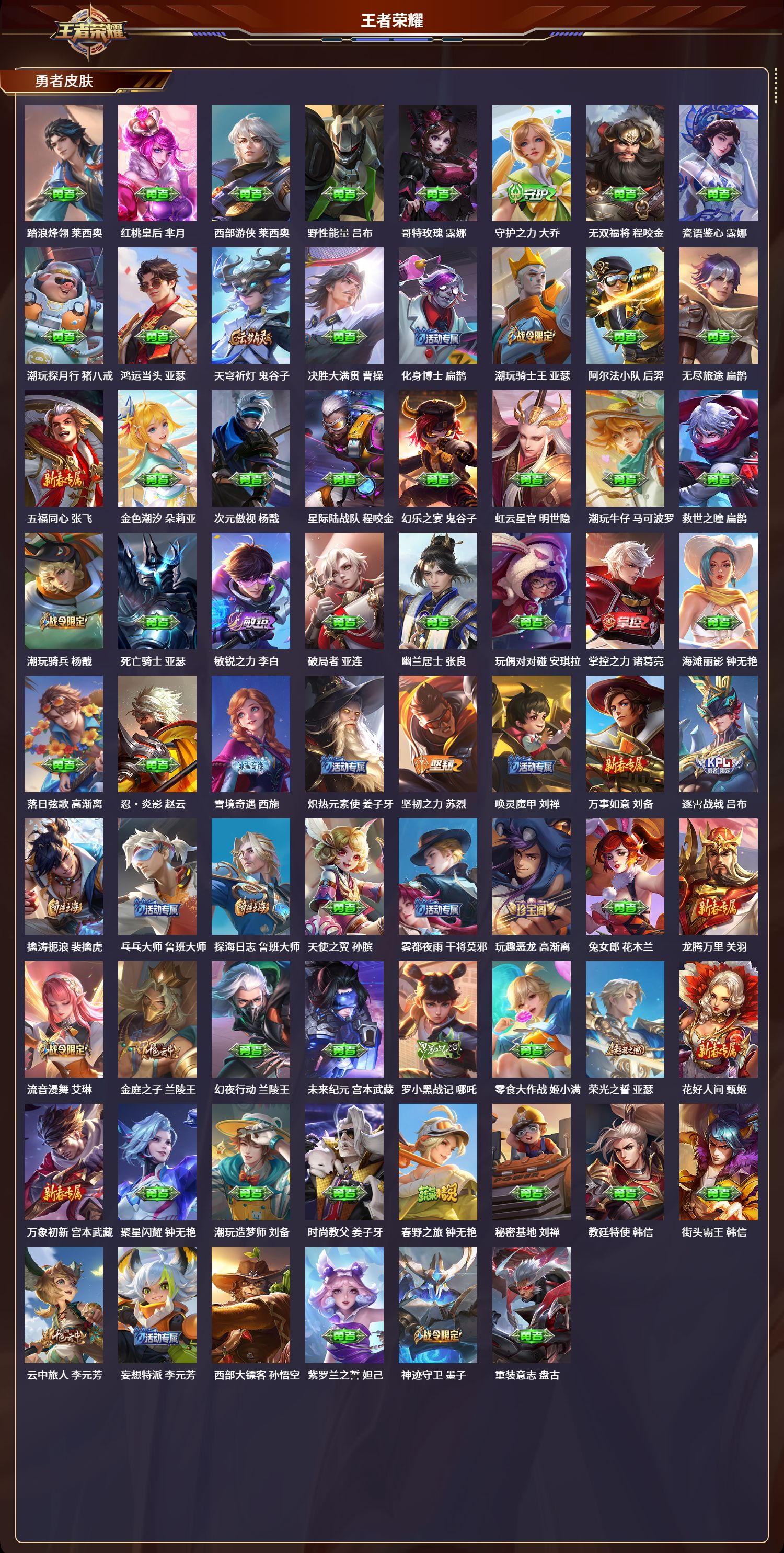 安卓qq/荣耀王者/321皮肤/127英雄/2典藏/0珍品无双/0无双/0珍品传说/11传说/90史诗/9稀有英雄【2 典藏皮肤】鸣剑·曳影 李白银白咏叹调 铠【11 传说皮肤】胖达荣荣 梦奇云霓雀翎 虞姬云鹰飞将 曜地狱之眼 宫本武藏乞巧织情 王昭君琥珀纪元 铠冥王哈迪斯 铠冠军飞将 花木兰神树通天 后羿幻光神呛 云缨鸣野蒿 桑启【90 史诗皮肤】末日机甲 吕布蔬乡物