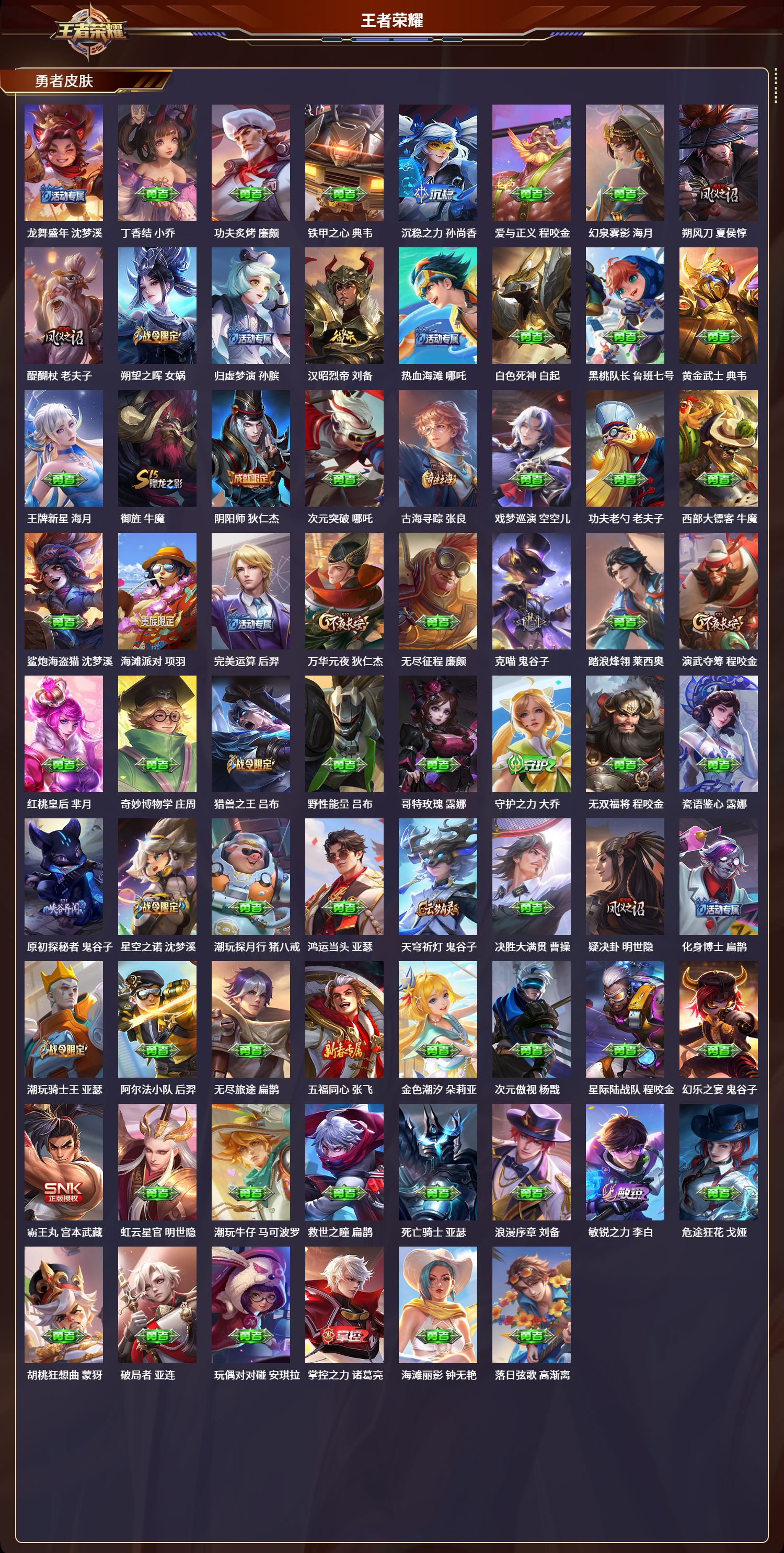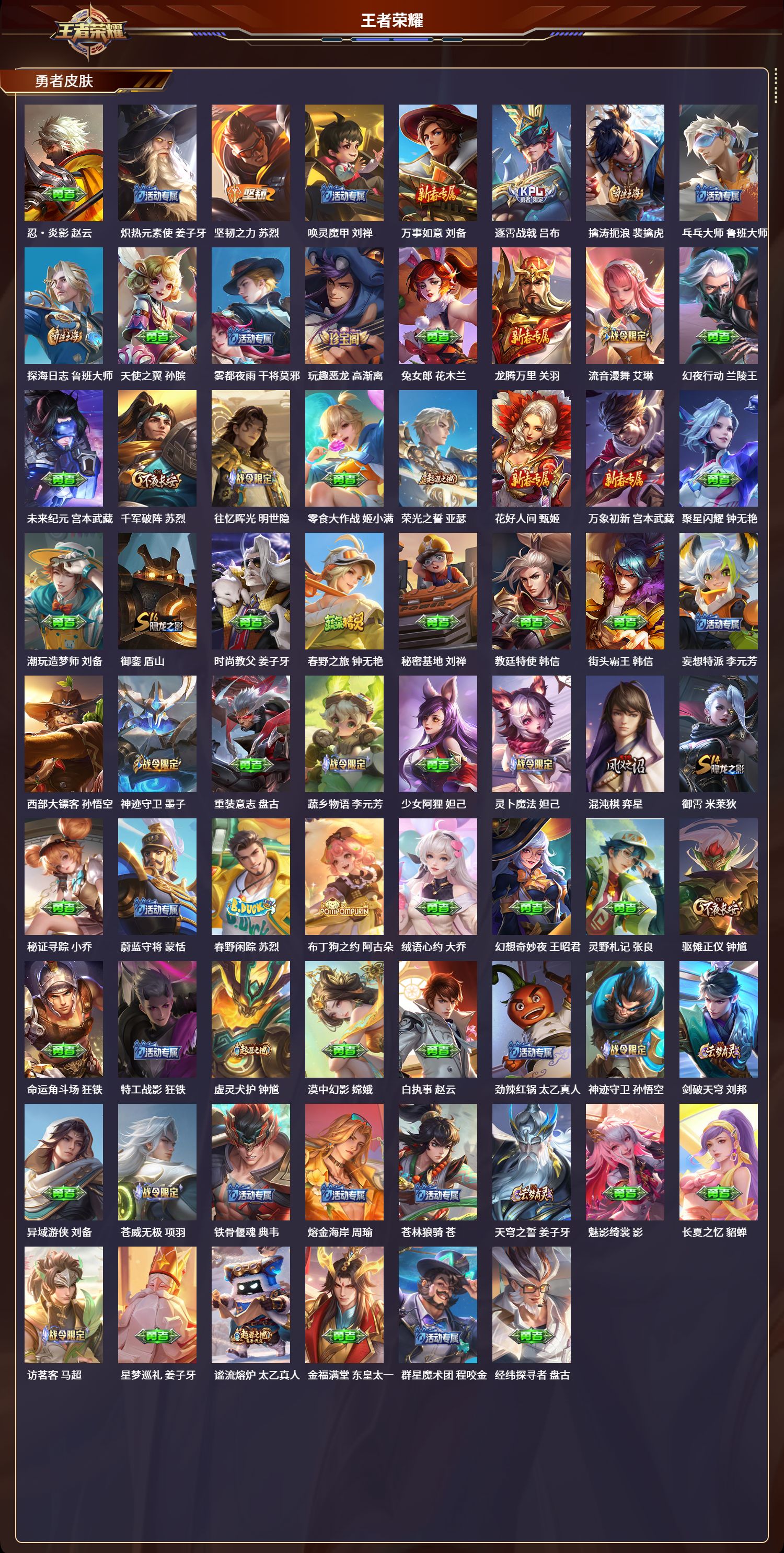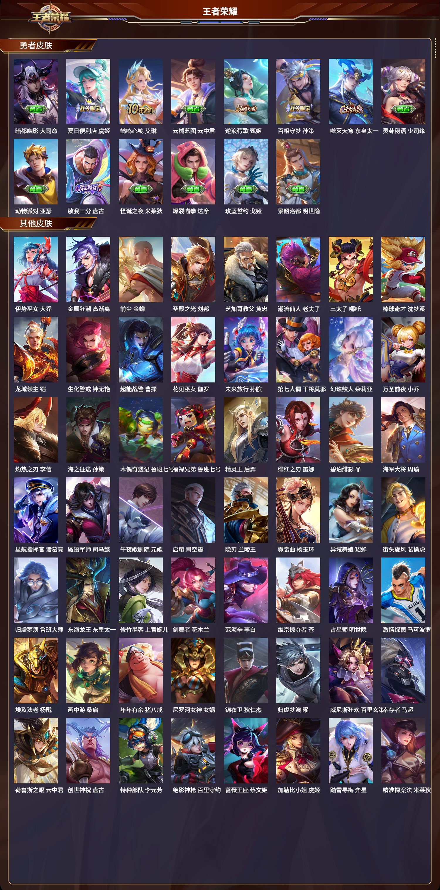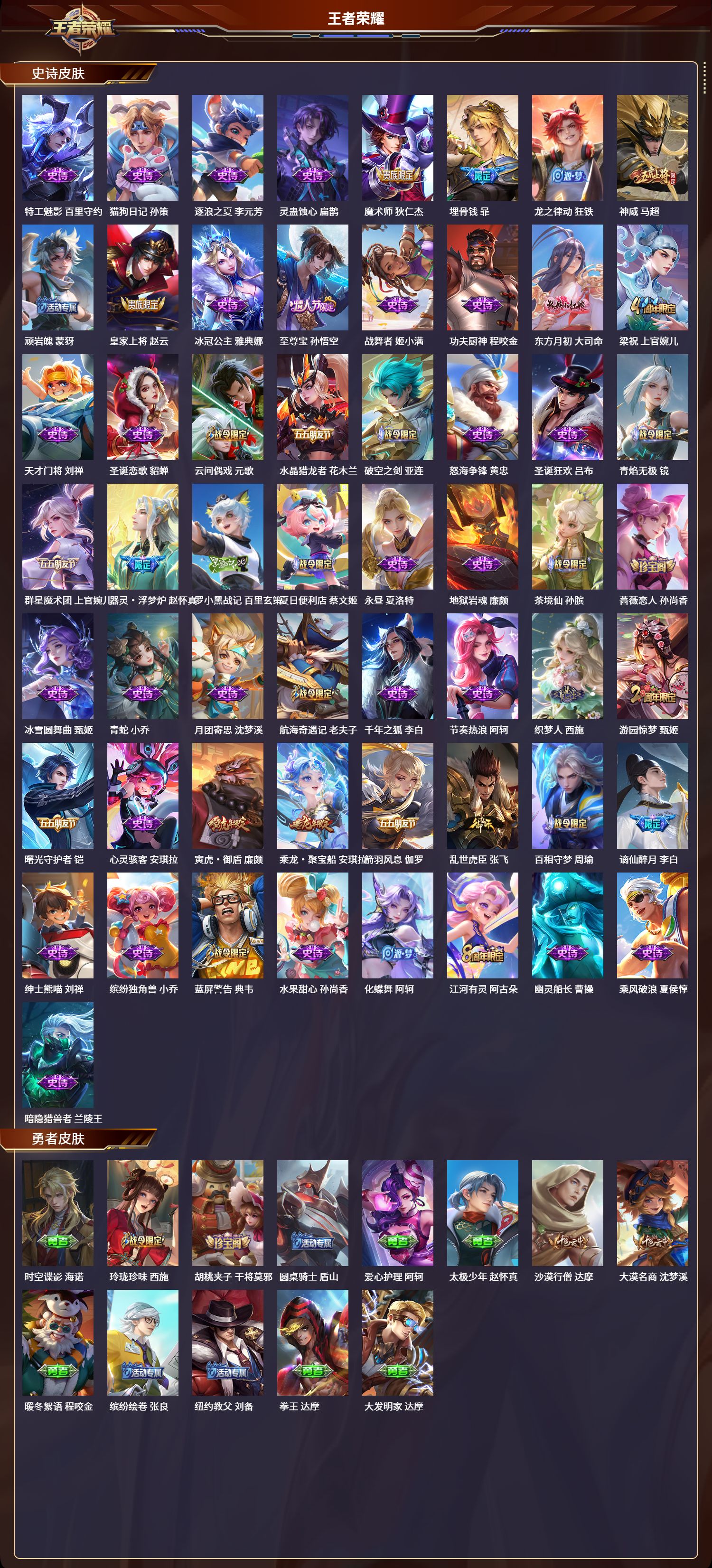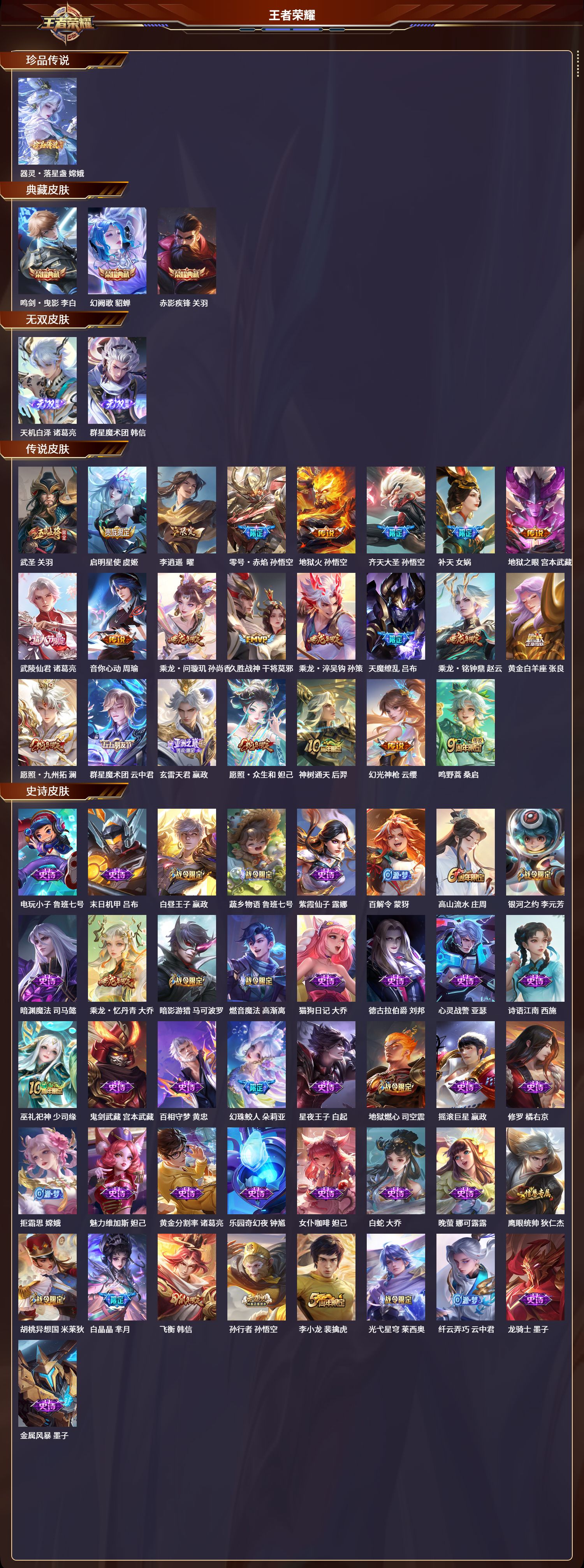 安卓qq/无双王者/355皮肤/127英雄/3典藏/0珍品无双/2无双/1珍品传说/23传说/98史诗/9稀有英雄【1 珍品传说】器灵·落星盏 嫦娥【3 典藏皮肤】鸣剑·曳影 李白幻阙歌 貂蝉赤影疾锋 关羽【2 无双皮肤】天机白泽 诸葛亮群星魔术团 韩信【23 传说皮肤】武圣 关羽启明星使 虞姬李 曜零号·赤焰 孙悟空地狱火 孙悟空齐天大圣 孙悟空补天 女娲地狱之眼