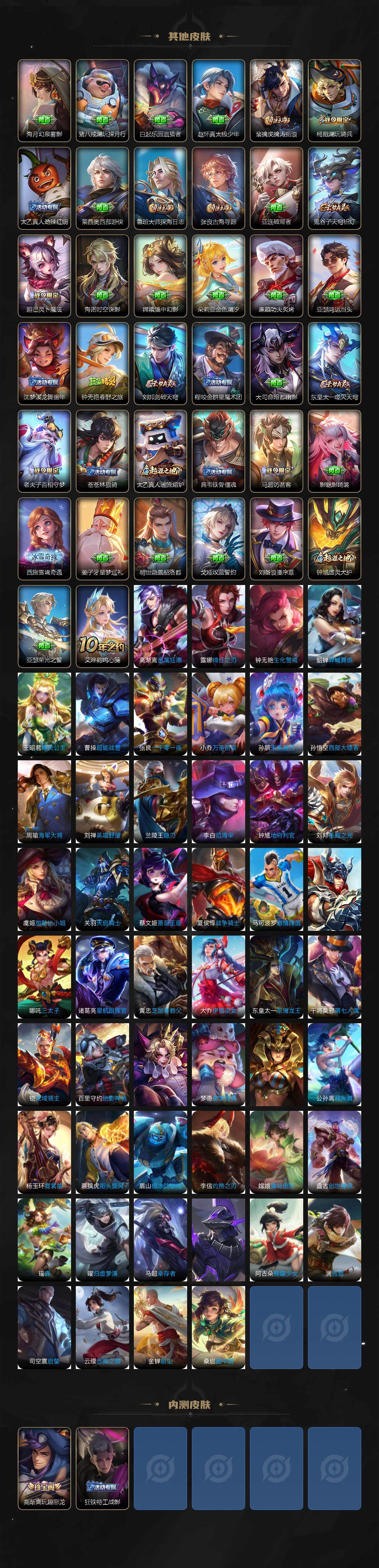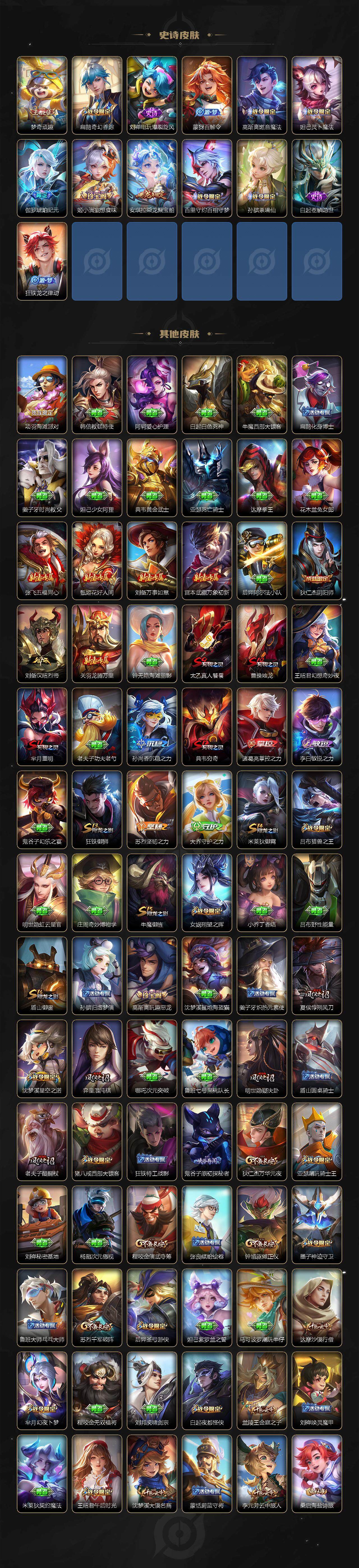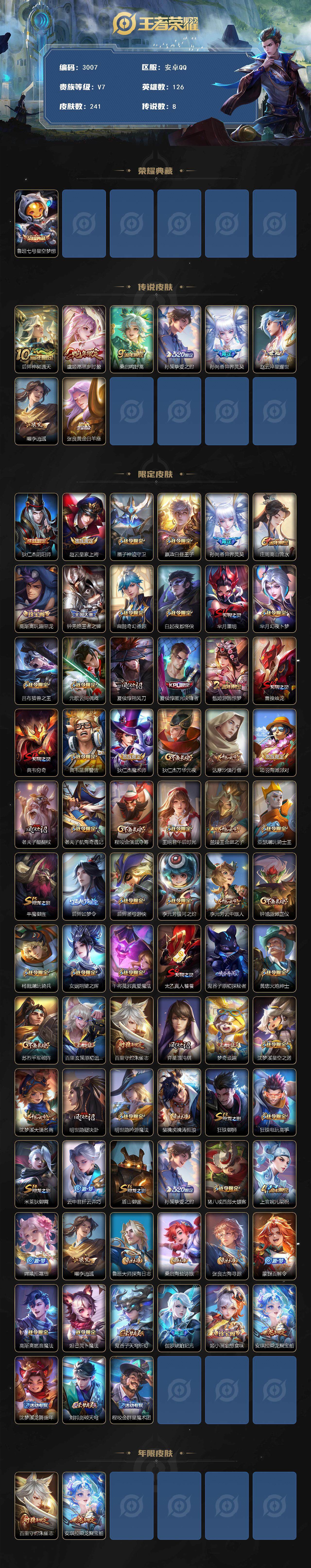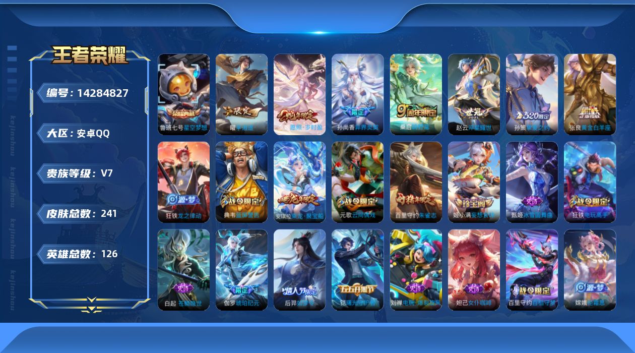 [14284827]安卓q-v7-最强王者段位-126英雄-241皮肤-1典藏-0珍品无双-0无双-0珍品传说-8传说-60史诗 【英雄全皮】:影全皮 【荣耀典藏】:鲁班七号星空梦想 【传说皮肤】:后羿神树通天,虞姬愿照岁时盈,桑启鸣野蒿,孙策挚爱之约,孙尚香异界灵契,赵云淬星耀世,曜李 ,张良黄金白羊座 【限定皮肤】:狄仁杰阴阳师,赵云皇家上将,墨子神迹守卫,嬴政白昼王子,孙尚香异界灵契,庄周高山流水,高渐离玩趣恶龙,钟无艳王者之锤,扁鹊奇幻香踪,白起夜都怪侠,芈月重明,芈月幻夜卜梦,吕布猎兽之王,元歌云间偶戏,夏侯惇朔风刀,夏侯惇匿光决锋者,甄姬游园惊梦,曹操烛龙,典韦穷奇,典韦蓝屏警告,狄仁杰魔术师,狄仁杰万华元夜,达摩沙漠行僧,项羽海滩派对,老夫子醍醐杖,老夫子航海奇遇记,程咬金演武夺筹,王昭君午后时光,兰陵王金庭之子,亚瑟潮玩骑士王,牛魔御旌,后羿如梦令,后羿圣弓游侠,李元芳银河之约,李元芳云中旅人,钟馗驱傩正仪,杨戬潮玩骑兵,女娲朔望之晖,干将莫邪真爱魔法,太乙真人饕餮,鬼谷子原初探秘者,黄忠火炮绅士,苏烈千军破阵,百里玄策原初追逐者,百里守约朱雀志,弈星混沌棋,梦奇顽趣,沈梦溪星空之诺,沈梦溪大漠名商,明世隐疑决卦,明世隐吟游魔法,裴擒虎擒涛扼浪,狂铁御狮,狂铁电玩高手,米莱狄御霄,云中君纤云弄巧,盾山御銮,孙策挚爱之约,猪八戒西部大镖客,上官婉儿梁祝,嫦娥拒霜思,曜李 ,鲁班大师探海日志,桑启海盐诗旅,张良古海寻踪,蒙犽百解令,高渐离燃音魔法,妲己灵卜魔法,鬼谷子天穹祈灯,伽罗琥珀纪元,姬小满妄想食味,安琪拉乘龙聚宝船,沈梦溪龙舞盛年,刘邦剑破天穹,程咬金群星魔术团 【年限皮肤】:百里守约朱雀志,安琪拉乘龙聚宝船 【赛季限定】:芈月重明,夏侯惇朔风刀,曹操烛龙,典韦穷奇,狄仁杰万华元夜,达摩沙漠行僧,老夫子醍醐杖,程咬金演武夺筹,兰陵王金庭之子,张良古海寻踪,牛魔御旌,李元芳云中旅人,钟馗驱傩正仪,太乙真人饕餮,鬼谷子原初探秘者,苏烈千军破阵,百里玄策原初追逐者,弈星混沌棋,梦奇顽趣,沈梦溪大漠名商,明世隐疑决卦,裴擒虎擒涛扼浪,狂铁御狮,米莱狄御霄,盾山御銮,鲁班大师探海日志,桑启海盐诗旅,鬼谷子天穹祈灯,刘邦剑破天穹 【战令限定】:墨子神迹守卫,嬴政白昼王子,扁鹊奇幻香踪,白起夜都怪侠,芈月幻夜卜梦,吕布猎兽之王,元歌云间偶戏,典韦蓝屏警告,老夫子航海奇遇