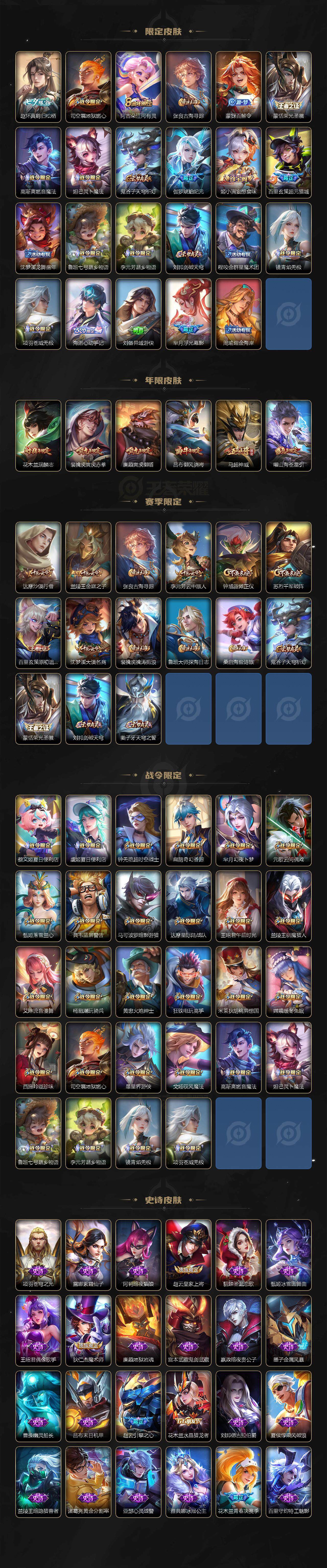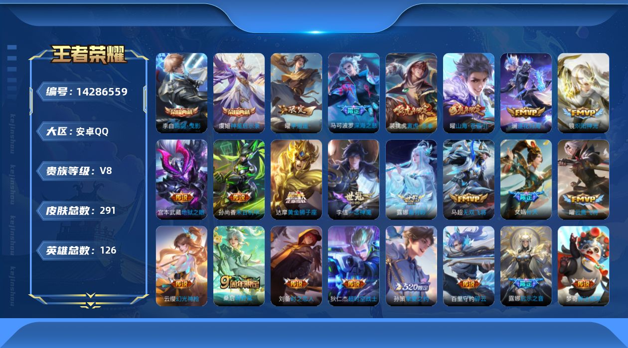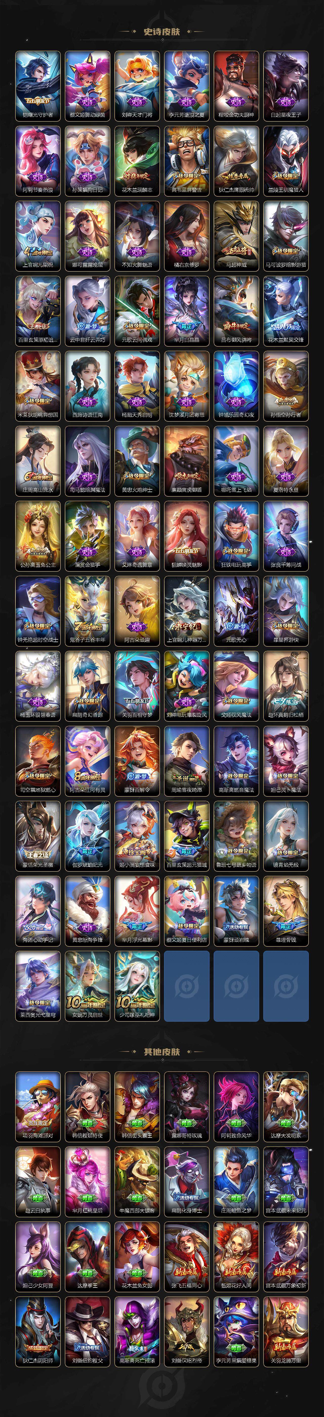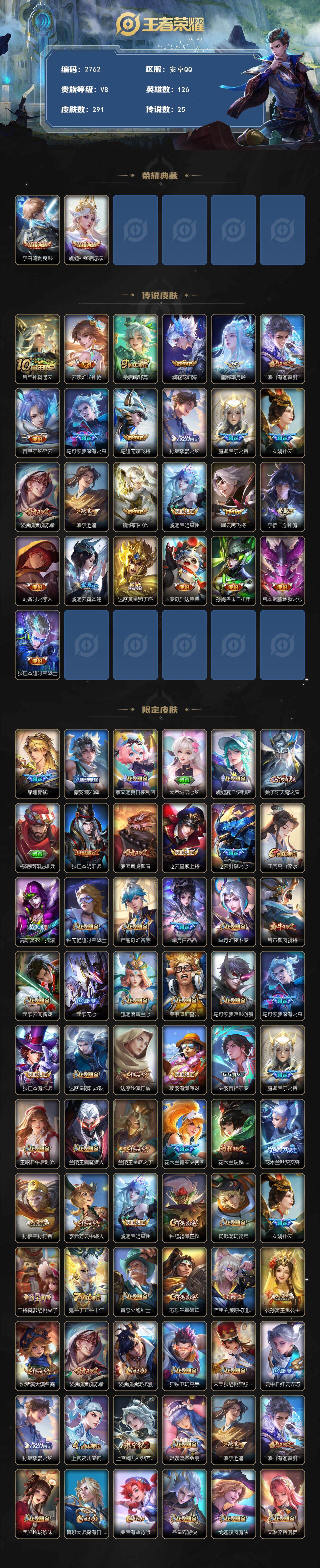 [14286559]安卓q-v8-最强王者段位-126英雄-291皮肤-2典藏-0珍品无双-0无双-0珍品传说-25传说-98史诗 【英雄全皮】:孙权全皮,蒙恬全皮,海诺全皮 【荣耀典藏】:李白鸣剑曳影,虞姬神鉴启示录 【传说皮肤】:后羿神树通天,云缨幻光神呛,桑启鸣野蒿,澜逐花归海,露娜霜月吟,曜山海苍雷引,百里守约碎云,马可波罗深海之息,马超无双飞将,孙策挚爱之约,露娜启示之音,女娲补天,裴擒虎寅虎赤拳,曜李 ,镜炽阳神光,虞姬启明星使,曜云鹰飞将,李信一念神魔,刘备时之恋人,虞姬云霓雀翎,达摩黄金狮子座,梦奇胖达荣荣,孙尚香末日机甲,宫本武藏地狱之眼,狄仁杰超时空战士 【限定皮肤】:暃埋骨钱,蒙犽顽岩魄,蔡文姬夏日便利店,大乔绒语心约,虞姬夏日便利店,姜子牙天穹之誓,杨戬破阵退雄兵,狄仁杰阴阳师,廉颇寅虎御盾,赵云皇家上将,赵云引擎之心,庄周高山流水,高渐离死亡摇滚,钟无艳超时空战士,扁鹊奇幻香踪,芈月白晶晶,芈月幻夜卜梦,吕布御风骁将,元歌云间偶戏,元歌无心,甄姬落雪兰心,典韦蓝屏警告,马可波罗暗影游猎,马可波罗深海之息,狄仁杰魔术师,达摩星际陆战队,达摩沙漠行僧,项羽海滩派对,关羽百相守梦,露娜启示之音,王昭君午后时光,兰陵王驯魔猎人,兰陵王金庭之子,花木兰青春决赛季,花木兰瑞麟志,花木兰默契交锋,孙悟空孙行者,李元芳云中旅人,虞姬启明星使,钟馗驱傩正仪,杨戬潮玩骑兵,女娲补天,干将莫邪胡桃夹子,鬼谷子五谷丰年,黄忠火炮绅士,苏烈千军破阵,百里玄策原初追逐者,公孙离玉兔公主,沈梦溪大漠名商,裴擒虎寅虎赤拳,裴擒虎擒涛扼浪,狂铁电玩高手,米莱狄胡桃异想国,云中君纤云弄巧,孙策挚爱之约,上官婉儿梁祝,上官婉儿神器万象笔,嫦娥暖冬兔眠,曜李 ,曜山海苍雷引,西施玲珑珍味,鲁班大师探海日志,桑启海盐诗旅,暃星界游侠,戈娅驭风魔法,艾琳流音漫舞,赵怀真鹤归松栖,司空震地狱燃心,阿古朵江河有灵,张良古海寻踪,蒙犽百解令,蒙恬荣光圣徽,高渐离燃音魔法,妲己灵卜魔法,鬼谷子天穹祈灯,伽罗琥珀纪元,姬小满妄想食味,百里玄策超元猎域,沈梦溪龙舞盛年,鲁班七号蔬乡物语,李元芳蔬乡物语,刘邦剑破天穹,程咬金群星魔术团,镜青焰无极,项羽苍威无极,海诺心动手记,刘备异域游侠,芈月浮光幕影,周瑜熔金海岸 【年限皮肤】:花木兰瑞麟志,裴擒虎寅虎赤拳,廉颇寅虎御盾,吕布御风骁将,马超神威,曜山海苍雷