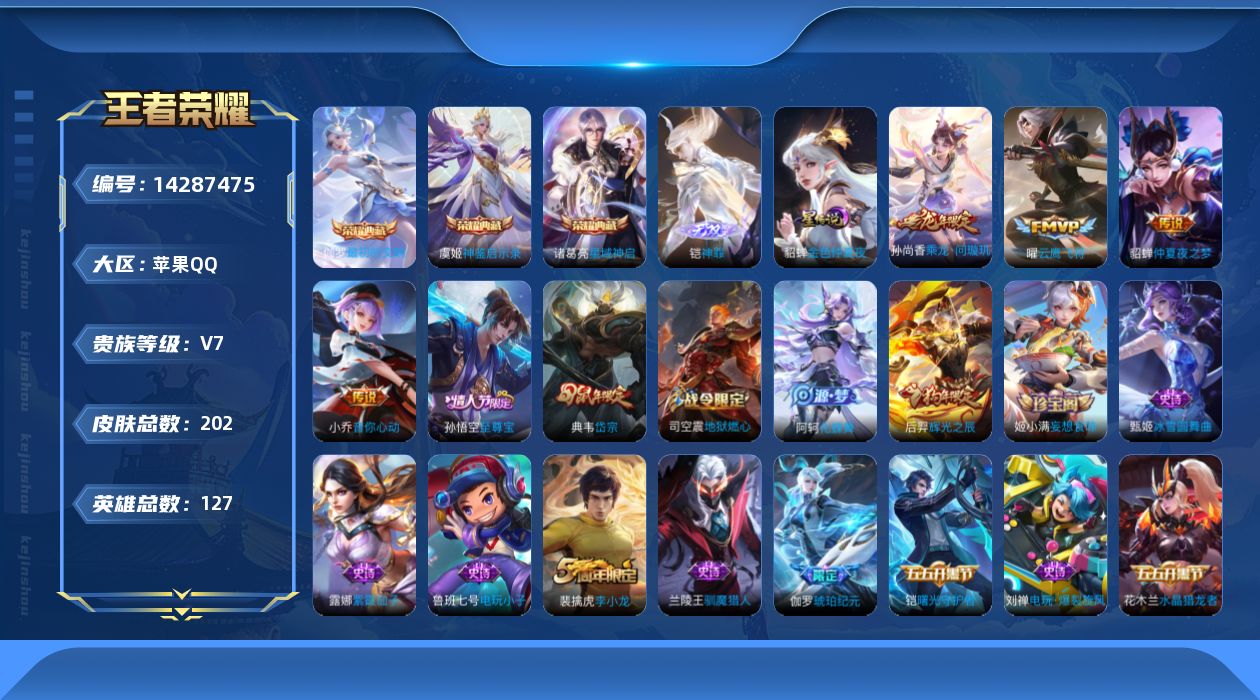 [14287475]v7-127英雄-202皮肤-3典藏皮肤-1无双-5传说-52史诗,,cc8397 【荣耀典藏】:诸葛亮星域神启,虞姬神鉴启示录,伽罗最初的交响 【无双皮肤】:铠神罪 【传说皮肤】:后羿神树通天,孙尚香乘龙问璇玑,小乔音你心动,曜云鹰飞将,貂蝉仲夏夜之梦 【限定皮肤】:狄仁杰阴阳师,赵云皇家上将,鲁班七号狮舞东方,周瑜赤莲之焰,夏侯惇朔风刀,典韦穷奇,典韦岱宗,狄仁杰魔术师,狄仁杰万华元夜,项羽海滩派对,老夫子醍醐杖,兰陵王驯魔猎人,孙悟空至尊宝,牛魔御旌,后羿辉光之辰,钟馗神迹守卫,钟馗驱傩正仪,蔡文姬繁星吟游,鬼谷子原初探秘者,弈星混沌棋,明世隐疑决卦,裴擒虎李小龙,裴擒虎擒涛扼浪,狂铁御狮,米莱狄御霄,云中君纤云弄巧,盾山御銮,上官婉儿梁祝,嫦娥拒霜思,西施玲珑珍味,鲁班大师探海日志,桑启海盐诗旅,艾琳流音漫舞,司空震地狱燃心,阿古朵江河有灵,张良古海寻踪,蒙犽百解令,高渐离燃音魔法,妲己灵卜魔法,鬼谷子天穹祈灯,伽罗琥珀纪元,姬小满妄想食味,孙尚香乘龙问璇玑,沈梦溪龙舞盛年,刘邦剑破天穹 【年限皮肤】:后羿辉光之辰,典韦岱宗,孙尚香乘龙问璇玑 【赛季限定】:夏侯惇朔风刀,典韦穷奇,狄仁杰万华元夜,老夫子醍醐杖,张良古海寻踪,牛魔御旌,钟馗驱傩正仪,鬼谷子原初探秘者,弈星混沌棋,明世隐疑决卦,裴擒虎擒涛扼浪,狂铁御狮,米莱狄御霄,盾山御銮,鲁班大师探海日志,桑启海盐诗旅,鬼谷子天穹祈灯,刘邦剑破天穹 【战令限定】:鲁班七号狮舞东方,周瑜赤莲之焰,兰陵王驯魔猎人,艾琳流音漫舞,钟馗神迹守卫,西施玲珑珍味,司空震地狱燃心,高渐离燃音魔法,妲己灵卜魔法 【史诗皮肤】:鲁班七号电玩小子,项羽苍穹之光,露娜紫霞仙子,赵云皇家上将,貂蝉圣诞恋歌,甄姬冰雪圆舞曲,王昭君偶像歌手,狄仁杰魔术师,廉颇地狱岩魂,宫本武藏鬼剑武藏,孙尚香水果甜心,嬴政暗夜贵公子,妲己魅力维加斯,墨子金属风暴,曹操幽灵船长,李白千年之狐,吕布末日机甲,韩信白龙吟,孙悟空至尊宝,花木兰水晶猎龙者,刘邦德古拉伯爵,夏侯惇乘风破浪,兰陵王暗隐猎兽者,亚瑟心灵战警,安琪拉心灵骇客,后羿辉光之辰,百里守约特工魅影,铠曙光守护者,蔡文姬舞动绿茵,李元芳逐浪之夏,程咬金功夫厨神,白起星夜王子,鲁班七号狮舞东方,狄仁杰鹰眼统帅,兰陵王驯魔猎人,上官婉儿梁祝,蔡文姬繁星吟游,典韦岱宗,裴擒虎李小龙,云中君纤云弄巧,