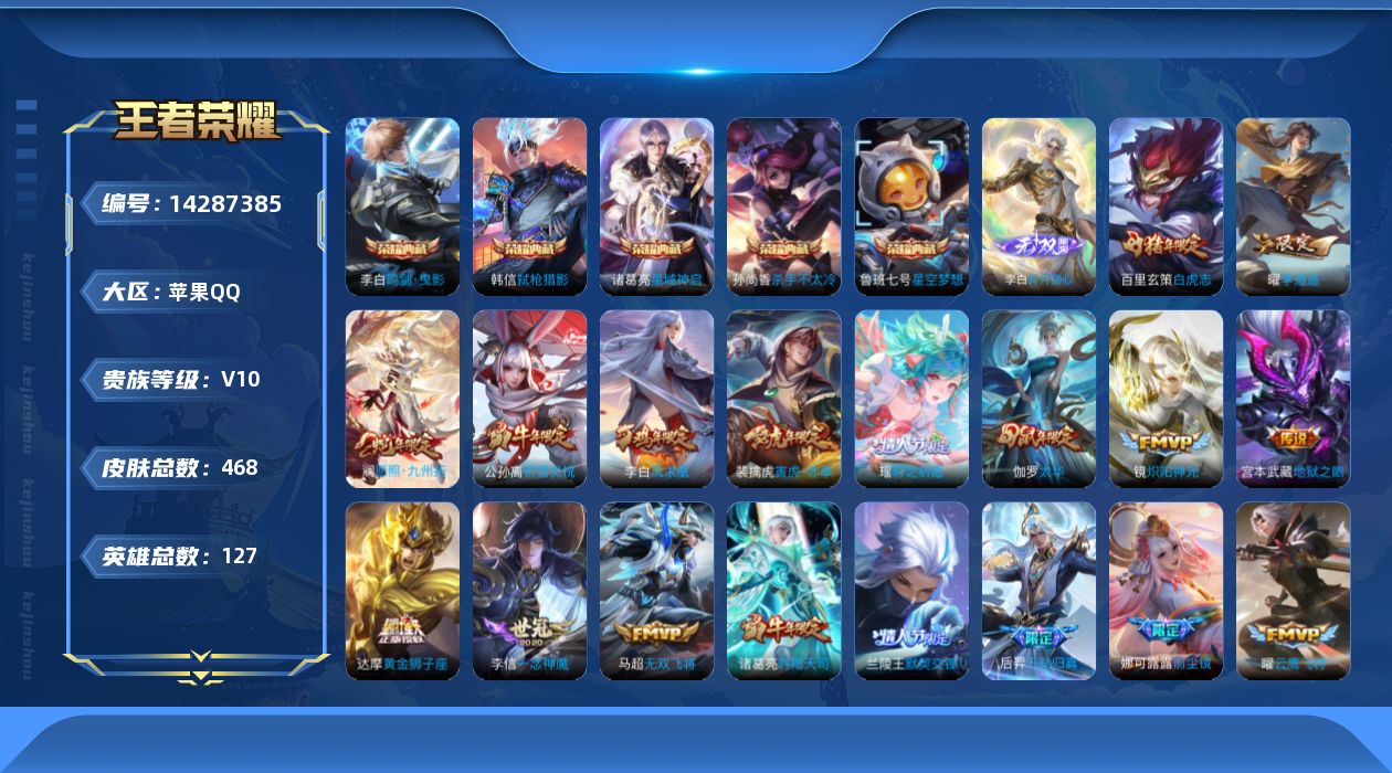 [14287385]可二次 皇冠号 7700伽罗 8200鲁班 8200李白 8000韩信 背包一颗荣耀水晶 贵族10-流光积分22655-468皮5典藏39传说1无双 苹果手q141区468皮5典藏39传说1无双v10 营地id420361388荣耀王者【无双皮肤】:碎月剑心【荣耀典藏】:弑呛猎影星域神启星空梦想鸣剑·曳影杀手不太冷【优质限定皮肤】:无双飞将云中君时之祈愿瑶时之祈