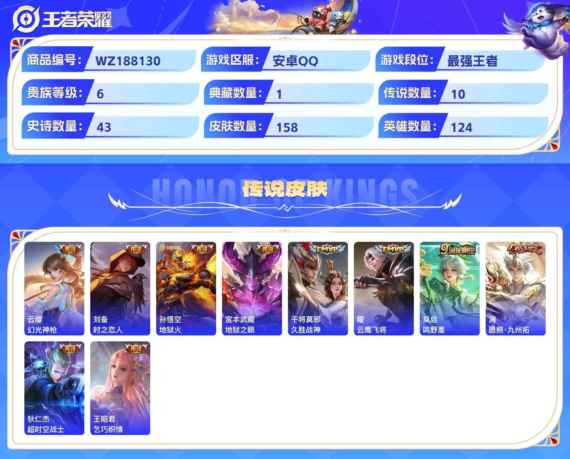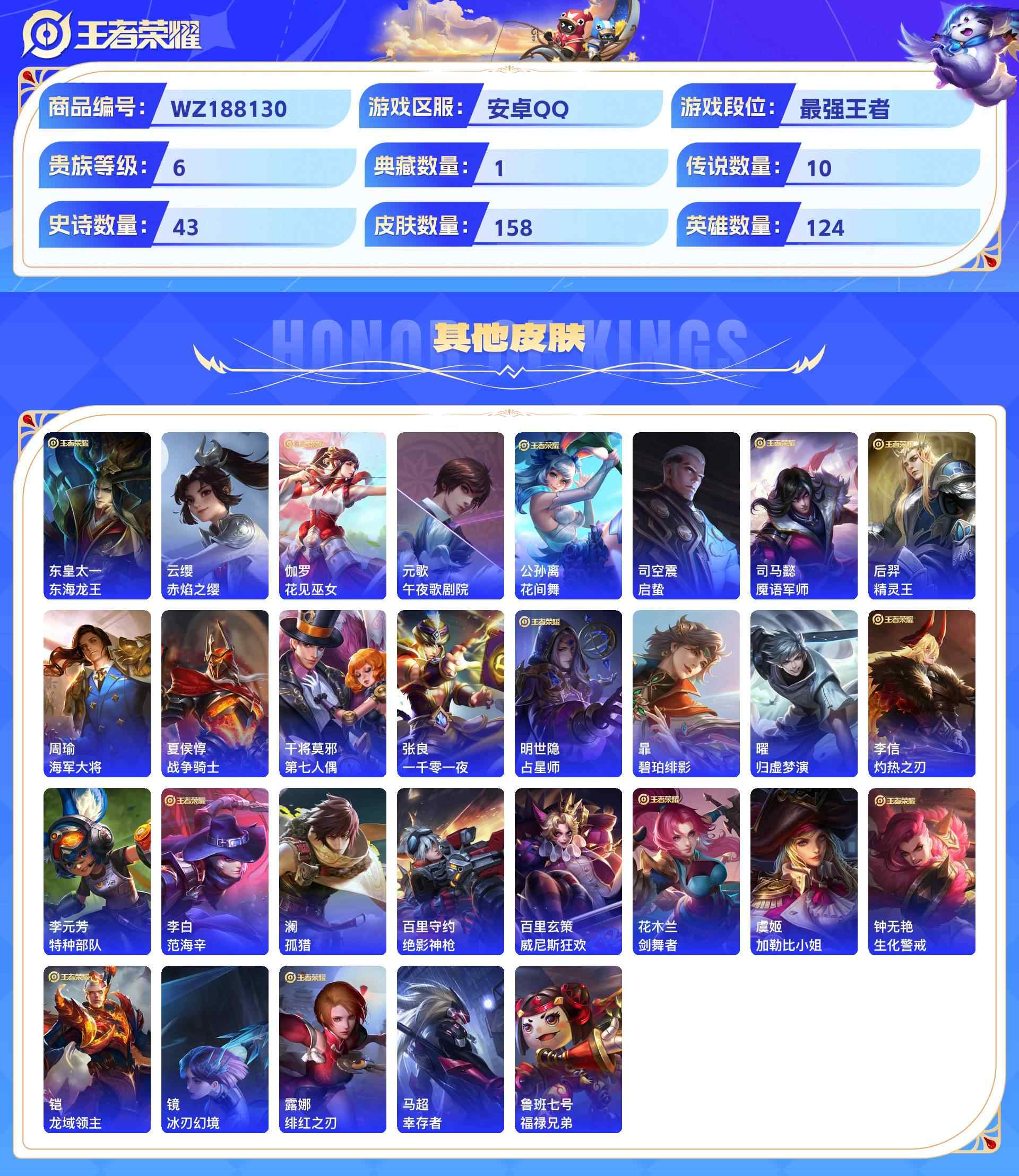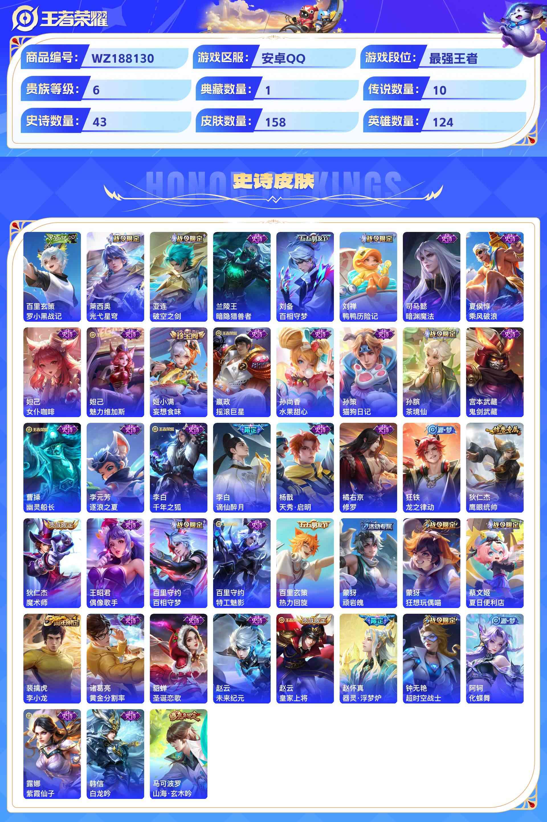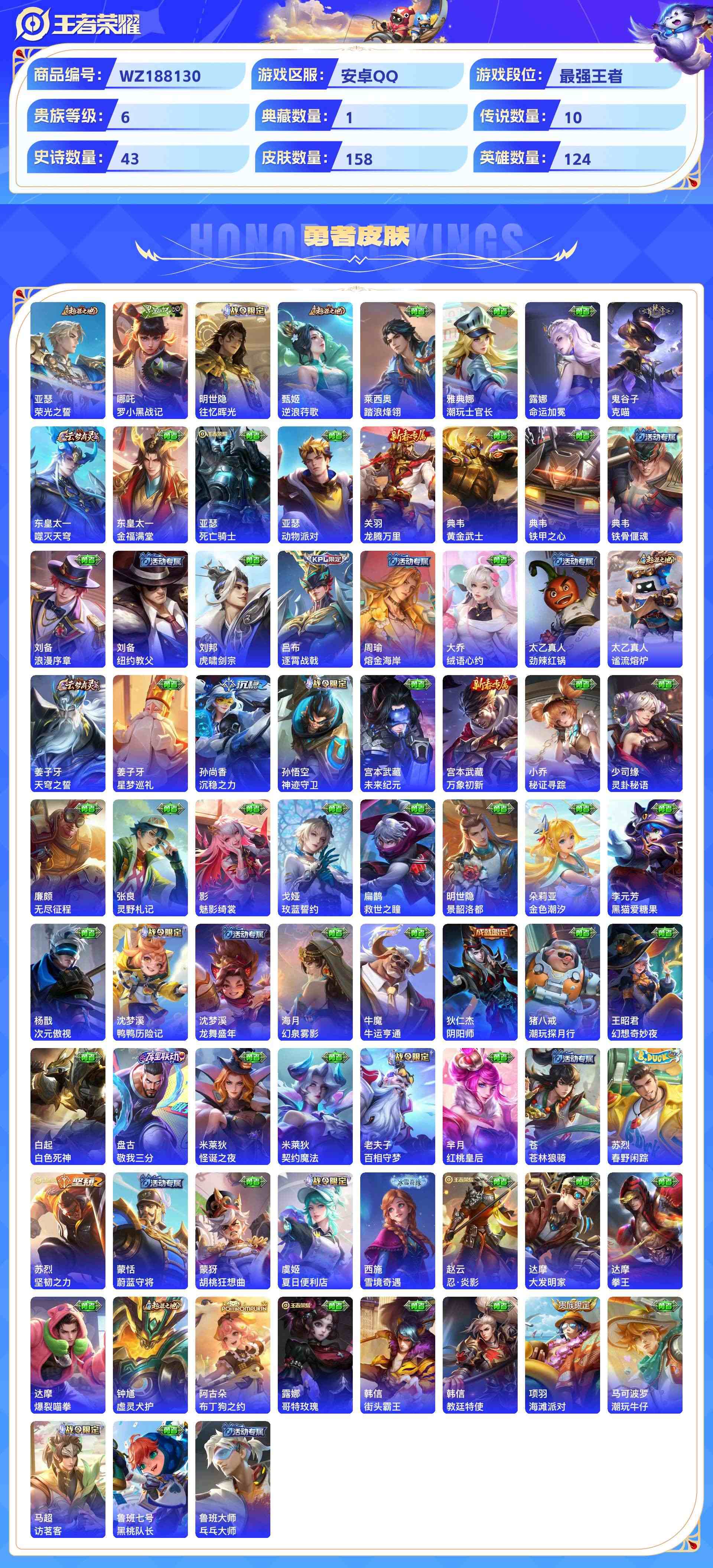 wz188130|精品号可二次【荣耀典藏】全息碎影【传说皮肤】幻光神呛时之恋人地狱火地狱之眼久胜战神云鹰飞将鸣野蒿愿照·九州拓超时空战士乞巧织情安卓qq 158皮 贵族6级 1典藏 10传说 43史诗1星传说6个性按键