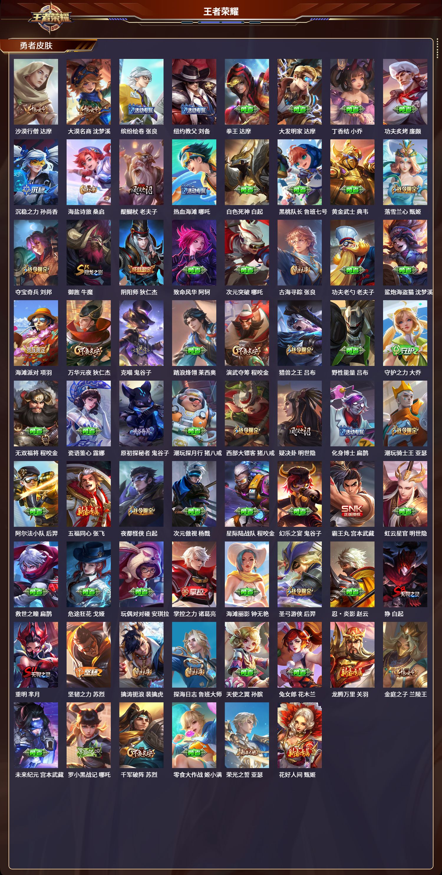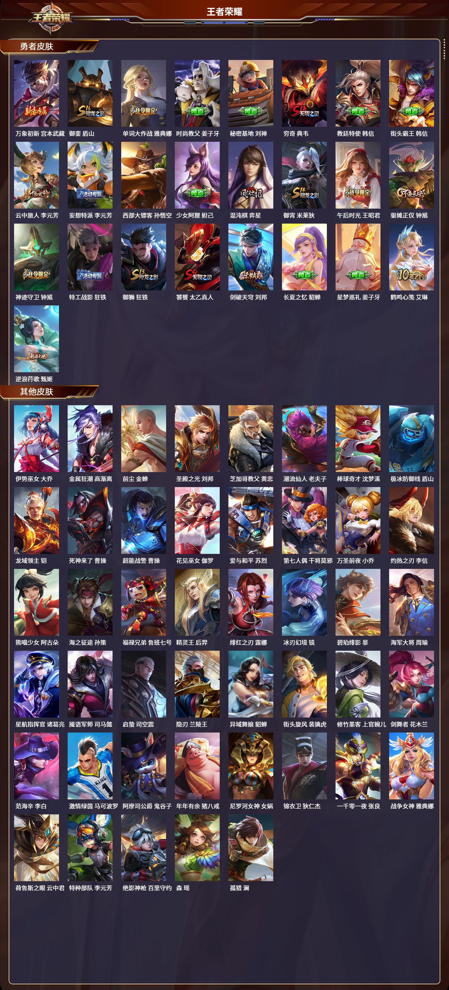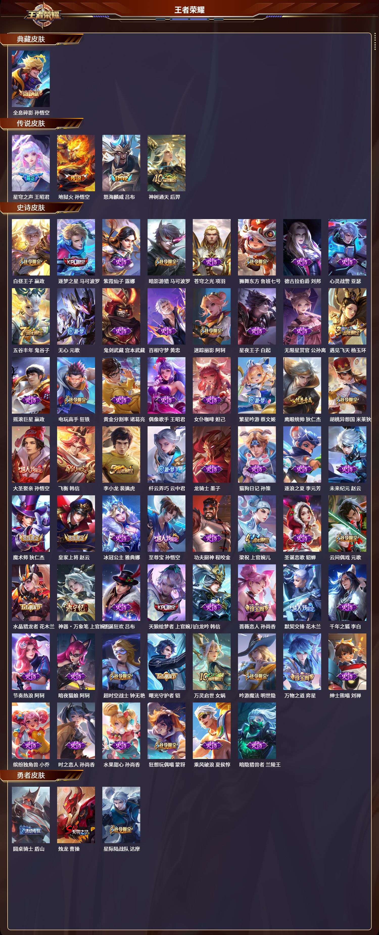 安卓qq/最强王者/217皮肤/127英雄/1典藏/0珍品无双/0无双/0珍品传说/4传说/62史诗/9稀有英雄【1 典藏皮肤】全息碎影 孙悟空【4 传说皮肤】星穹之声 王昭君地狱火 孙悟空怒海麟威 吕布神树通天 后羿【62 史诗皮肤】白昼王子 嬴政逐梦之星 马可波罗紫霞仙子 露娜暗影游猎 马可波罗苍穹之光 项羽狮舞东方 鲁班七号德古拉伯爵 刘邦心灵战警