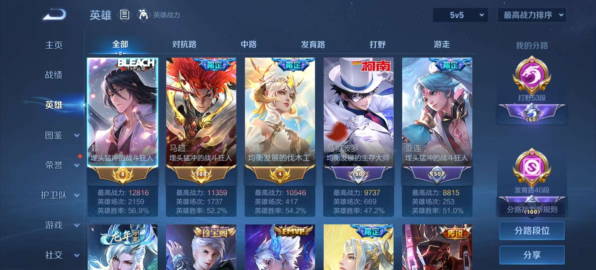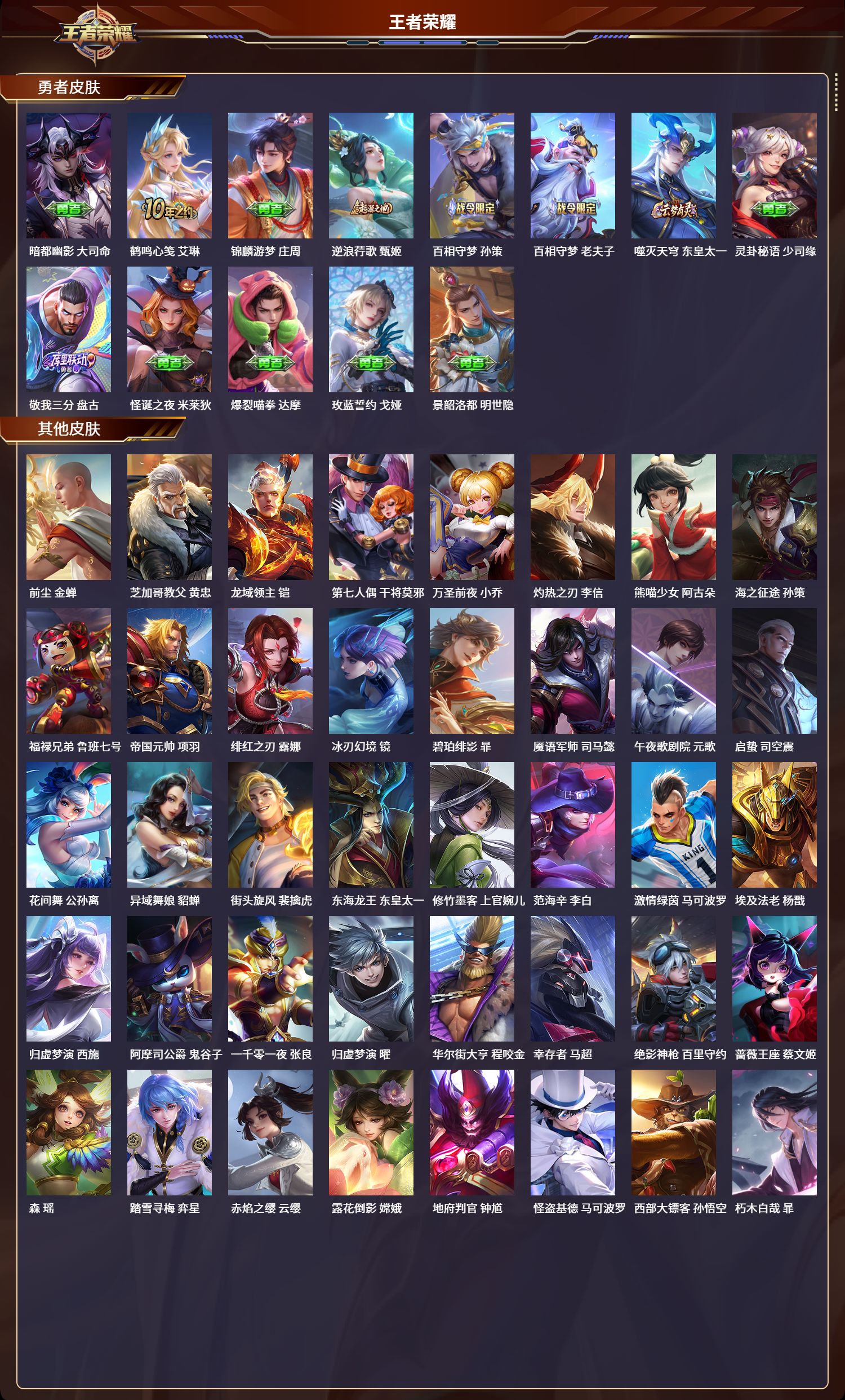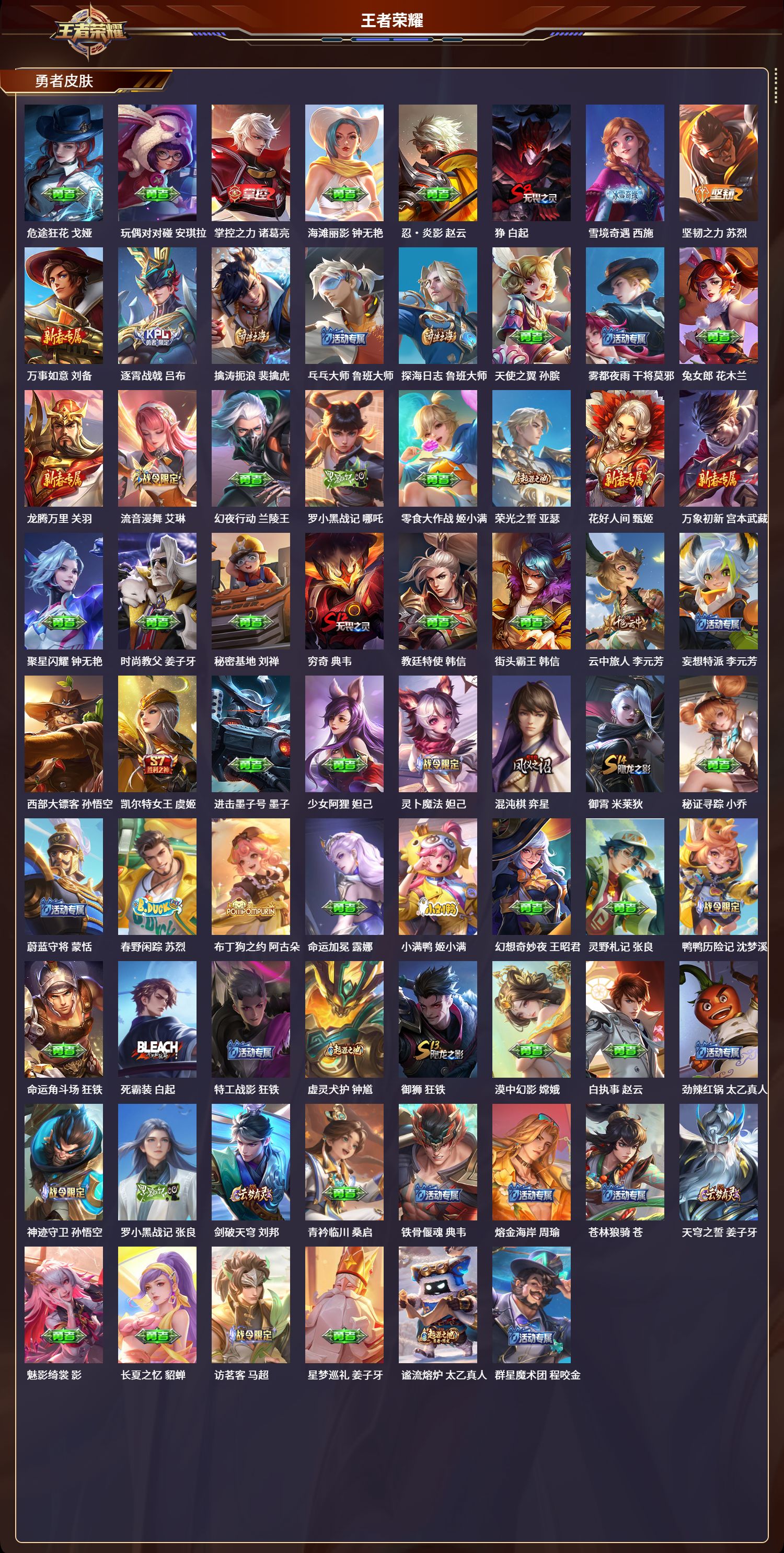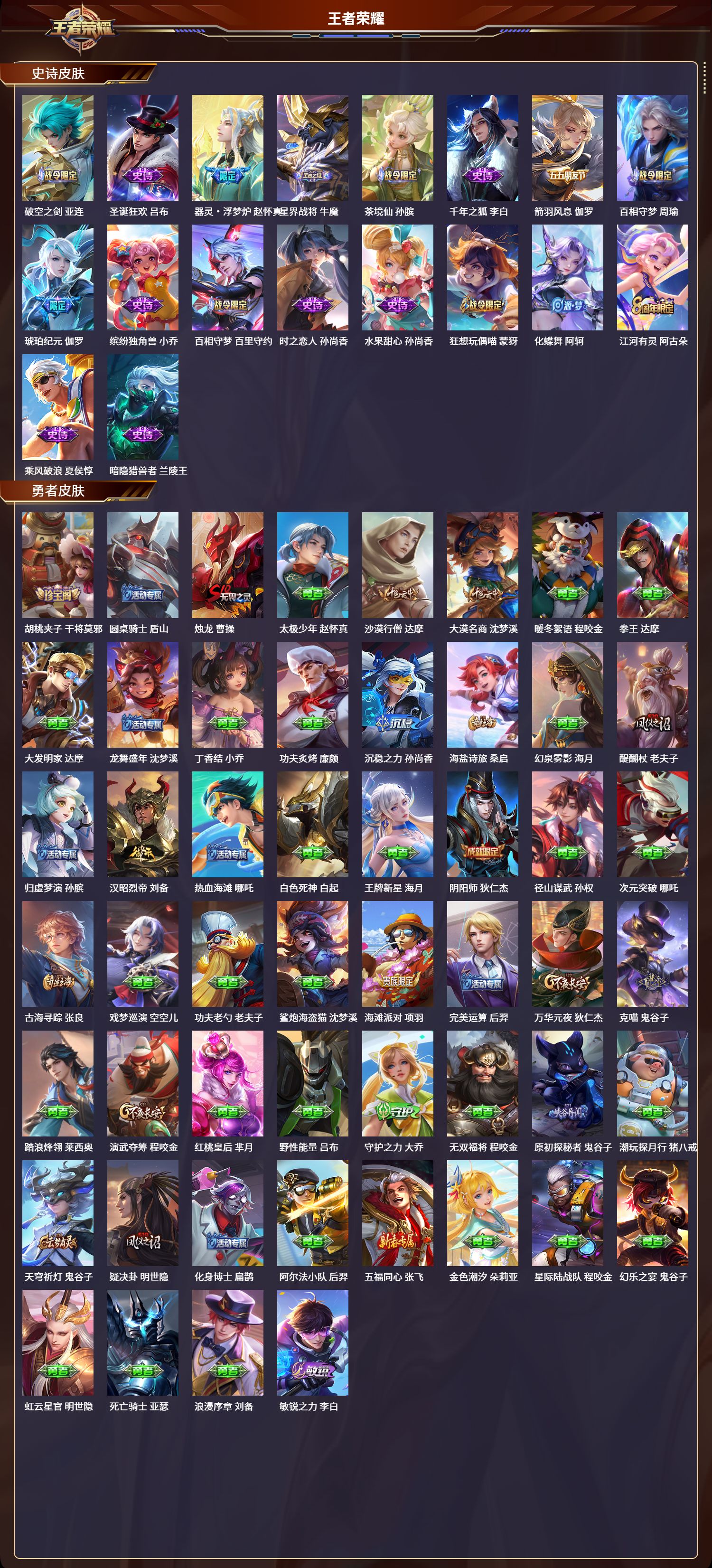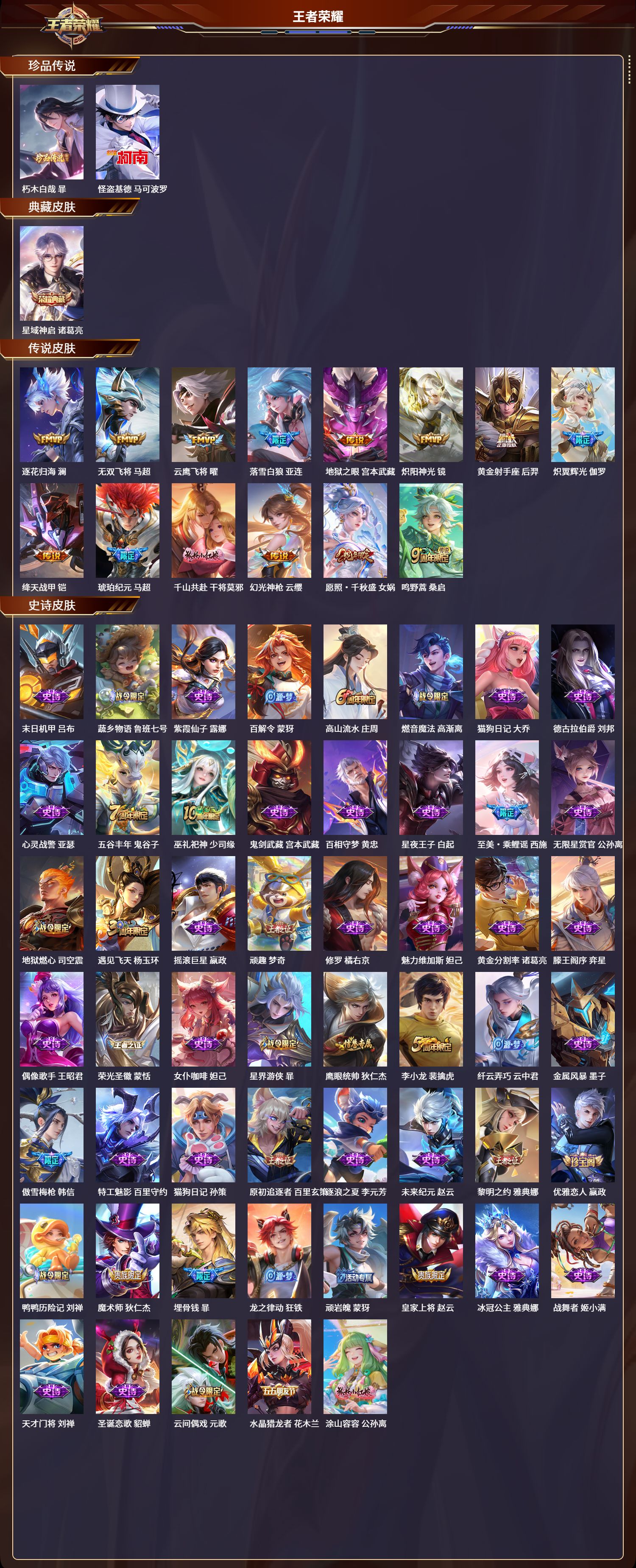 安卓qq/传奇王者/261皮肤/127英雄/1典藏/0珍品无双/0无双/2珍品传说/14传说/71史诗/9稀有英雄【2 珍品传说】朽木白哉 暃怪盗基德 马可波罗【1 典藏皮肤】星域神启 诸葛亮【14 传说皮肤】逐花归海 澜无双飞将 马超云鹰飞将 曜落雪白狼 亚连地狱之眼 宫本武藏炽阳神光 镜黄金射手座 后羿炽翼辉光 伽罗绛天战甲 铠琥珀纪元 马超千山共赴 干将莫邪幻光神