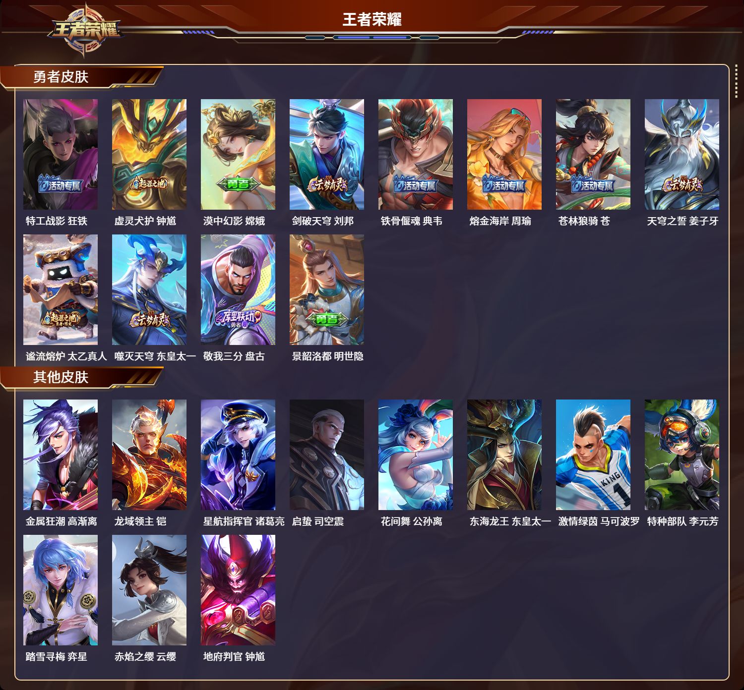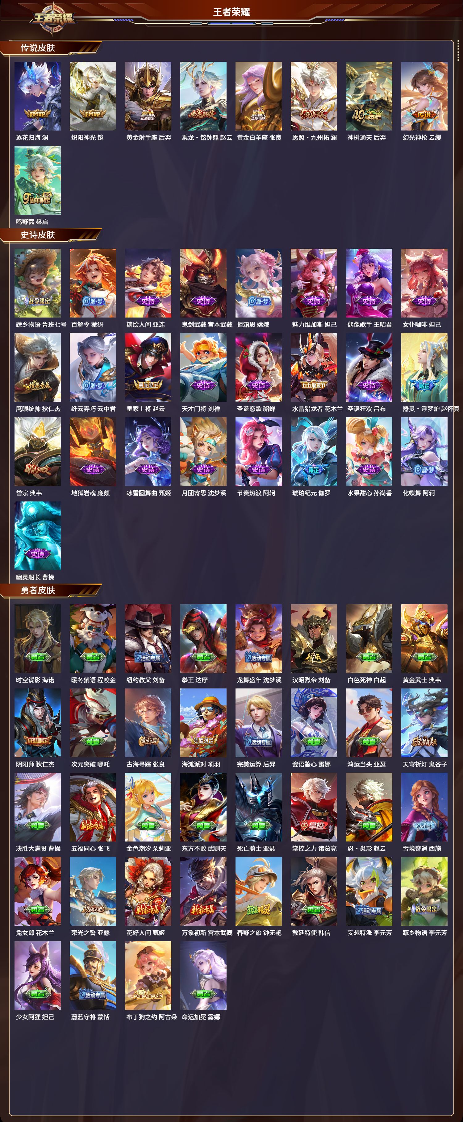 安卓qq/绝世王者/93皮肤/118英雄/0典藏/0珍品无双/0无双/0珍品传说/9传说/25史诗/8稀有英雄【9 传说皮肤】逐花归海 澜炽阳神光 镜黄金射手座 后羿乘龙·铭钟鼎 赵云黄金白羊座 张良愿照·九州拓 澜神树通天 后羿幻光神呛 云缨鸣野蒿 桑启【25 史诗皮肤】蔬乡物语 鲁班七号百解令 蒙犽糖绘人间 亚连鬼剑武藏 宫本武藏拒霜思 嫦娥魅力