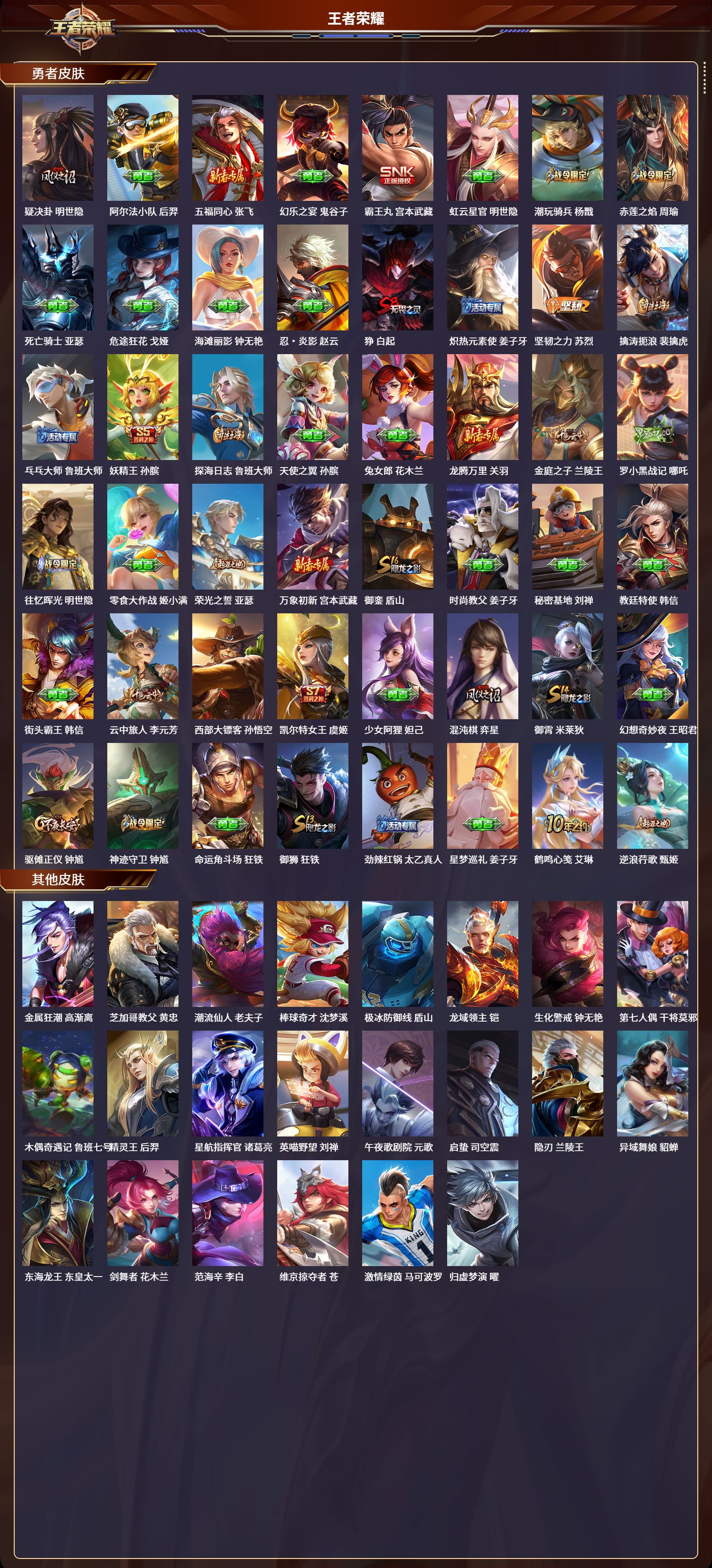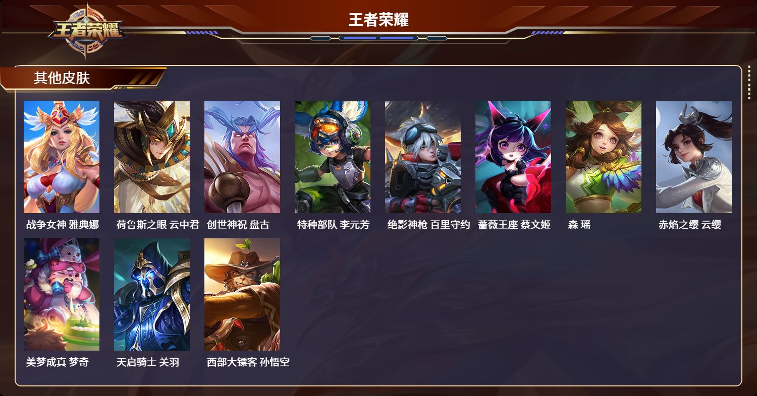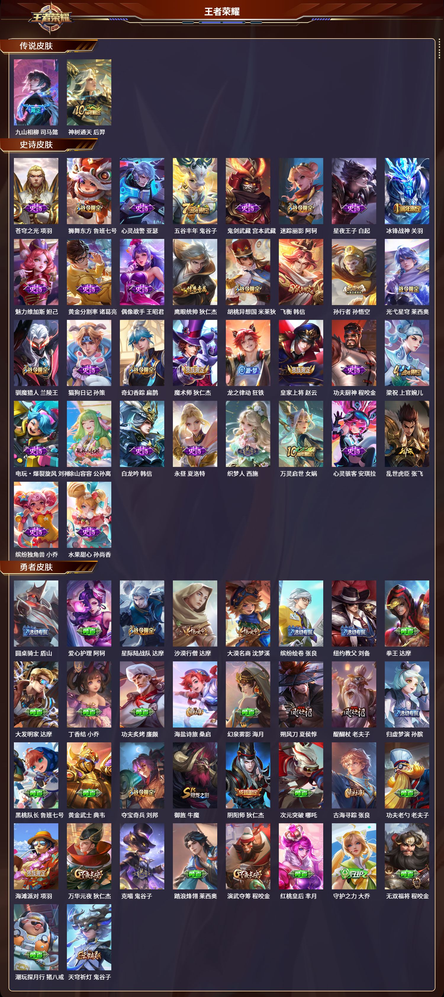 安卓qq/荣耀王者/151皮肤/125英雄/0典藏/0珍品无双/0无双/0珍品传说/2传说/34史诗/7稀有英雄【2 传说皮肤】九山相柳 司马懿神树通天 后羿【34 史诗皮肤】苍穹之光 项羽狮舞东方 鲁班七号心灵战警 亚瑟五谷丰年 鬼谷子鬼剑武藏 宫本武藏迷踪丽影 阿轲星夜王子 白起冰锋战神 关羽魅力维加斯 妲己黄金分割率 诸葛亮偶像歌手 王昭君鹰眼统