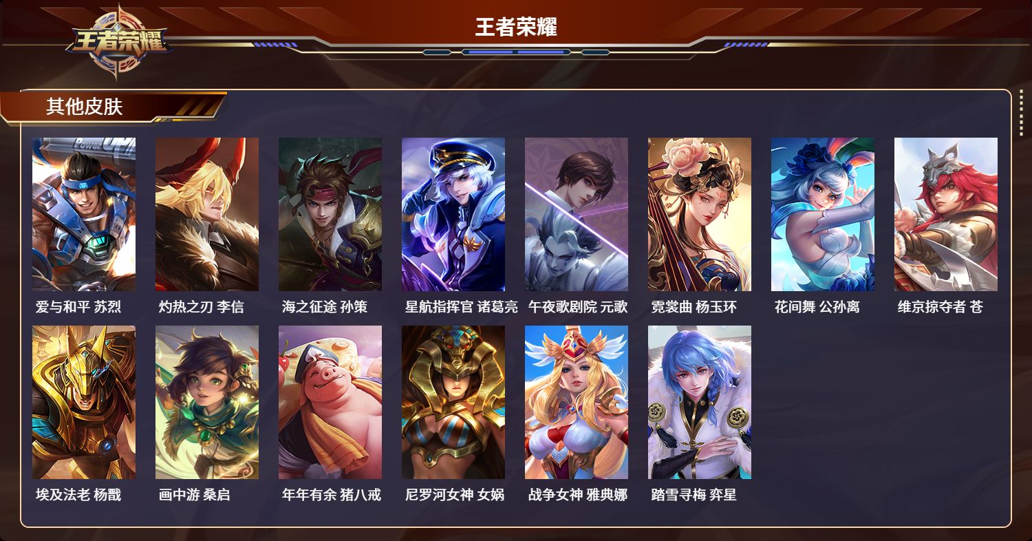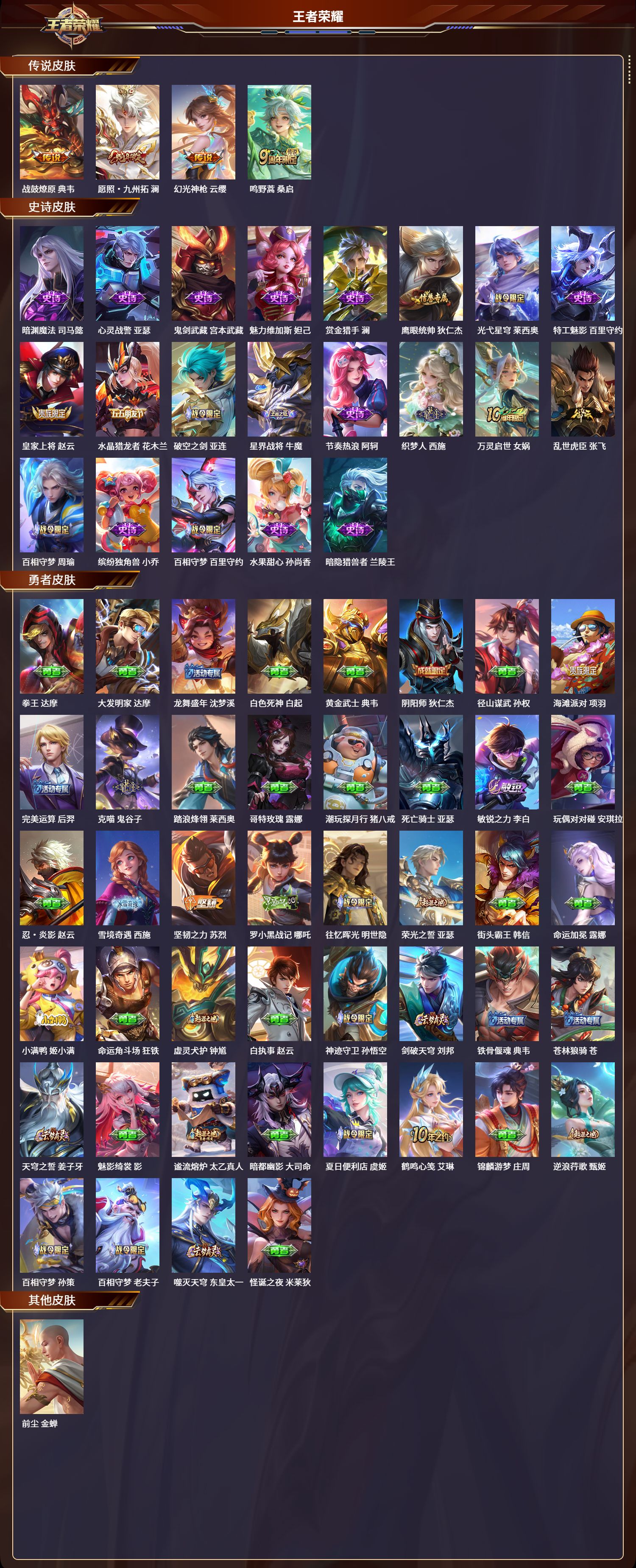 安卓qq/至圣王者/84皮肤/120英雄/0典藏/0珍品无双/0无双/0珍品传说/4传说/21史诗/7稀有英雄【4 传说皮肤】战鼓燎原 典韦愿照·九州拓 澜幻光神呛 云缨鸣野蒿 桑启【21 史诗皮肤】暗渊魔法 司马懿心灵战警 亚瑟鬼剑武藏 宫本武藏魅力维加斯 妲己赏金猎手 澜鹰眼统帅 狄仁杰光弋星穹 莱西奥特工魅影 百里守约皇家上将 赵云水晶猎龙者 花木兰破空之剑 亚连