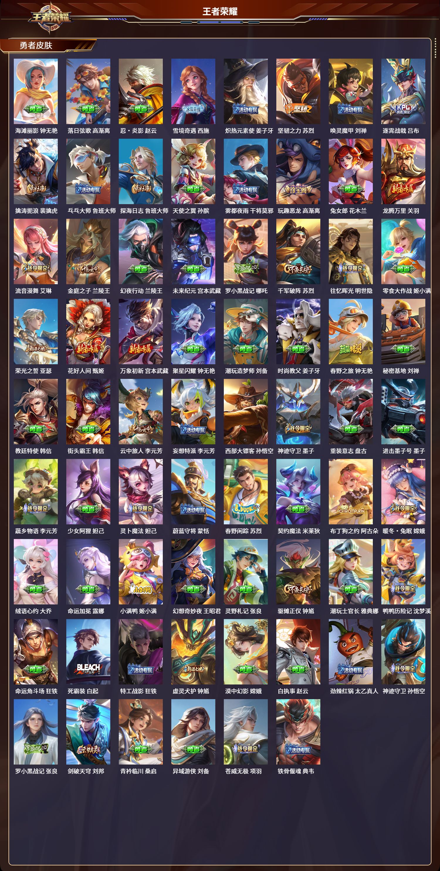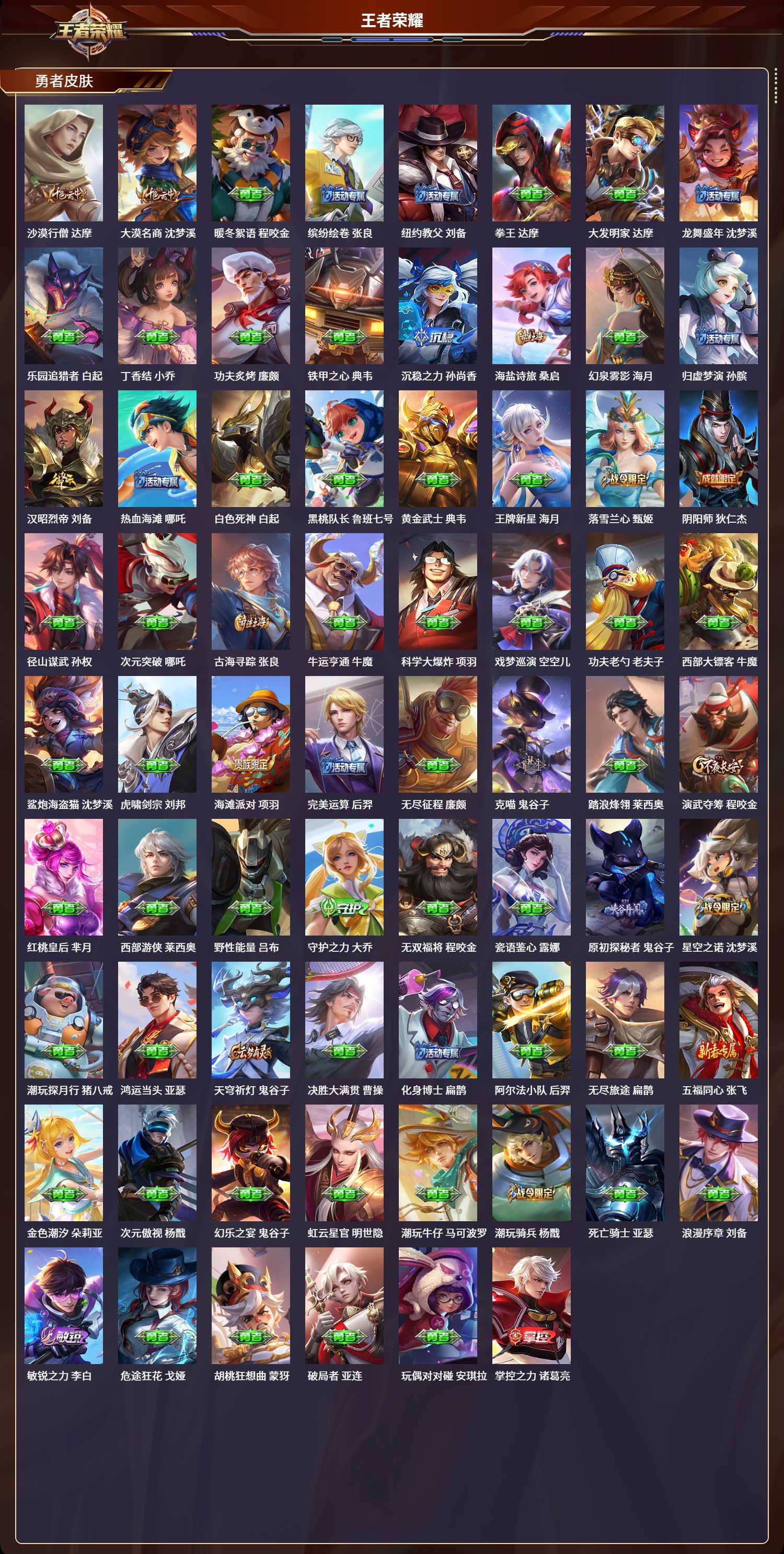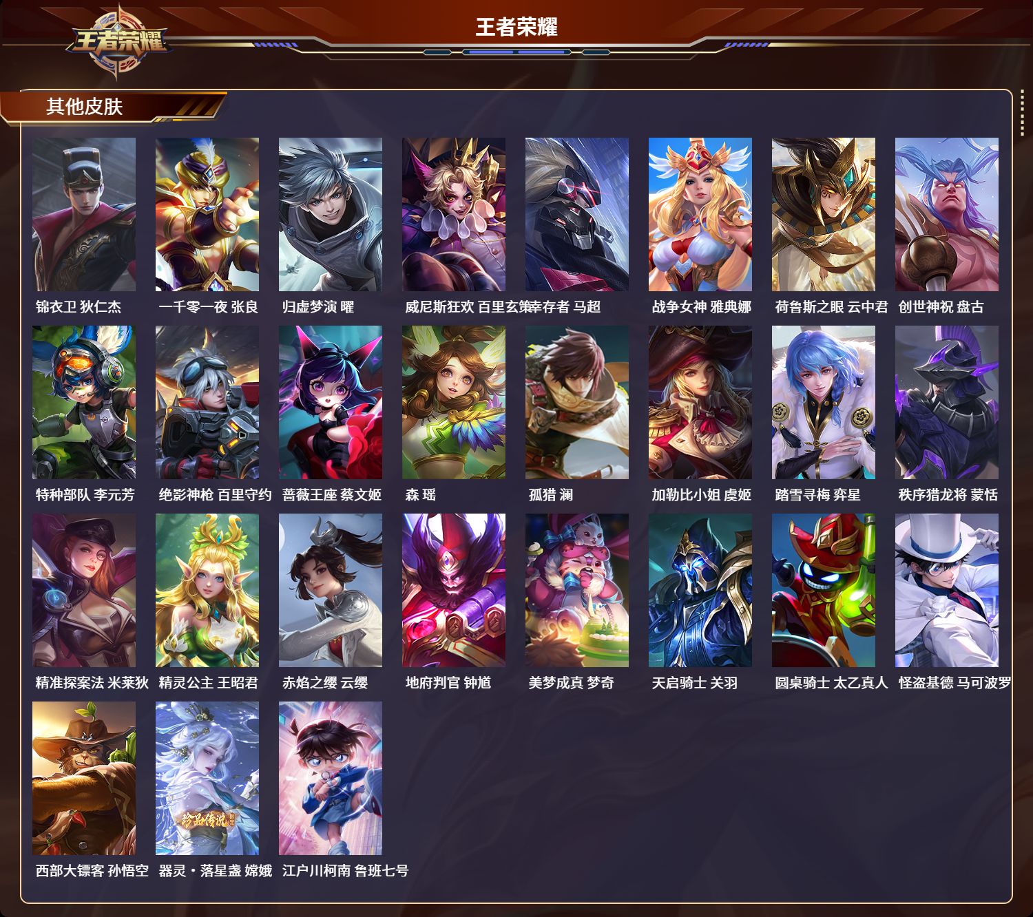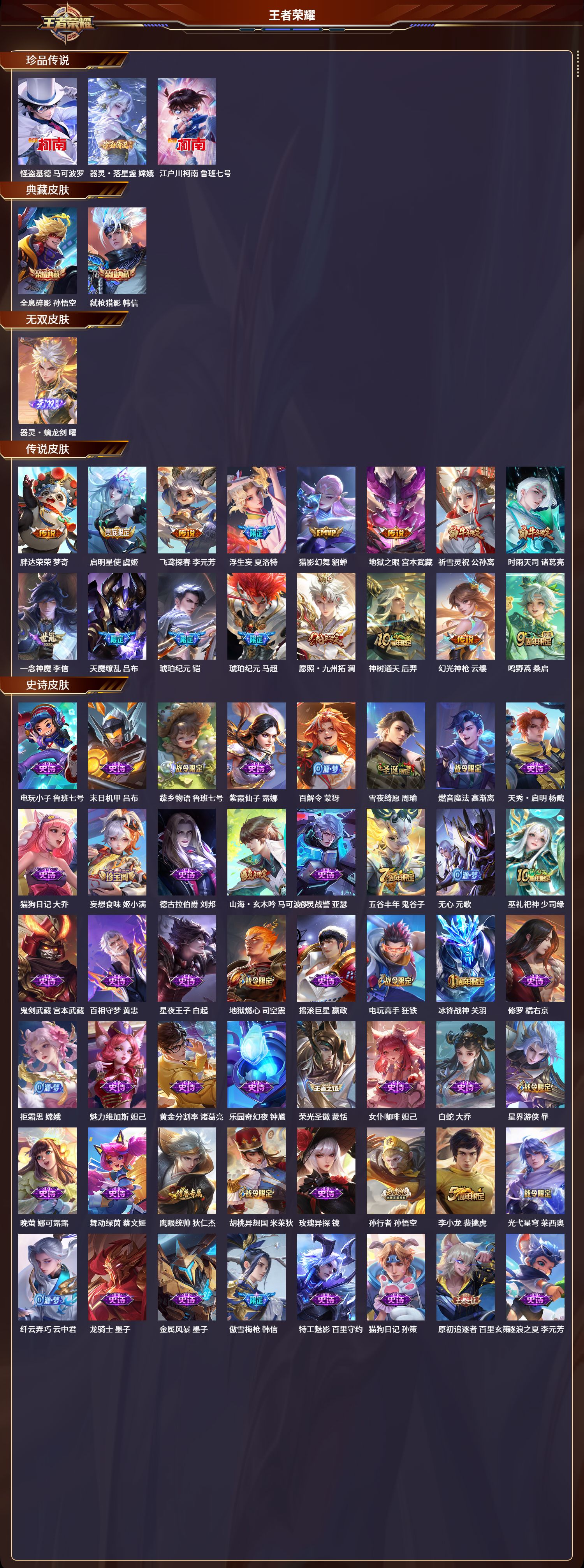 安卓qq/荣耀王者/373皮肤/127英雄/2典藏/0珍品无双/1无双/3珍品传说/16传说/112史诗/9稀有英雄【3 珍品传说】怪盗基德 马可波罗器灵·落星盏 嫦娥江户川柯南 鲁班七号【2 典藏皮肤】全息碎影 孙悟空弑呛猎影 韩信【1 无双皮肤】器灵·螭龙剑 曜【16 传说皮肤】胖达荣荣 梦奇启明星使 虞姬飞鸢探春 李元芳浮生妄 夏洛特猫影幻舞 貂蝉地狱之眼 宫本武藏祈