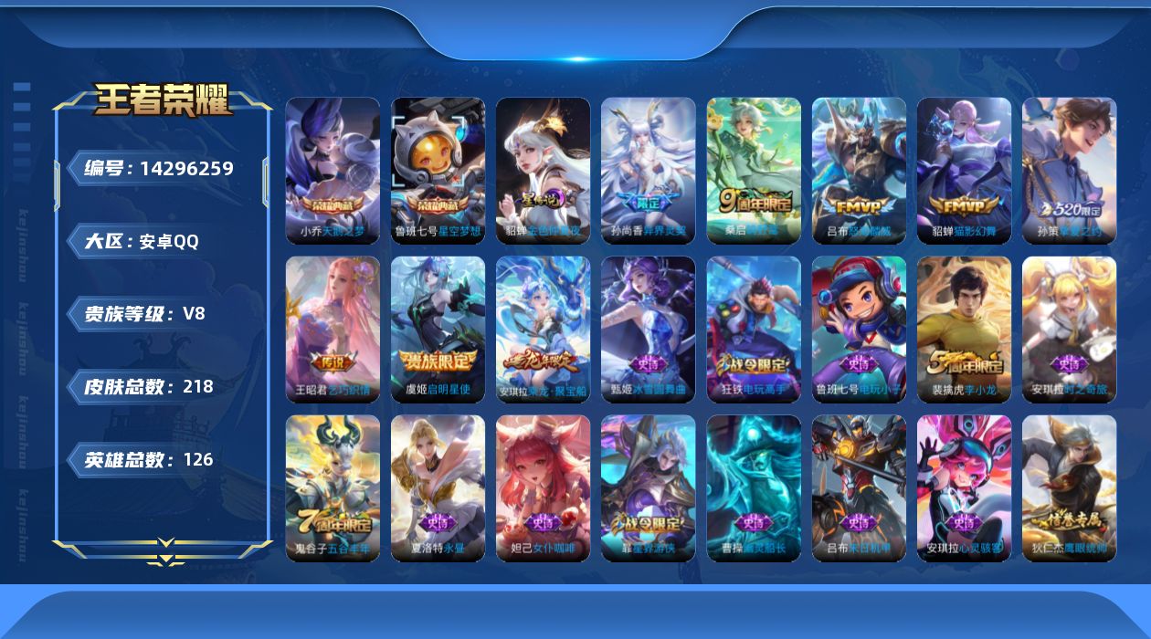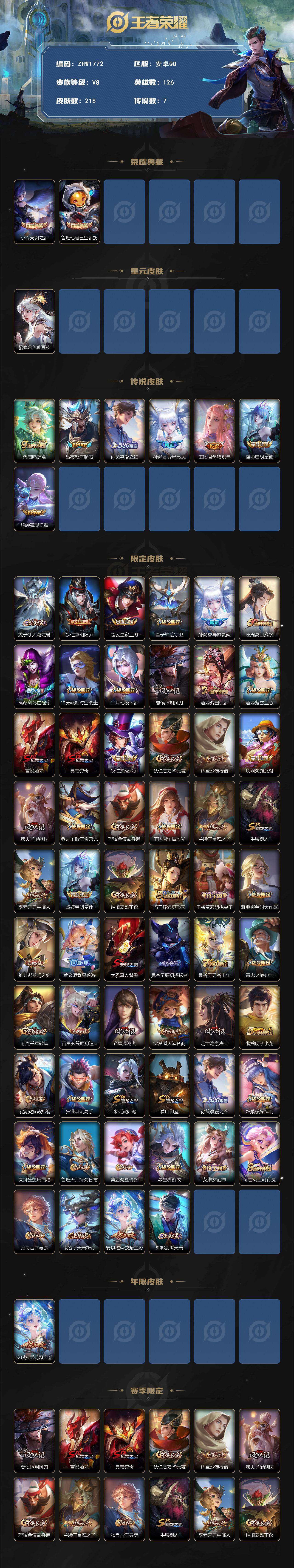 [14296259]可二次【店主推荐捡漏号!可直接换绑】安卓q-v8-最强王者段位-126英雄-218皮肤-2典藏皮肤-7传说-51史诗-1星元 【荣耀典藏】:小乔天鹅之梦,鲁班七号星空梦想 【传说皮肤】:桑启鸣野蒿,吕布怒海麟威,孙策挚爱之约,孙尚香异界灵契,王昭君乞巧织情,虞姬启明星使,貂蝉猫影幻舞 【限定皮肤】:姜子牙天穹之誓,狄仁杰阴阳师,赵云皇家上将,墨子神迹守卫,孙尚香异界灵契,庄周高山流水,高渐离死亡摇滚,钟无艳超时空战士,芈月幻夜卜梦,夏侯惇朔风刀,甄姬游园惊梦,甄姬落雪兰心,曹操烛龙,典韦穷奇,狄仁杰魔术师,狄仁杰万华元夜,达摩沙漠行僧,项羽海滩派对,老夫子醍醐杖,老夫子航海奇遇记,程咬金演武夺筹,王昭君午后时光,兰陵王金庭之子,牛魔御旌,李元芳云中旅人,虞姬启明星使,钟馗驱傩正仪,杨玉环遇见飞天,干将莫邪胡桃夹子,雅典娜单词大作战,雅典娜黎明之约,蔡文姬繁星吟游,太乙真人饕餮,鬼谷子原初探秘者,鬼谷子五谷丰年,黄忠火炮绅士,苏烈千军破阵,百里玄策原初追逐者,弈星混沌棋,沈梦溪大漠名商,明世隐疑决卦,裴擒虎李小龙,裴擒虎擒涛扼浪,狂铁电玩高手,米莱狄御霄,盾山御銮,孙策挚爱之约,嫦娥暖冬兔眠,蒙犽狂想玩偶喵,鲁班大师探海日志,桑启海盐诗旅,暃星界游侠,艾琳女武神,阿古朵江河有灵,张良古海寻踪,鬼谷子天穹祈灯,安琪拉乘龙聚宝船,刘邦剑破天穹 【年限皮肤】:安琪拉乘龙聚宝船 【赛季限定】:夏侯惇朔风刀,曹操烛龙,典韦穷奇,狄仁杰万华元夜,达摩沙漠行僧,老夫子醍醐杖,程咬金演武夺筹,兰陵王金庭之子,张良古海寻踪,牛魔御旌,李元芳云中旅人,钟馗驱傩正仪,雅典娜黎明之约,太乙真人饕餮,鬼谷子原初探秘者,苏烈千军破阵,百里玄策原初追逐者,弈星混沌棋,沈梦溪大漠名商,明世隐疑决卦,裴擒虎擒涛扼浪,米莱狄御霄,盾山御銮,鲁班大师探海日志,桑启海盐诗旅,鬼谷子天穹祈灯,刘邦剑破天穹,姜子牙天穹之誓 【战令限定】:墨子神迹守卫,钟无艳超时空战士,芈月幻夜卜梦,甄姬落雪兰心,老夫子航海奇遇记,王昭君午后时光,雅典娜单词大作战,黄忠火炮绅士,狂铁电玩高手,嫦娥暖冬兔眠,蒙犽狂想玩偶喵,暃星界游侠 【史诗皮肤】:鲁班七号电玩小子,赵云皇家上将,赵云未来纪元,貂蝉圣诞恋歌,甄姬冰雪圆舞曲,王昭君偶像歌手,狄仁杰魔术师,廉颇地狱岩魂,宫本武藏鬼剑武藏,孙尚香水果甜心,妲己魅力维加斯,妲己女仆咖啡