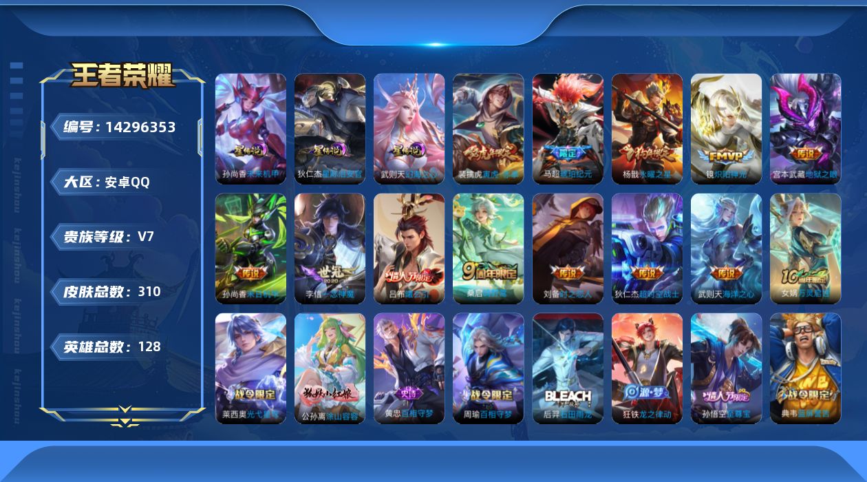 [14296353]【店主推荐捡漏号!可直接换绑】安卓q-v7-最强王者段位-128英雄-310皮肤-1典藏英雄-13传说-93史诗 【英雄全皮】:蒙恬全皮 【荣耀典藏】:武则天英雄 【传说皮肤】:后羿神树通天,桑启鸣野蒿,吕布曦玄引,马超琥珀纪元,裴擒虎寅虎赤拳,镜炽阳神光,李信一念神魔,刘备时之恋人,杨戬永曜之星,孙尚香末日机甲,宫本武藏地狱之眼,武则天海洋之心,狄仁杰超时空战士 【限定皮肤】:白起狰,蔡文姬夏日便利店,虞姬夏日便利店,姜子牙天穹之誓,狄仁杰阴阳师,虞姬凯尔特女王,赵云皇家上将,墨子神迹守卫,嬴政优雅恋人,嬴政白昼王子,孙尚香蔷薇恋人,鲁班七号狮舞东方,庄周蜃楼王,庄周高山流水,高渐离死亡摇滚,阿轲迷踪丽影,钟无艳王者之锤,孙膑妖精王,扁鹊炼金王,芈月重明,吕布猎兽之王,周瑜赤莲之焰,元歌云间偶戏,元歌无心,夏侯惇朔风刀,曹操烛龙,典韦穷奇,典韦蓝屏警告,马可波罗暗影游猎,狄仁杰魔术师,狄仁杰万华元夜,达摩星际陆战队,达摩沙漠行僧,项羽海滩派对,老夫子醍醐杖,老夫子航海奇遇记,程咬金演武夺筹,刘邦夺宝奇兵,兰陵王驯魔猎人,亚瑟潮玩骑士王,孙悟空至尊宝,牛魔御旌,后羿辉光之辰,李元芳银河之约,李元芳云中旅人,虞姬霸王别姬,钟馗神迹守卫,钟馗驱傩正仪,杨玉环遇见飞天,杨戬永曜之星,女娲朔望之晖,干将莫邪冰霜恋舞曲,干将莫邪胡桃夹子,雅典娜单词大作战,雅典娜黎明之约,蔡文姬繁星吟游,太乙真人华丽摇滚,鬼谷子原初探秘者,鬼谷子五谷丰年,苏烈千军破阵,百里玄策原初追逐者,弈星混沌棋,梦奇顽趣,公孙离蜜橘之夏,沈梦溪星空之诺,沈梦溪大漠名商,明世隐疑决卦,裴擒虎李小龙,裴擒虎寅虎赤拳,狂铁御狮,米莱狄御霄,米莱狄胡桃异想国,云中君纤云弄巧,盾山御銮,猪八戒西部大镖客,上官婉儿梁祝,嫦娥拒霜思,蒙犽狂想玩偶喵,鲁班大师探海日志,艾琳流音漫舞,司空震地狱燃心,张良古海寻踪,蒙犽百解令,蒙恬荣光圣徽,鬼谷子天穹祈灯,马超琥珀纪元,姬小满妄想食味,吕布曦玄引,沈梦溪龙舞盛年,刘邦剑破天穹,程咬金群星魔术团 【年限皮肤】:裴擒虎寅虎赤拳,杨戬永曜之星,后羿辉光之辰 【赛季限定】:庄周蜃楼王,孙膑妖精王,扁鹊炼金王,白起狰,芈月重明,夏侯惇朔风刀,曹操烛龙,典韦穷奇,狄仁杰万华元夜,达摩沙漠行僧,老夫子醍醐杖,程咬金演武夺筹,张良古海寻踪,牛魔御旌,李元芳云中旅人,虞姬凯尔特女王,钟馗驱