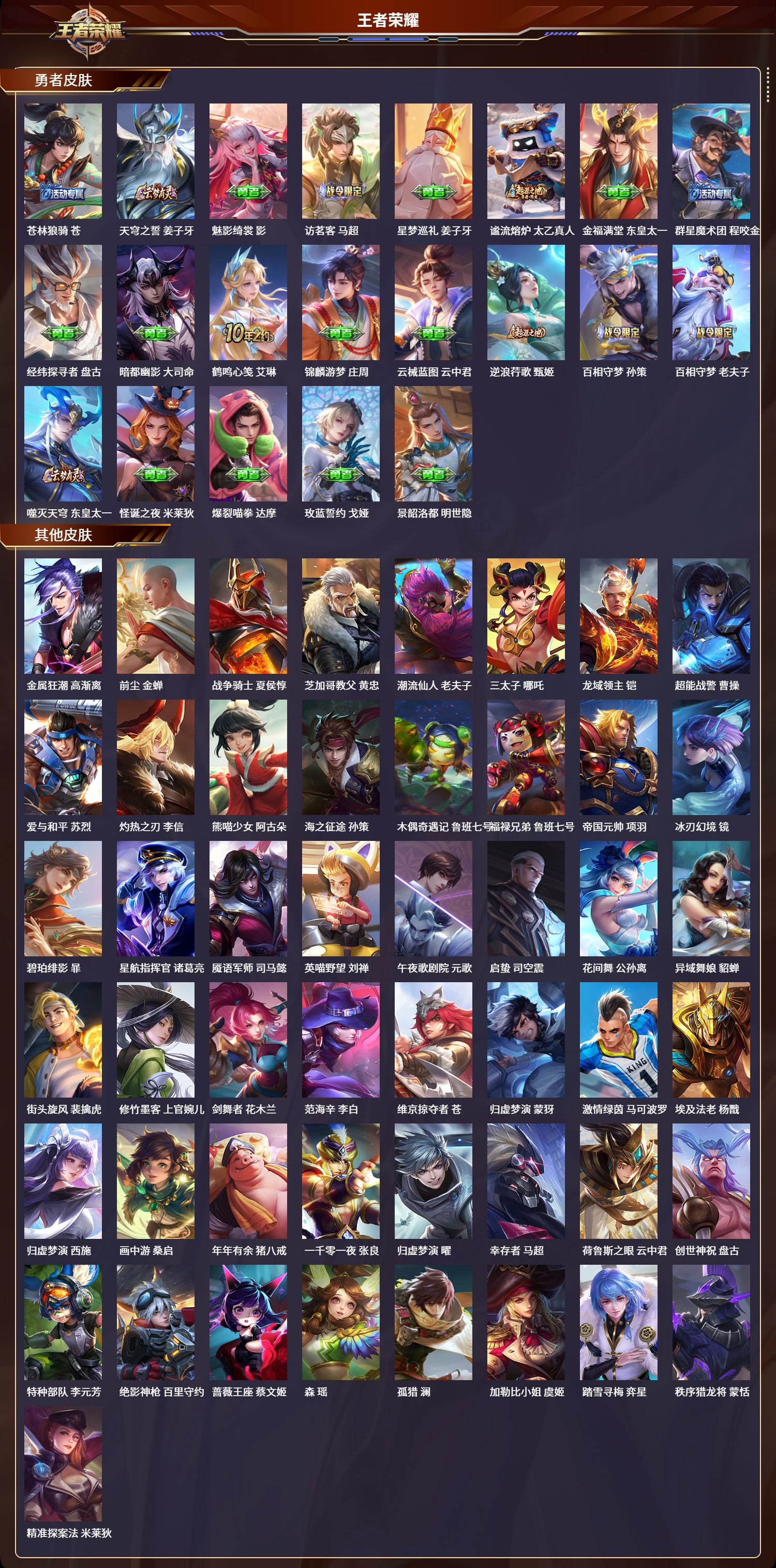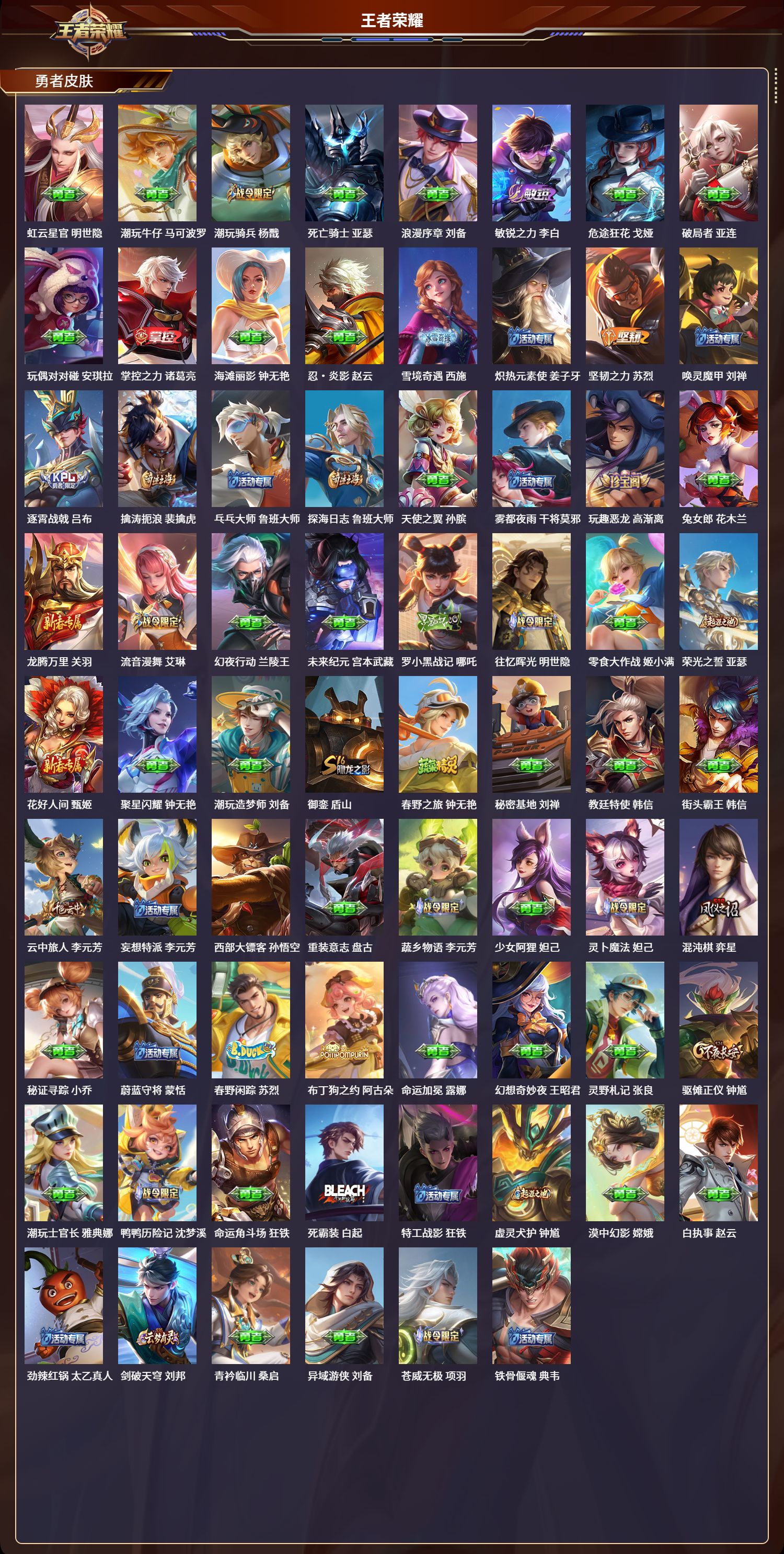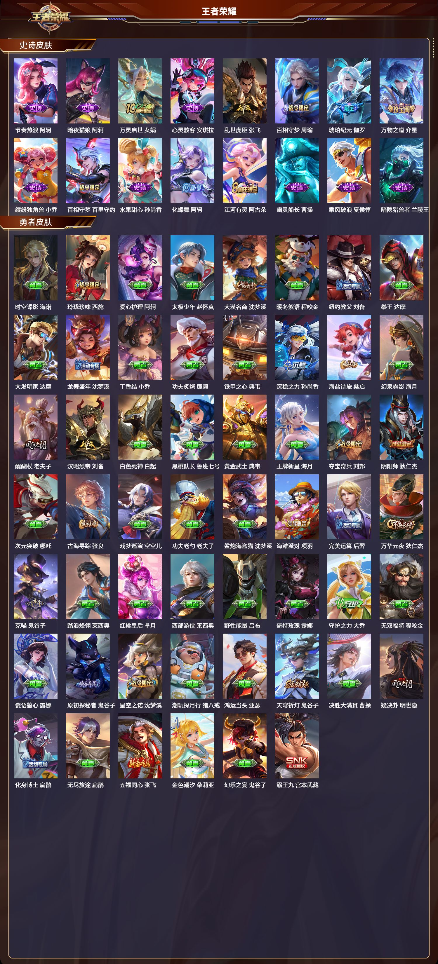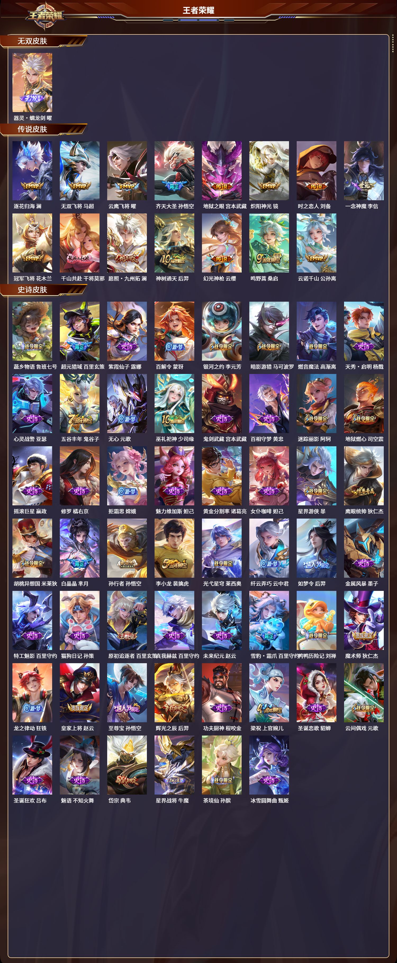 苹果qq/非凡王者/286皮肤/124英雄/0典藏/0珍品无双/1无双/0珍品传说/15传说/70史诗/8稀有英雄【1 无双皮肤】器灵·螭龙剑 曜【15 传说皮肤】逐花归海 澜无双飞将 马超云鹰飞将 曜齐天大圣 孙悟空地狱之眼 宫本武藏炽阳神光 镜时之恋人 刘备一念神魔 李信冠军飞将 花木兰千山共赴 干将莫邪愿照·九州拓 澜神树通天 后羿幻光神呛 云缨鸣野蒿 桑启云诺