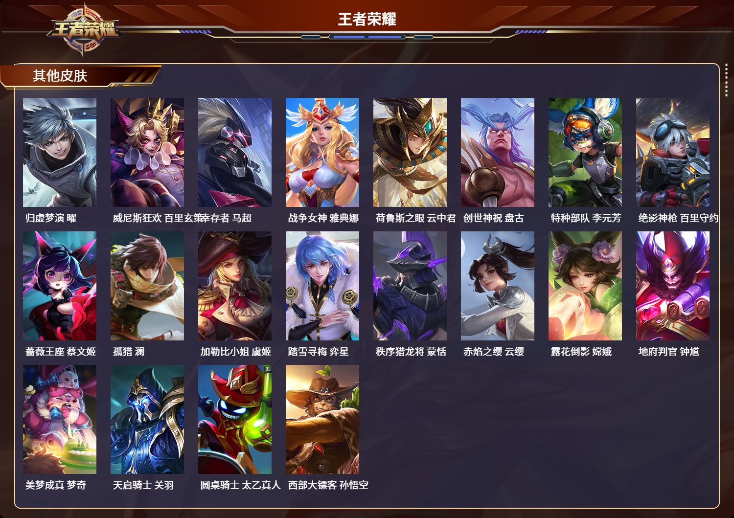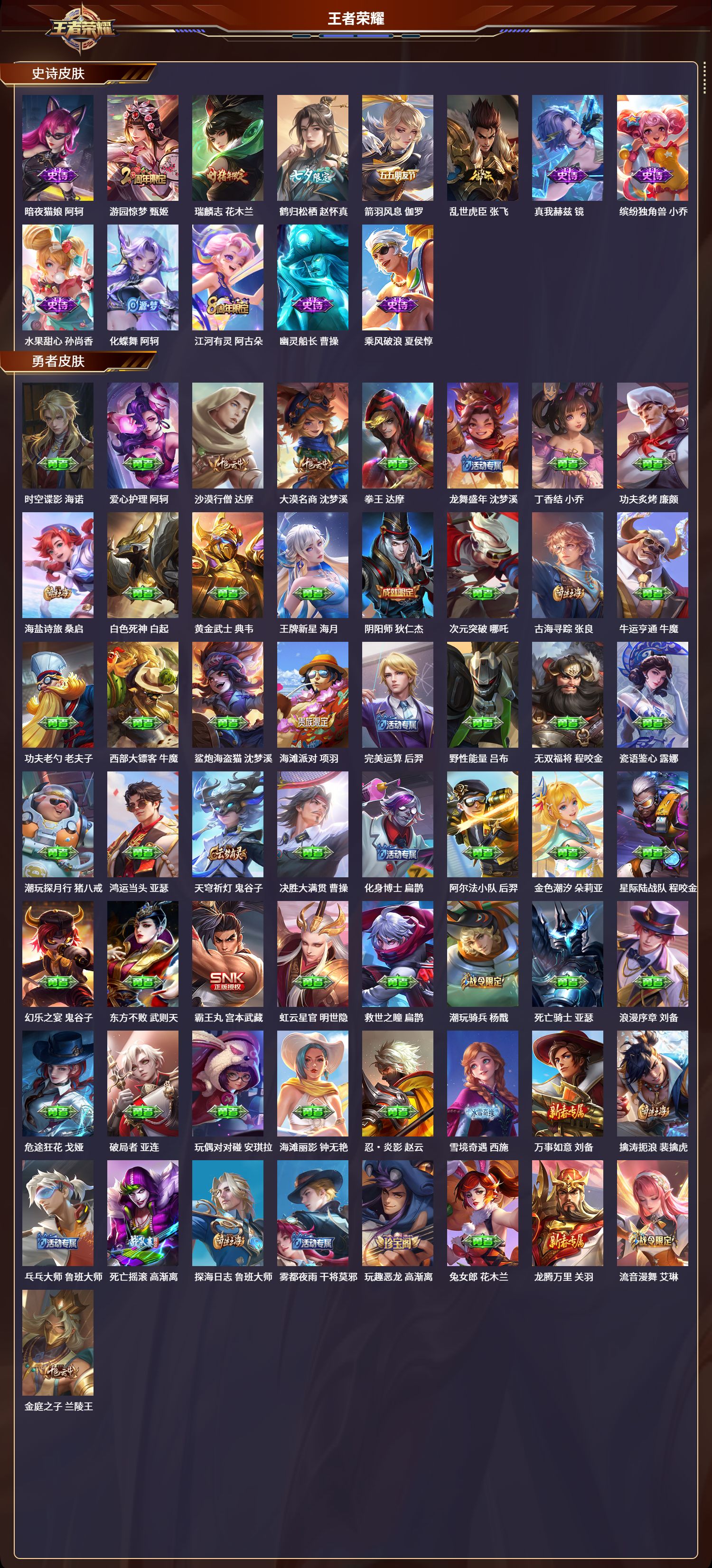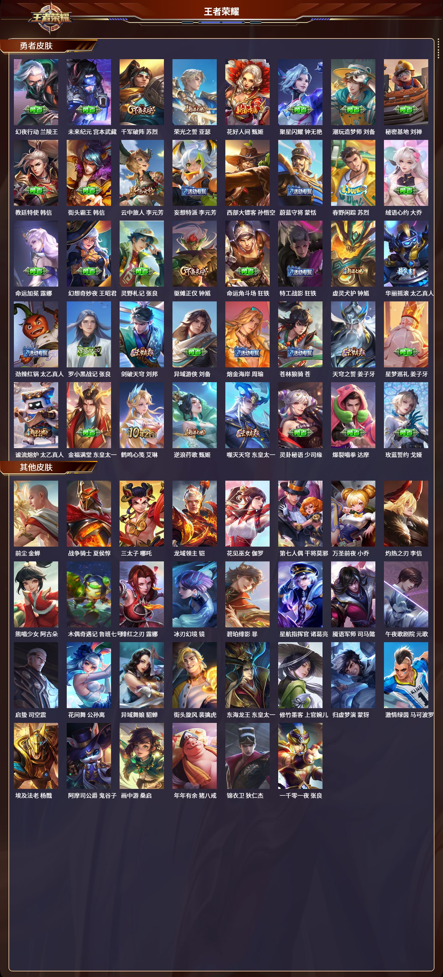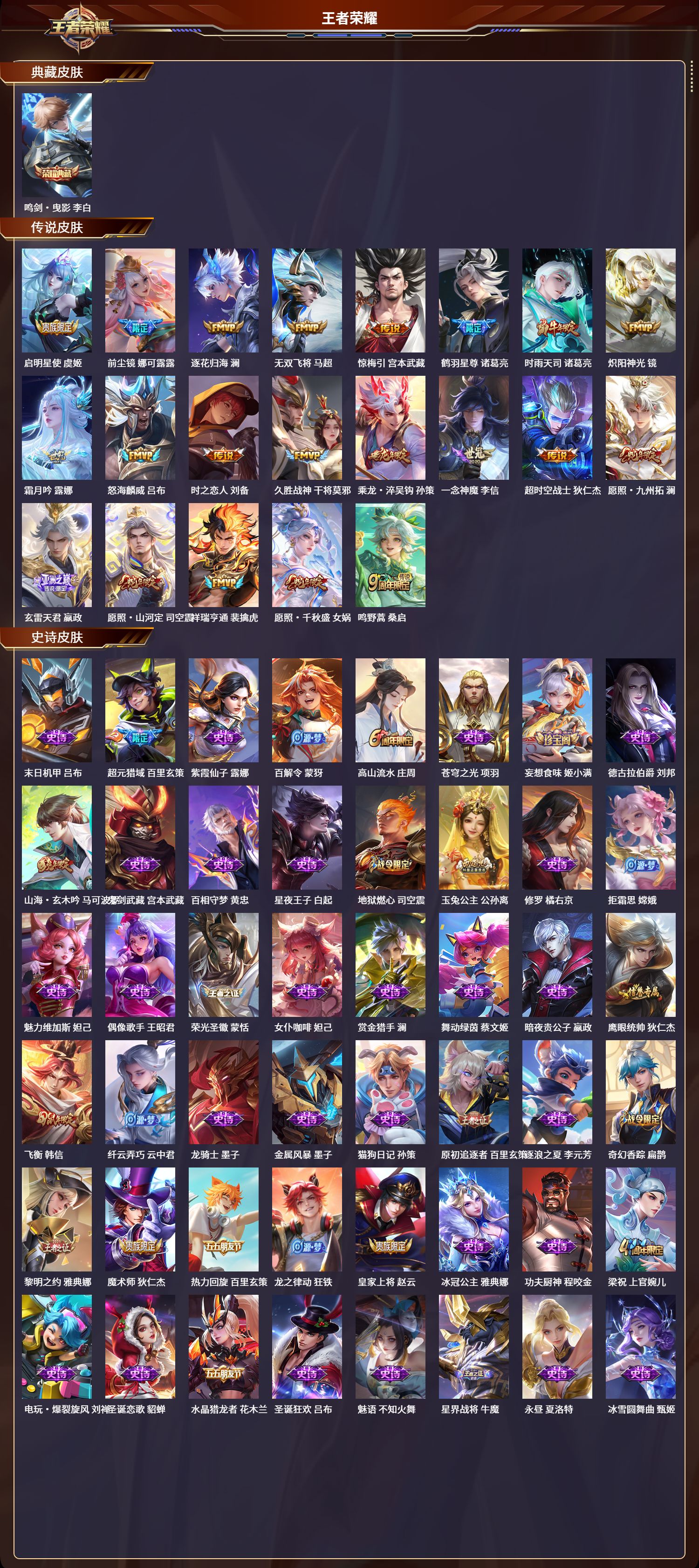 安卓微信/荣耀王者/229皮肤/126英雄/1典藏/0珍品无双/0无双/0珍品传说/21传说/61史诗/8稀有英雄【1 典藏皮肤】鸣剑·曳影 李白【21 传说皮肤】启明星使 虞姬前尘镜 娜可露露逐花归海 澜无双飞将 马超惊梅引 宫本武藏鹤羽星尊 诸葛亮时雨天司 诸葛亮炽阳神光 镜霜月吟 露娜怒海麟威 吕布时之恋人 刘备久胜战神 干将莫邪乘龙·淬吴钩 孙