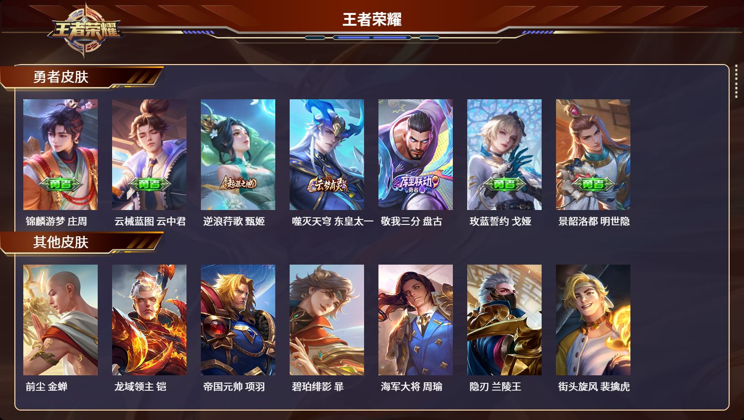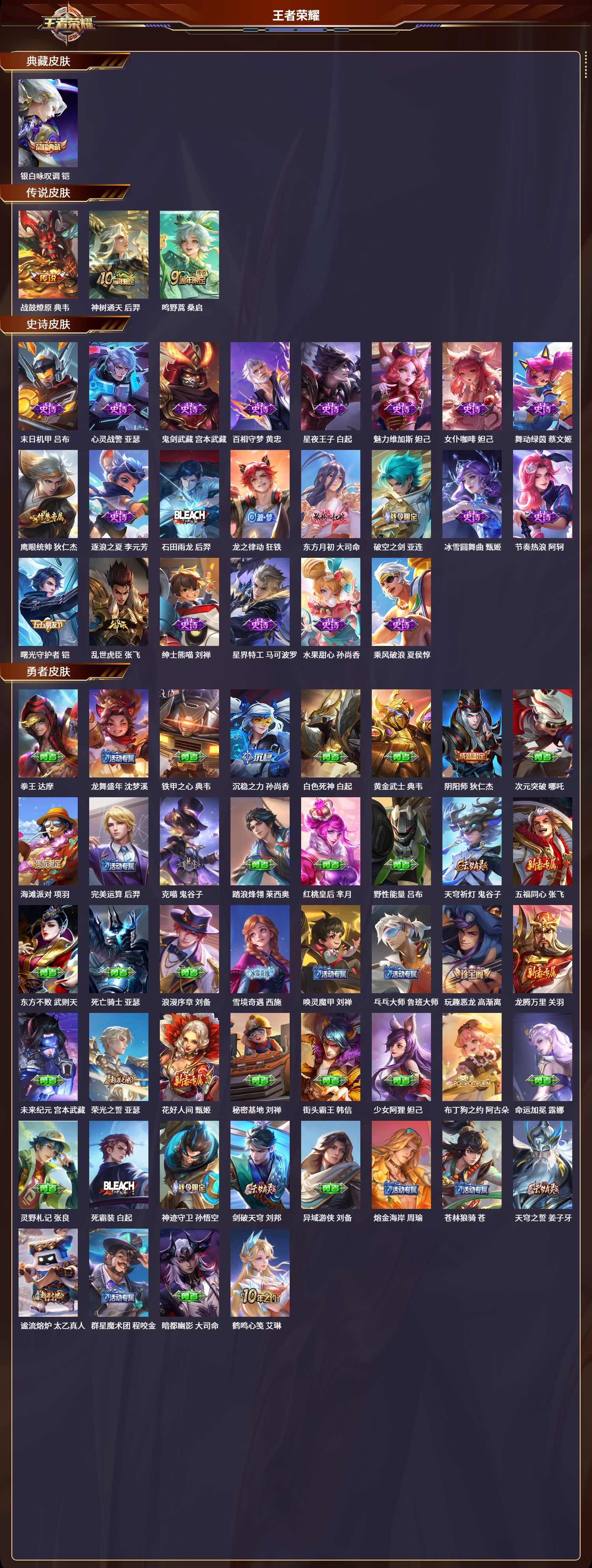 安卓qq/非凡王者/84皮肤/115英雄/1典藏/0珍品无双/0无双/0珍品传说/3传说/22史诗/6稀有英雄【1 典藏皮肤】银白咏叹调 铠【3 传说皮肤】战鼓燎原 典韦神树通天 后羿鸣野蒿 桑启【22 史诗皮肤】末日机甲 吕布心灵战警 亚瑟鬼剑武藏 宫本武藏百相守梦 黄忠星夜王子 白起魅力维加斯 妲己女仆咖啡 妲己舞动绿茵 蔡文姬鹰眼统帅 狄仁杰逐浪之夏 李元芳石田雨