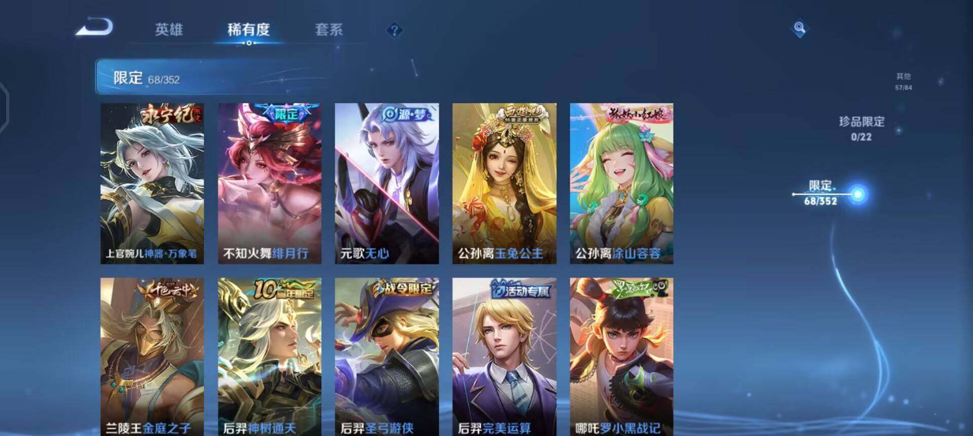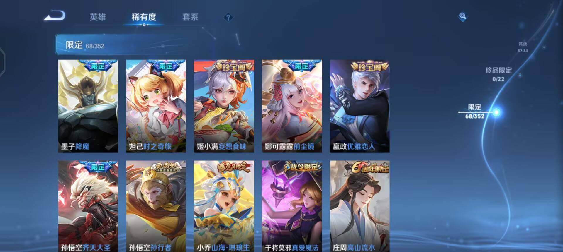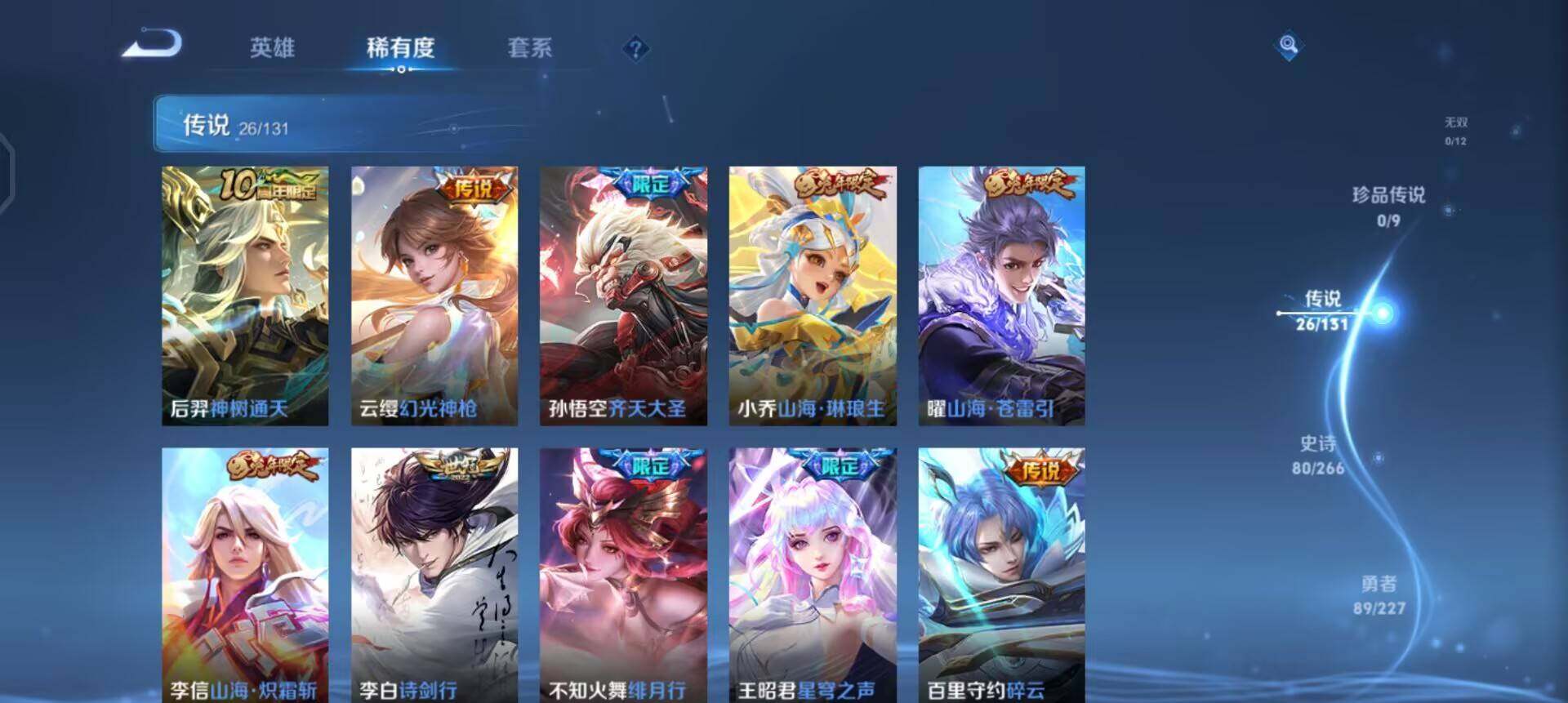 w11353 可立即换绑无需挂单养号 铭文满级 典藏1 传说26 按键9 天幕2 夺宝306 安卓q-v8-永恒钻石ii段位-126英雄-253皮肤-1典藏皮肤-26传说-79史诗 【英雄全皮】:李信全皮,影全皮 【荣耀典藏】:李白鸣剑曳影 【传说皮肤】:后羿神树通天,云缨幻光神呛,孙悟空齐天大圣,小乔山海琳琅生,曜山海苍雷引,李信山海炽霜斩,李白诗剑行,不知火舞绯月行,王