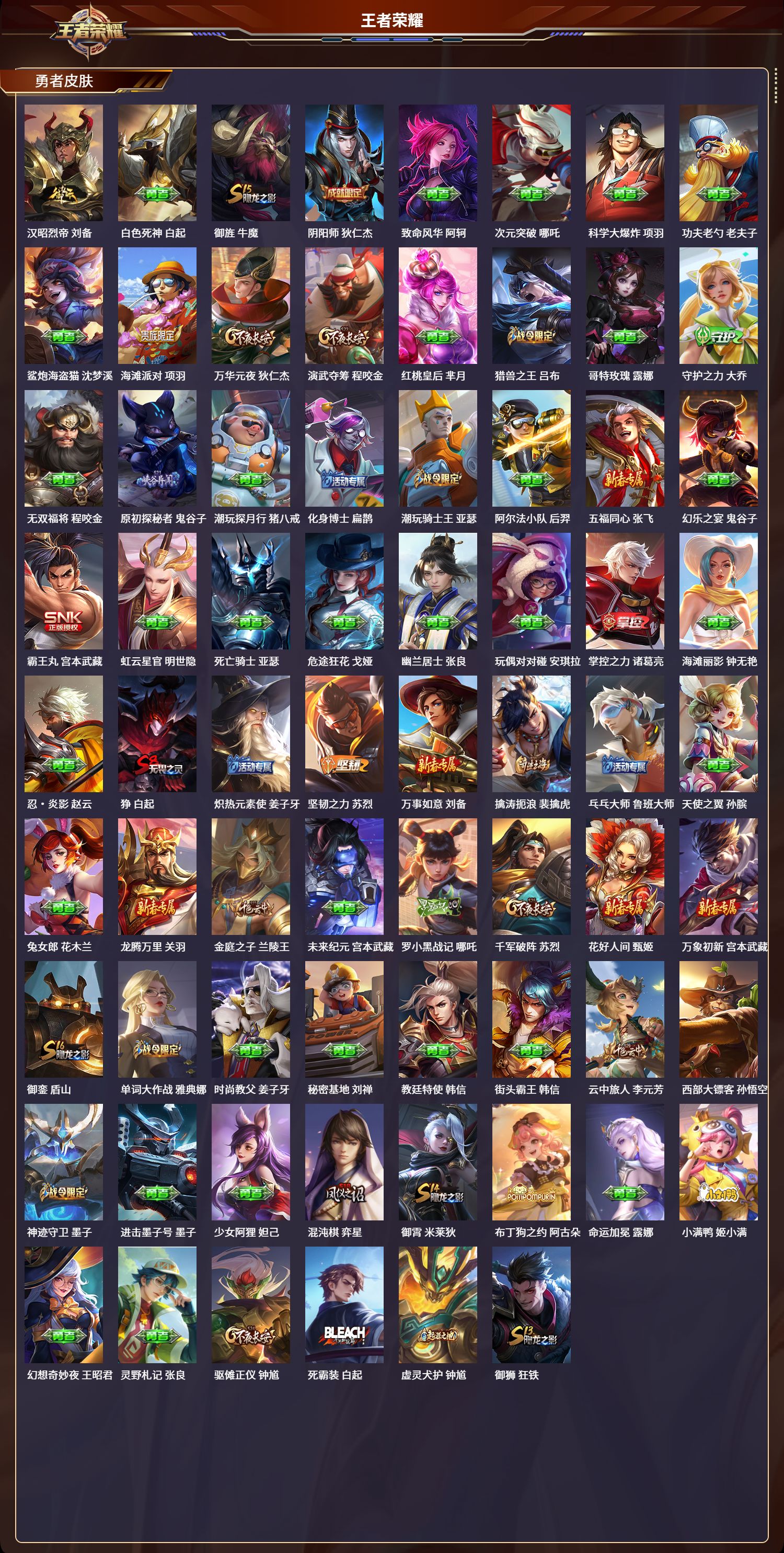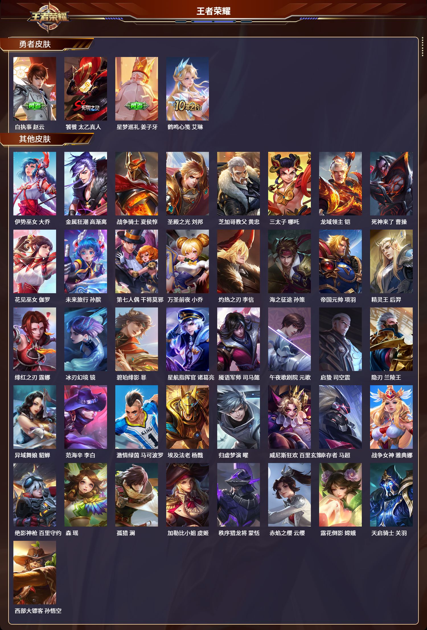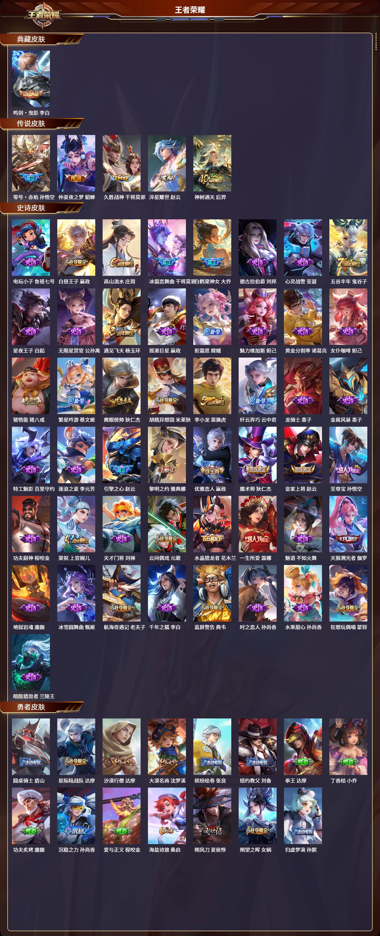 安卓qq/至尊星耀/185皮肤/126英雄/1典藏/0珍品无双/0无双/0珍品传说/5传说/49史诗/8稀有英雄【1 典藏皮肤】鸣剑·曳影 李白【5 传说皮肤】零号·赤焰 孙悟空仲夏夜之梦 貂蝉久胜战神 干将莫邪淬星耀世 赵云神树通天 后羿【49 史诗皮肤】电玩小子 鲁班七号白昼王子 嬴政高山流水 庄周冰霜恋舞曲 干将莫邪白鹤梁神女 大乔德古拉伯爵 刘邦心灵战警 亚瑟五谷