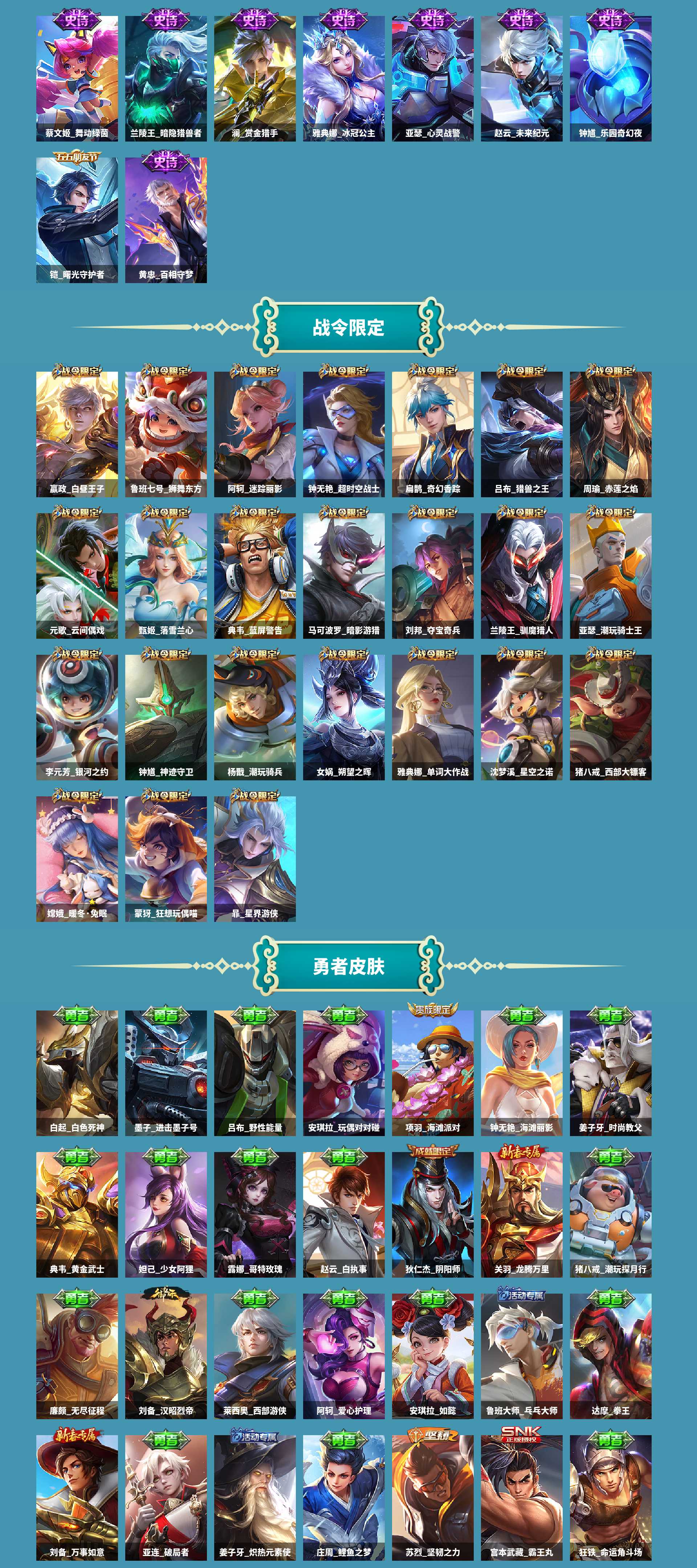 al634694 【特价v9苹果q夏侯惇无限飓风号传说皮肤:孙尚香异界灵契,李信一念神魔,虞姬启明星使,孙悟空零号赤焰,干将莫邪久胜战神,吕布天魔缭乱,李白凤求凰,貂蝉仲夏夜之梦,宫本武藏地狱之眼,铠曙光守护者,孙尚香末日机甲,武则天海洋之心,孙悟空地狱火】 皮肤数261 皮肤价值181388 传说皮肤数12 史诗皮肤数73 英雄数125 营地id411505875 贵族等级【文本】贵族9级 【贵族9级】 【可排位】 【是】 荣耀典藏1 内测皮肤1 年限皮肤5 限定皮肤74 赛季限定22 史诗皮肤73 战令限定24 勇者皮肤101 其他皮肤74 荣耀典藏:夏侯惇无限飓风号; 内测皮肤:艾琳女武神; 年限皮肤:李白凤求凰,王昭君凤凰于飞,铠青龙志,苏烈玄武志,百里守约朱雀志; 限定皮肤:鬼谷子克喵,太乙真人谧流熔炉,阿古朵江河有灵,张良古海寻踪,鲁班大师探海日志,扁鹊奇幻香踪,艾琳女武神,裴擒虎擒涛扼浪,杨戬潮玩骑兵,暃星界游侠,嫦娥暖冬兔眠,桑启海盐诗旅,元歌无心,钟无艳超时空战士,甄姬落雪兰心,孙尚香异界灵契,李元芳云中旅人,沈梦溪大漠名商,达摩沙漠行僧,花木兰青春决赛季,程咬金演武夺筹,元歌云间偶戏,亚瑟潮玩骑士王,狄仁杰万华元夜,虞姬启明星使,孙悟空零号赤焰,云中君纤云弄巧,雅典娜单词大作战,蒙犽狂想玩偶喵,裴擒虎李小龙,鬼谷子原初探秘者,马可波罗暗影游猎,老夫子醍醐杖,猪八戒西部大镖客,上官婉儿天狼绘梦者,刘邦夺宝奇兵,阿轲迷踪丽影,明世隐疑决卦,孙悟空至尊宝,吕布天魔缭乱,李元芳银河之约,弈星混沌棋,沈梦溪星空之诺,李白凤求凰,王昭君凤凰于飞,蔡文姬繁星吟游,兰陵王驯魔猎人,夏侯惇朔风刀,上官婉儿梁祝,周瑜赤莲之焰,鲁班七号狮舞东方,雅典娜神奇女侠,盾山御銮,钟馗神迹守卫,狄仁杰鹰眼统帅,裴擒虎天狼狩猎者,典韦蓝屏警告,女娲朔望之晖,牛魔御旌,嬴政白昼王子,吕布猎兽之王,米莱狄御霄,铠青龙志,苏烈玄武志,百里守约朱雀志,狄仁杰魔术师,孙悟空大圣娶亲,杨玉环遇见飞天,狄仁杰阴阳师,狂铁御狮,项羽海滩派对,赵云皇家上将,典韦穷奇,芈月重明; 赛季限定:甄姬逆浪荇歌,太乙真人谧流熔炉,张良古海寻踪,鲁班大师探海日志,裴擒虎擒涛扼浪,桑启海盐诗旅,李元芳云中旅人,沈梦溪大漠名商,达摩沙漠行僧,程咬金演武夺筹,狄仁杰万华元夜,鬼谷子原初探秘者,老夫子醍醐杖,明世隐疑决卦,弈星混沌棋,夏侯惇朔风刀,盾山御銮,牛魔御旌,米莱狄御霄,狂铁御狮,典韦穷奇,芈月重明; 史诗皮肤:嬴政摇滚巨星,黄忠百相守梦,妲己女仆咖啡,兰陵王暗隐猎兽者,阿古朵江河有灵,张飞乱世虎臣,扁鹊奇幻香踪,赵云未来纪元,暃星界游侠,元歌无心,孙尚香水果甜心,钟无艳超时空战士,雅典娜冰冠公主,钟馗乐园奇幻夜,澜赏金猎手,宫本武藏鬼剑武藏,廉颇地狱岩魂,花木兰青春决赛季,墨子金属风暴,亚瑟心灵战警,程咬金功夫厨神,元歌云间偶戏,云中君纤云弄巧,刘禅天才门将,甄姬冰雪圆舞曲,蒙犽狂想玩偶喵,裴擒虎李小龙,李元芳逐浪之夏,马可波罗暗影游猎,瑶遇见神鹿,墨子龙骑士,伽罗箭羽风息,上官婉儿天狼绘梦者,阿轲迷踪丽影,孙悟空至尊宝,李元芳银河之约,项羽苍穹之光,嬴政暗夜贵公子,安琪拉心灵骇客,娜可露露晚萤,王昭君凤凰于飞,刘邦德古拉伯爵,蔡文姬繁星吟游,兰陵王驯魔猎人,白起星夜王子,上官婉儿梁祝,夏侯惇乘风破浪,貂蝉圣诞恋歌,公孙离无限星赏官,鲁班七号狮舞东方,蔡文姬舞动绿茵,铠曙光守护者,吕布末日机甲,狄仁杰鹰眼统帅,诸葛亮黄金分割率,花木兰水晶猎龙者,曹操幽灵船长,裴擒虎天狼狩猎者,百里守约特工魅影,典韦蓝屏警