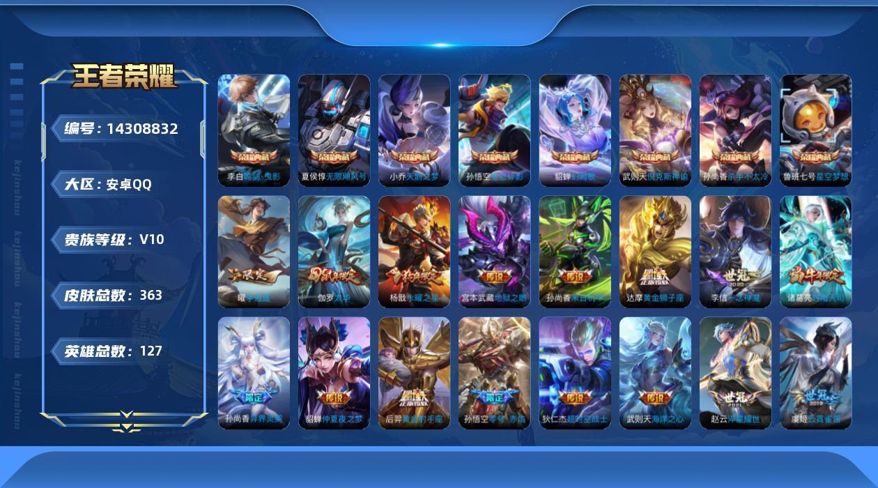 [14308832]贵族10 王者4星 安卓手q127区363皮8典藏20传说0无双v10 营地id211829221最强王者【荣耀典藏】:幻阙歌杀手不太冷天鹅之梦倪克斯神谕无限飓风号鸣剑·曳影全息碎影星空梦想【优质限定皮肤】:至尊宝【传说皮肤】:神树通天觅芳踪异界灵契黄金射手座淬星耀世海洋之心李 时雨天司启明星使零号·赤焰一念神魔地狱之眼永曜之星