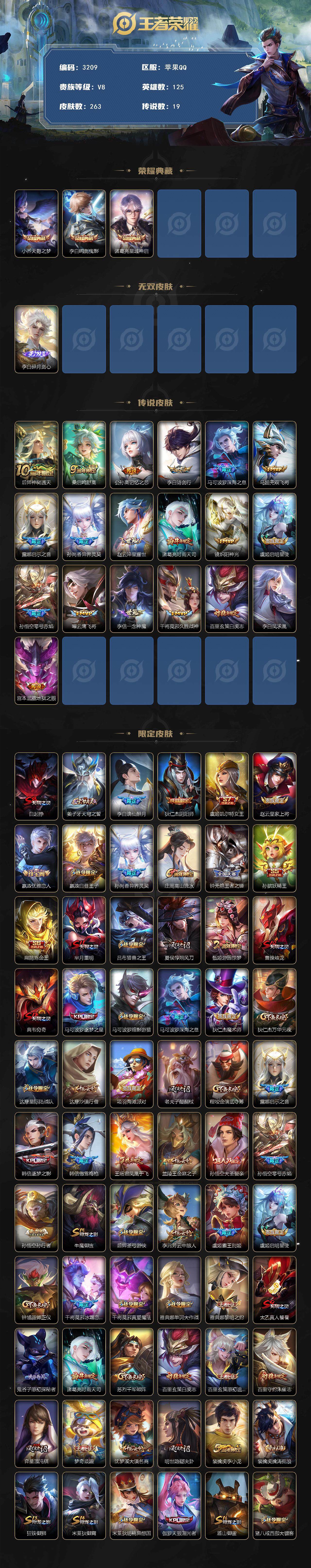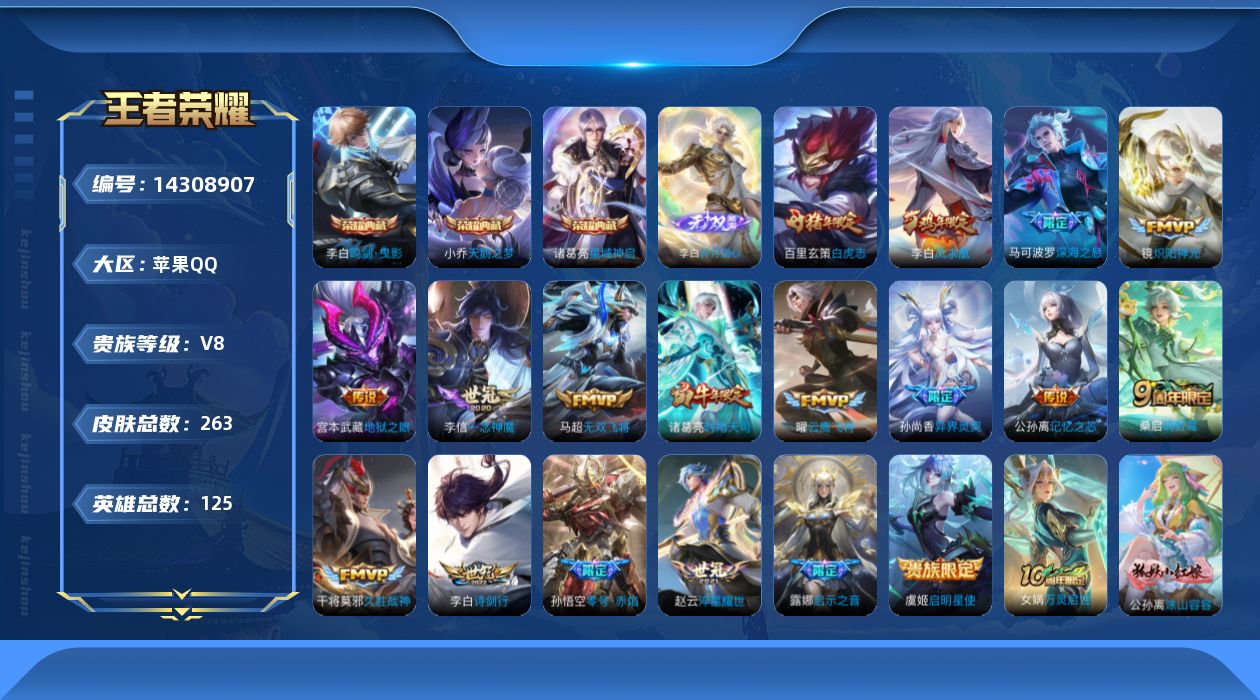 [14308907]苹果q-v7-最强王者段位-125英雄-263皮肤-3典藏皮肤-1无双-19传说-66史诗 【英雄全皮】:李白全皮 【荣耀典藏】:小乔天鹅之梦,李白鸣剑曳影,诸葛亮星域神启 【无双皮肤】:李白碎月剑心 【传说皮肤】:后羿神树通天,桑启鸣野蒿,公孙离记忆之芯,李白诗剑行,马可波罗深海之息,马超无双飞将,露娜启示之音,孙尚香异界灵契,赵云淬星耀世,诸葛亮时雨天司,镜炽阳神光,虞姬启明星使,孙悟空零号赤焰,曜云鹰飞将,李信一念神魔,干将莫邪久胜战神,百里玄策白虎志,李白凤求凰,宫本武藏地狱之眼 【限定皮肤】:白起狰,姜子牙天穹之誓,李白谪仙醉月,狄仁杰阴阳师,虞姬凯尔特女王,赵云皇家上将,嬴政优雅恋人,嬴政白昼王子,孙尚香异界灵契,庄周高山流水,钟无艳王者之锤,孙膑妖精王,扁鹊炼金王,芈月重明,吕布猎兽之王,夏侯惇朔风刀,甄姬游园惊梦,曹操烛龙,典韦穷奇,马可波罗逐梦之星,马可波罗暗影游猎,马可波罗深海之息,狄仁杰魔术师,狄仁杰万华元夜,达摩星际陆战队,达摩沙漠行僧,项羽海滩派对,老夫子醍醐杖,程咬金演武夺筹,露娜启示之音,韩信逐梦之影,韩信傲雪梅呛,王昭君凤凰于飞,兰陵王金庭之子,孙悟空大圣娶亲,孙悟空零号赤焰,孙悟空孙行者,牛魔御旌,后羿圣弓游侠,李元芳云中旅人,虞姬霸王别姬,虞姬启明星使,钟馗驱傩正仪,干将莫邪冰霜恋舞曲,干将莫邪真爱魔法,雅典娜单词大作战,雅典娜黎明之约,太乙真人饕餮,鬼谷子原初探秘者,诸葛亮时雨天司,苏烈千军破阵,百里玄策白虎志,百里玄策原初追逐者,百里守约朱雀志,弈星混沌棋,梦奇顽趣,沈梦溪大漠名商,明世隐疑决卦,裴擒虎李小龙,裴擒虎擒涛扼浪,狂铁御狮,米莱狄御霄,米莱狄胡桃异想国,伽罗天狼溯光者,盾山御銮,猪八戒西部大镖客,蒙犽狂想玩偶喵,鲁班大师探海日志,桑启海盐诗旅,艾琳女武神,张良古海寻踪,鬼谷子天穹祈灯,李白碎月剑心,鲁班七号蔬乡物语,李元芳蔬乡物语,刘邦剑破天穹 【年限皮肤】:百里玄策白虎志,百里守约朱雀志,王昭君凤凰于飞,李白凤求凰,诸葛亮时雨天司,马超神威 【赛季限定】:孙膑妖精王,扁鹊炼金王,白起狰,芈月重明,夏侯惇朔风刀,曹操烛龙,典韦穷奇,狄仁杰万华元夜,达摩沙漠行僧,老夫子醍醐杖,程咬金演武夺筹,兰陵王金庭之子,张良古海寻踪,牛魔御旌,李元芳云中旅人,虞姬凯尔特女王,钟馗驱傩正仪,雅典娜黎明之约,太乙真人饕餮,鬼谷子原