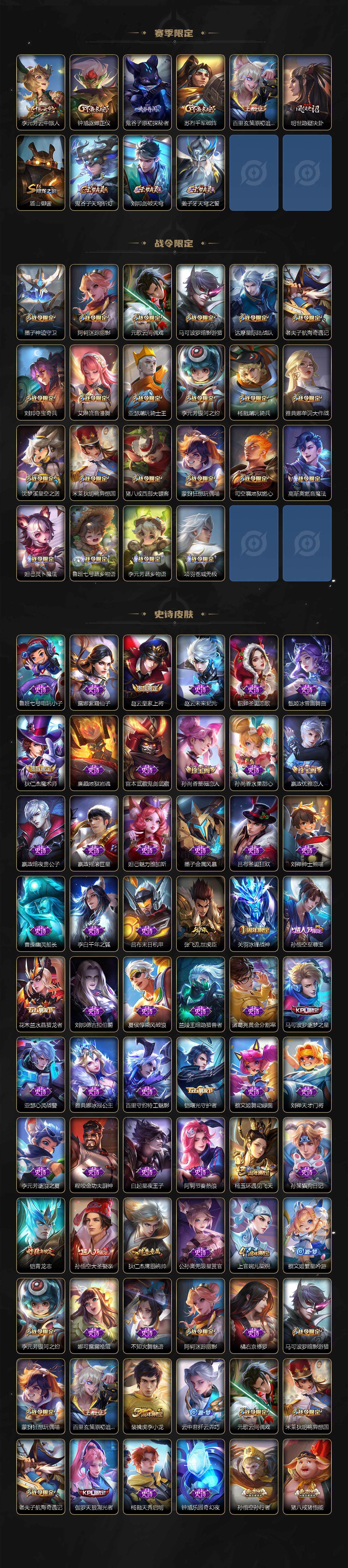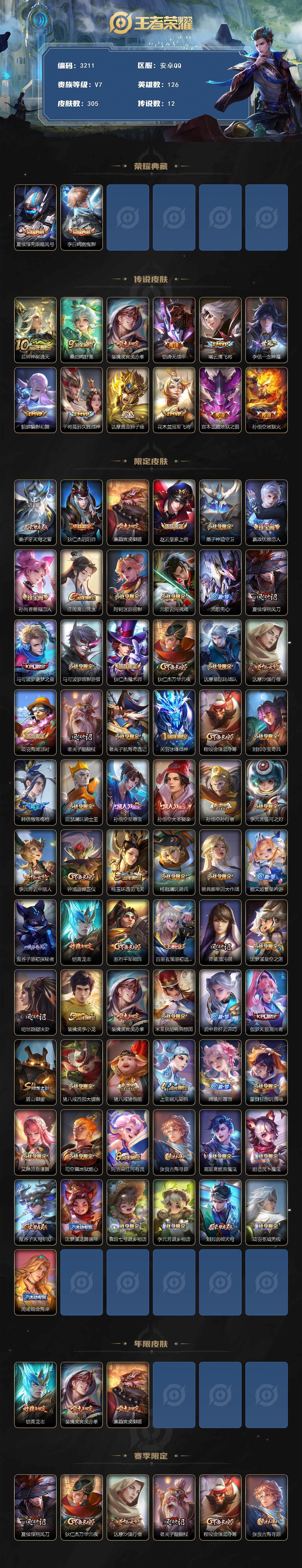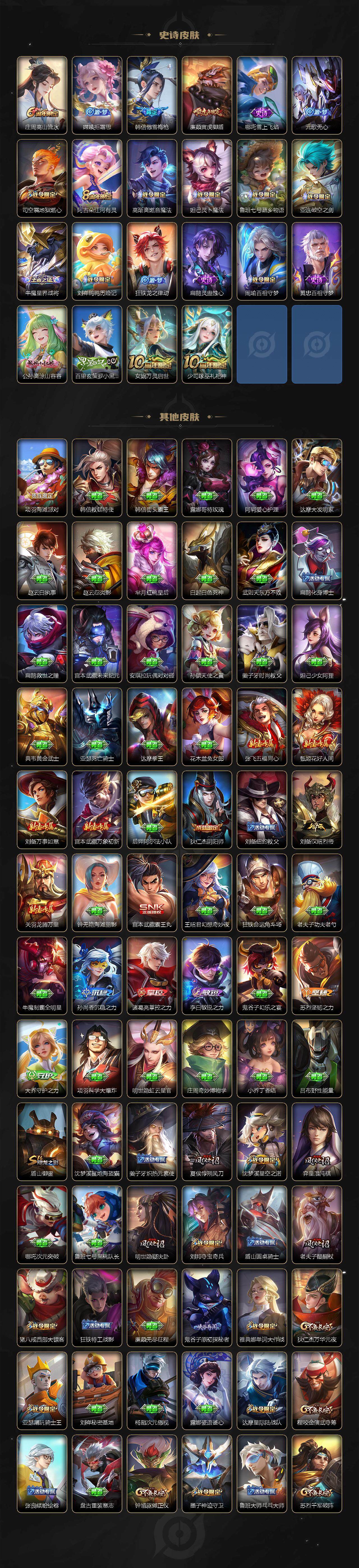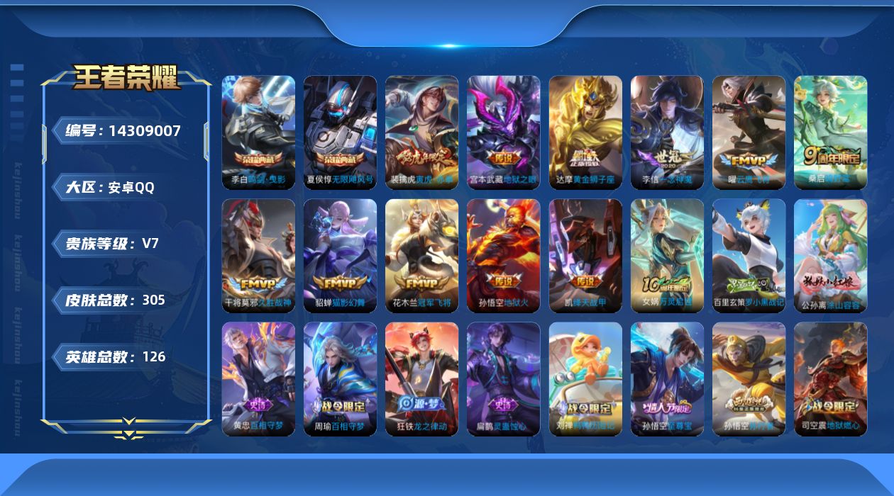 [14309007]安卓q-v7-最强王者段位-126英雄-305皮肤-2典藏皮肤-12传说-87史诗 【英雄全皮】:达摩全皮,刘邦全皮,猪八戒全皮,影全皮 【荣耀典藏】:夏侯惇无限飓风号,李白鸣剑曳影 【传说皮肤】:后羿神树通天,桑启鸣野蒿,裴擒虎寅虎赤拳,铠绛天战甲,曜云鹰飞将,李信一念神魔,貂蝉猫影幻舞,干将莫邪久胜战神,达摩黄金狮子座,花木兰冠军飞将,宫本武藏地狱之眼,孙悟空地狱火 【限定皮肤】:姜子牙天穹之誓,狄仁杰阴阳师,廉颇寅虎御盾,赵云皇家上将,墨子神迹守卫,嬴政优雅恋人,孙尚香蔷薇恋人,庄周高山流水,阿轲迷踪丽影,元歌云间偶戏,元歌无心,夏侯惇朔风刀,马可波罗逐梦之星,马可波罗暗影游猎,狄仁杰魔术师,狄仁杰万华元夜,达摩星际陆战队,达摩沙漠行僧,项羽海滩派对,老夫子醍醐杖,老夫子航海奇遇记,关羽冰锋战神,程咬金演武夺筹,刘邦夺宝奇兵,韩信傲雪梅呛,亚瑟潮玩骑士王,孙悟空至尊宝,孙悟空大圣娶亲,孙悟空孙行者,李元芳银河之约,李元芳云中旅人,钟馗驱傩正仪,杨玉环遇见飞天,杨戬潮玩骑兵,雅典娜单词大作战,蔡文姬繁星吟游,鬼谷子原初探秘者,铠青龙志,苏烈千军破阵,百里玄策原初追逐者,弈星混沌棋,沈梦溪星空之诺,明世隐疑决卦,裴擒虎李小龙,裴擒虎寅虎赤拳,米莱狄胡桃异想国,云中君纤云弄巧,伽罗天狼溯光者,盾山御銮,猪八戒西部大镖客,猪八戒猪悟能,上官婉儿梁祝,嫦娥拒霜思,蒙犽狂想玩偶喵,艾琳流音漫舞,司空震地狱燃心,阿古朵江河有灵,张良古海寻踪,高渐离燃音魔法,妲己灵卜魔法,鬼谷子天穹祈灯,沈梦溪龙舞盛年,鲁班七号蔬乡物语,李元芳蔬乡物语,刘邦剑破天穹,项羽苍威无极,周瑜熔金海岸 【年限皮肤】:铠青龙志,裴擒虎寅虎赤拳,廉颇寅虎御盾 【赛季限定】:夏侯惇朔风刀,狄仁杰万华元夜,达摩沙漠行僧,老夫子醍醐杖,程咬金演武夺筹,张良古海寻踪,李元芳云中旅人,钟馗驱傩正仪,鬼谷子原初探秘者,苏烈千军破阵,百里玄策原初追逐者,弈星混沌棋,明世隐疑决卦,盾山御銮,鬼谷子天穹祈灯,刘邦剑破天穹,姜子牙天穹之誓 【战令限定】:墨子神迹守卫,阿轲迷踪丽影,元歌云间偶戏,马可波罗暗影游猎,达摩星际陆战队,老夫子航海奇遇记,刘邦夺宝奇兵,艾琳流音漫舞,亚瑟潮玩骑士王,李元芳银河之约,杨戬潮玩骑兵,雅典娜单词大作战,沈梦溪星空之诺,米莱狄胡桃异想国,猪八戒西部大镖客,蒙犽狂想玩偶喵,司空震地狱燃心,高