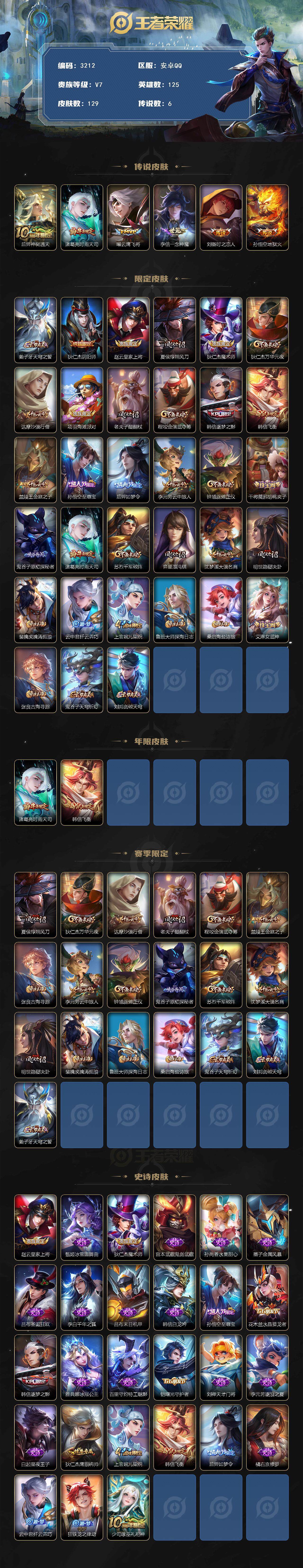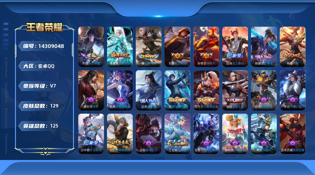 [14309048]安卓q-v7-最强王者段位-125英雄-129皮肤-6传说-27史诗 【传说皮肤】:后羿神树通天,诸葛亮时雨天司,曜云鹰飞将,李信一念神魔,刘备时之恋人,孙悟空地狱火 【限定皮肤】:姜子牙天穹之誓,狄仁杰阴阳师,赵云皇家上将,夏侯惇朔风刀,狄仁杰魔术师,狄仁杰万华元夜,达摩沙漠行僧,项羽海滩派对,老夫子醍醐杖,程咬金演武夺筹,韩信逐梦之影,韩信飞衡,兰陵王金庭之子,孙悟空至尊宝,后羿如梦令,李元芳云中旅人,钟馗驱傩正仪,干将莫邪胡桃夹子,鬼谷子原初探秘者,诸葛亮时雨天司,苏烈千军破阵,弈星混沌棋,沈梦溪大漠名商,明世隐疑决卦,裴擒虎擒涛扼浪,云中君纤云弄巧,上官婉儿梁祝,鲁班大师探海日志,桑启海盐诗旅,艾琳女武神,张良古海寻踪,鬼谷子天穹祈灯,刘邦剑破天穹 【年限皮肤】:诸葛亮时雨天司,韩信飞衡 【赛季限定】:夏侯惇朔风刀,狄仁杰万华元夜,达摩沙漠行僧,老夫子醍醐杖,程咬金演武夺筹,兰陵王金庭之子,张良古海寻踪,李元芳云中旅人,钟馗驱傩正仪,鬼谷子原初探秘者,苏烈千军破阵,弈星混沌棋,沈梦溪大漠名商,明世隐疑决卦,裴擒虎擒涛扼浪,鲁班大师探海日志,桑启海盐诗旅,鬼谷子天穹祈灯,刘邦剑破天穹,姜子牙天穹之誓 【史诗皮肤】:赵云皇家上将,甄姬冰雪圆舞曲,狄仁杰魔术师,宫本武藏鬼剑武藏,孙尚香水果甜心,墨子金属风暴,吕布圣诞狂欢,李白千年之狐,吕布末日机甲,韩信白龙吟,孙悟空至尊宝,花木兰水晶猎龙者,韩信逐梦之影,雅典娜冰冠公主,百里守约特工魅影,铠曙光守护者,刘禅天才门将,李元芳逐浪之夏,白起星夜王子,狄仁杰鹰眼统帅,上官婉儿梁祝,韩信飞衡,后羿如梦令,橘右京修罗,云中君纤云弄巧,狂铁龙之律动,少司缘巫礼祀神 【其他皮肤】:项羽海滩派对,韩信教廷特使,韩信街头霸王,露娜哥特玫瑰,达摩大发明家,赵云忍炎影,艾琳女武神,白起白色死神,牛魔西部大镖客,扁鹊化身博士,安琪拉玩偶对对碰,孙膑天使之翼,妲己少女阿狸,典韦黄金武士,亚瑟死亡骑士,达摩拳王,花木兰兔女郎,甄姬花好人间,宫本武藏万象初新,狄仁杰阴阳师,刘备纽约教父,关羽龙腾万里,钟无艳海滩丽影,宫本武藏霸王丸,狂铁命运角斗场,老夫子功夫老勺,孙尚香沉稳之力,苏烈坚韧之力,明世隐虹云星官,吕布野性能量,孙膑归虚梦演,沈梦溪鲨炮海盗猫,姜子牙炽热元素使,夏侯惇朔风刀,弈星混沌棋,哪吒次元突破,明世隐疑决卦,老夫子醍醐杖,狂