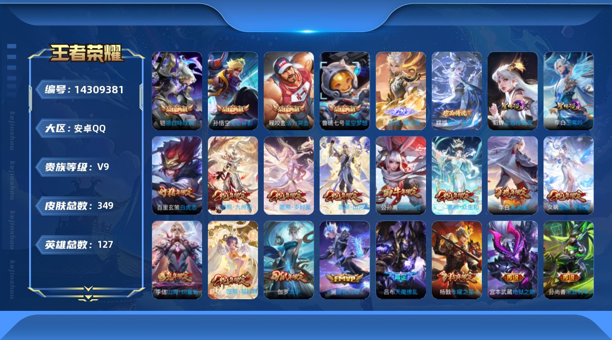 [14309381]差26876点卷升级v10,v9-127英雄-349皮肤-4典藏-1无双-1珍品传说-35传说-101史诗,积分夺宝241抽 金标狄仁杰李白,星币2900,cc8380, 【英雄全皮】:李信全皮,蒙恬全皮,影全皮 【荣耀典藏】:孙悟空全息碎影,鲁班七号星空梦想,程咬金活力突击,铠银白咏叹调 【无双皮肤】:曜器灵螭龙剑 【珍品传说】:嫦娥器灵落星盏 【传说皮肤】:后羿神树通天,司空震愿照山河定,女娲愿照千秋盛,妲己愿照众生和,澜愿照九州拓,蔡文姬愿照福禄聚,虞姬愿照岁时盈,桑启鸣野蒿,澜逐花归海,孙悟空齐天大圣,李信山海炽霜斩,王昭君星穹之声,百里守约碎云,孙尚香音你闪耀,马超无双飞将,赵云淬星耀世,公孙离祈雪灵祝,虞姬启明星使,关羽武圣,李信一念神魔,伽罗太华,干将莫邪久胜战神,虞姬云霓雀翎,达摩黄金狮子座,百里玄策白虎志,梦奇胖达荣荣,后羿黄金射手座,杨戬永曜之星,貂蝉仲夏夜之梦,李白凤求凰,孙尚香末日机甲,宫本武藏地狱之眼,孙悟空地狱火,吕布天魔缭乱,狄仁杰超时空战士 【限定皮肤】:蒙犽顽岩魄,姜子牙天穹之誓,狄仁杰阴阳师,赵云皇家上将,赵云引擎之心,赵云龙胆,妲己时之彼端,孙尚香蔷薇恋人,庄周云端筑梦师,庄周玄嵩,高渐离玩趣恶龙,阿轲迷踪丽影,钟无艳超时空战士,吕布天魔缭乱,吕布猎兽之王,吕布御风骁将,夏侯惇朔风刀,甄姬幽恒,甄姬落雪兰心,典韦蓝屏警告,典韦岱宗,马可波罗暗影游猎,马可波罗山海玄木吟,狄仁杰魔术师,狄仁杰万华元夜,达摩沙漠行僧,项羽海滩派对,老夫子醍醐杖,关羽武圣,刘邦夺宝奇兵,韩信飞衡,王昭君凤凰于飞,王昭君午后时光,王昭君星穹之声,兰陵王金庭之子,孙悟空美猴王,孙悟空至尊宝,孙悟空大圣娶亲,孙悟空孙行者,孙悟空齐天大圣,后羿辉光之辰,后羿如梦令,张飞虎魄,李元芳银河之约,李元芳云中旅人,虞姬启明星使,钟馗驱傩正仪,杨戬永曜之星,女娲朔望之晖,雅典娜单词大作战,雅典娜黎明之约,蔡文姬繁星吟游,鬼谷子原初探秘者,鬼谷子五谷丰年,黄忠烈魂,苏烈千军破阵,百里玄策白虎志,百里玄策原初追逐者,百里守约朱雀志,弈星混沌棋,梦奇顽趣,公孙离祈雪灵祝,公孙离玉兔公主,沈梦溪星空之诺,沈梦溪大漠名商,明世隐疑决卦,裴擒虎天狼狩猎者,裴擒虎李小龙,裴擒虎擒涛扼浪,狂铁电玩高手,云中君纤云弄巧,李信山海炽霜斩,伽罗太华,猪八戒西部大镖客,上官婉儿天狼绘梦者,