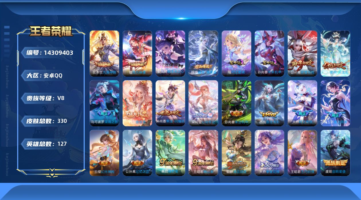 [14309403]v8-330皮肤-2典藏-2珍品传说-21传说-98史诗,ll5402 【英雄全皮】:朵莉亚全皮,大乔全皮,嫦娥全皮,西施全皮,蒙恬全皮,阿古朵全皮,海诺全皮 【荣耀典藏】:花木兰九霄神辉,瑶拾光映像 【珍品传说】:嫦娥器灵落星盏,安琪拉酷洛米之心 【传说皮肤】:后羿神树通天,西施续相思,杨玉环星之鸣奏,妲己愿照众生和,云缨幻光神呛,王昭君映山客,桑启鸣野蒿,朵莉亚心动手记,孙尚香乘龙问璇玑,大乔时之奇旅,公孙离记忆之芯,马可波罗深海之息,大乔挚爱花嫁,蔡文姬花朝如约,貂蝉遇见胡旋,王昭君乞巧织情,西施游龙清影,周瑜音你心动,公孙离祈雪灵祝,虞姬启明星使,孙尚香末日机甲 【限定皮肤】:蒙犽顽岩魄,蔡文姬夏日便利店,大乔绒语心约,虞姬夏日便利店,姜子牙天穹之誓,狄仁杰阴阳师,赵云皇家上将,墨子神迹守卫,孙尚香蔷薇恋人,庄周高山流水,芈月白晶晶,芈月幻夜卜梦,甄姬游园惊梦,马可波罗暗影游猎,马可波罗深海之息,狄仁杰魔术师,达摩沙漠行僧,项羽海滩派对,老夫子航海奇遇记,貂蝉遇见胡旋,兰陵王金庭之子,后羿圣弓游侠,李元芳银河之约,李元芳云中旅人,虞姬启明星使,钟馗驱傩正仪,杨玉环遇见飞天,杨玉环寅虎心曲,女娲朔望之晖,干将莫邪真爱魔法,雅典娜黎明之约,鬼谷子五谷丰年,大乔白鹤梁神女,大乔挚爱花嫁,大乔时之奇旅,苏烈千军破阵,梦奇顽趣,公孙离祈雪灵祝,公孙离玉兔公主,沈梦溪大漠名商,裴擒虎擒涛扼浪,云中君纤云弄巧,上官婉儿梁祝,嫦娥如梦令,嫦娥拒霜思,嫦娥暖冬兔眠,西施玲珑珍味,西施至美乘鲤谣,鲁班大师探海日志,镜匿光追影者,桑启海盐诗旅,戈娅驭风魔法,艾琳女武神,阿古朵江河有灵,张良古海寻踪,蒙犽百解令,蒙恬荣光圣徽,高渐离燃音魔法,妲己灵卜魔法,鬼谷子天穹祈灯,伽罗琥珀纪元,大乔乘龙忆丹青,安琪拉乘龙聚宝船,孙尚香乘龙问璇玑,沈梦溪龙舞盛年,鲁班七号蔬乡物语,李元芳蔬乡物语,刘邦剑破天穹,上官婉儿群星魔术团,程咬金群星魔术团,镜青焰无极,项羽苍威无极,朵莉亚心动手记,海诺心动手记,刘备异域游侠,芈月浮光幕影,周瑜熔金海岸 【年限皮肤】:杨玉环寅虎心曲,公孙离祈雪灵祝,大乔乘龙忆丹青,安琪拉乘龙聚宝船,孙尚香乘龙问璇玑 【赛季限定】:达摩沙漠行僧,兰陵王金庭之子,张良古海寻踪,李元芳云中旅人,钟馗驱傩正仪,雅典娜黎明之约,苏烈千军破阵,梦奇顽趣,沈梦溪大漠名商,裴擒虎擒涛