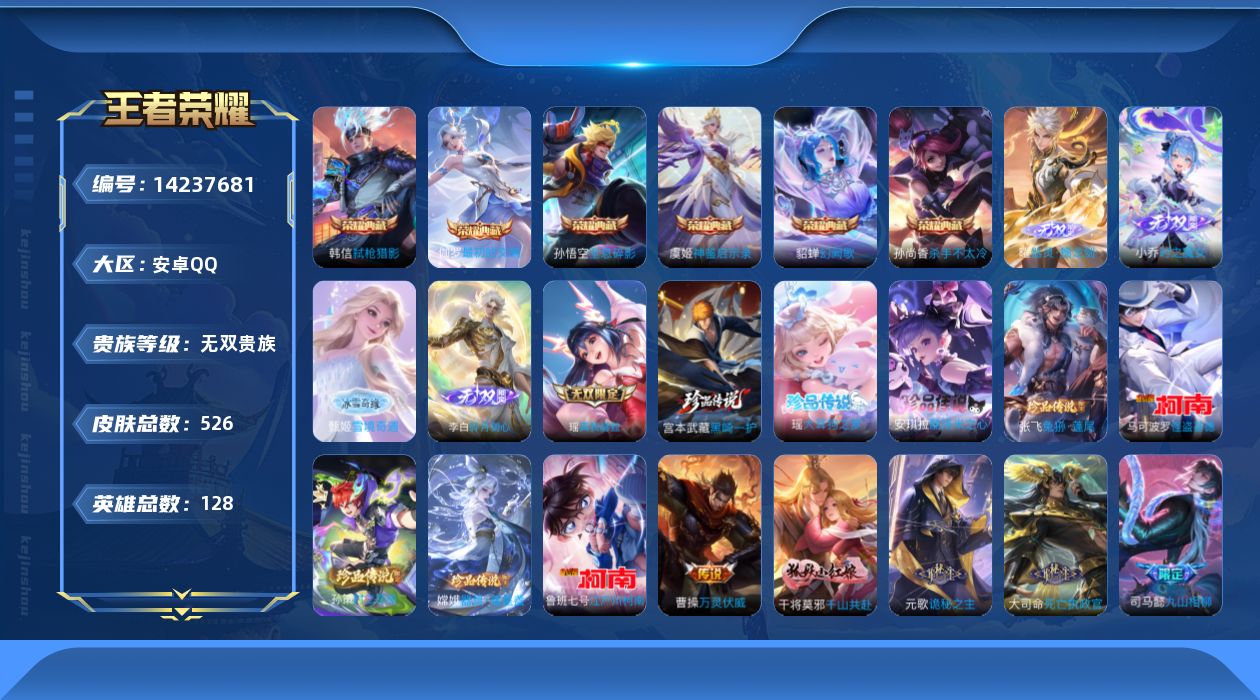 128英雄-526皮肤-无双贵族 6典藏 5无双 8珍品传说 63传说 128英雄 526皮肤 典藏英雄武则天 可修改实名 【英雄全皮】:百里守约全皮司空震全皮阿轲全皮大司命全皮澜全皮孙悟空全皮马超全皮少司缘全皮海诺全皮姜子牙全皮刘禅全皮盾山全皮狂铁全皮刘邦全皮宫本武藏全皮司马懿全皮达摩全