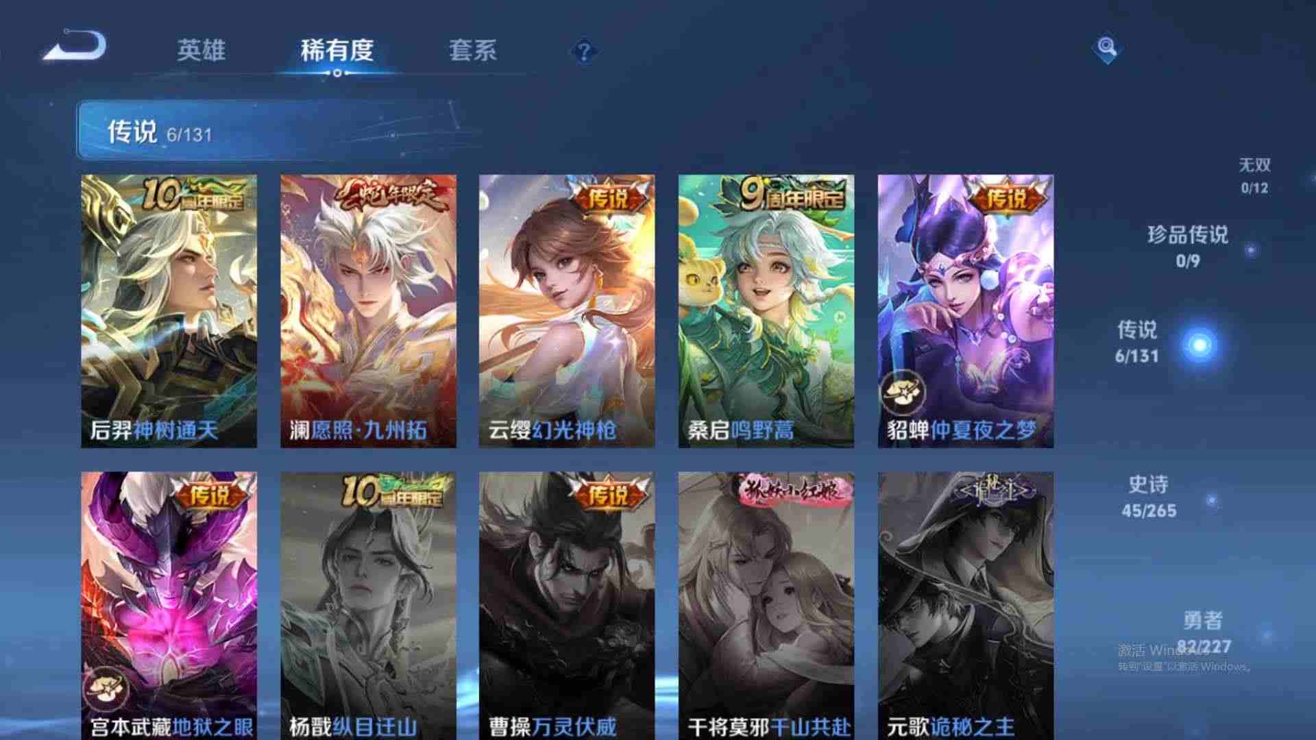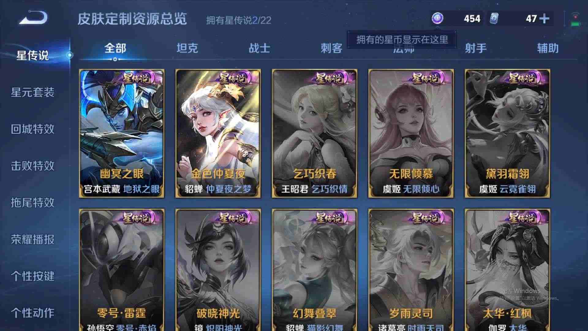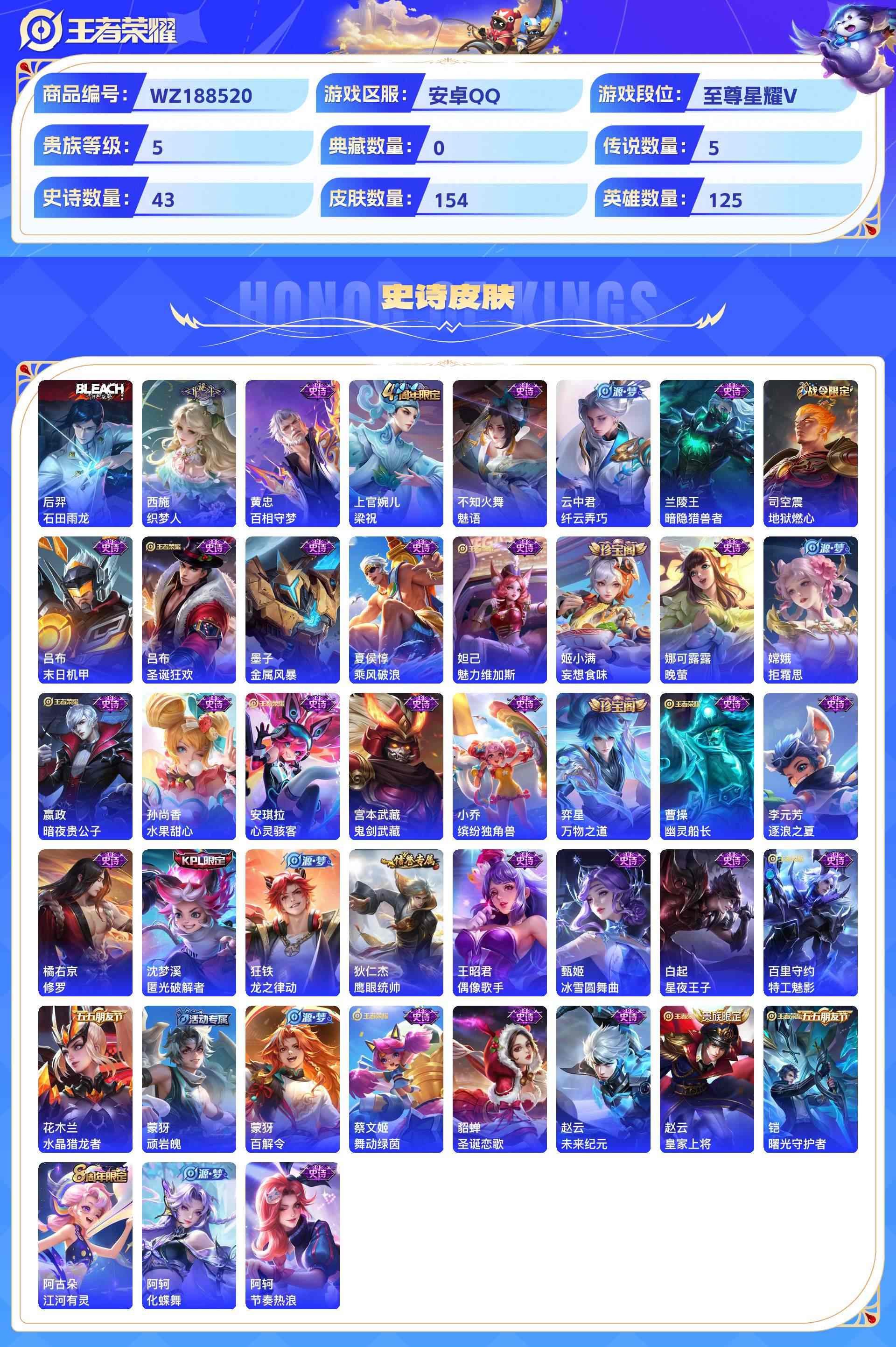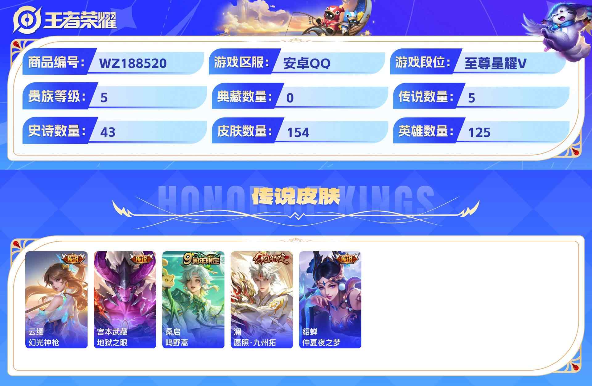 wz188520|精品号【传说皮肤】幻光神呛地狱之眼鸣野蒿愿照·九州拓仲夏夜之梦安卓qq 贵族5级 154皮 5传说 43史诗2星传说7个性按键
